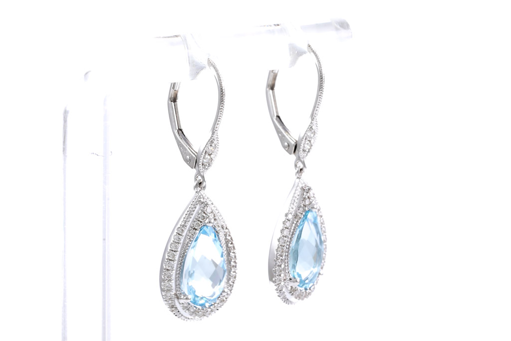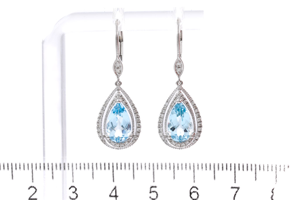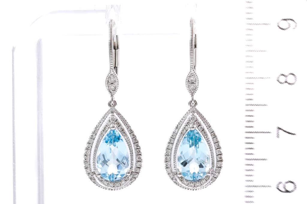Aquamarine and Diamond leverback earrings with pear shape Aquamarines totalling 2.72cts and round Diamonds totalling 0.32cts (Estimated grading: H SI). 14ct white gold. Weight: 3.8g. (New)