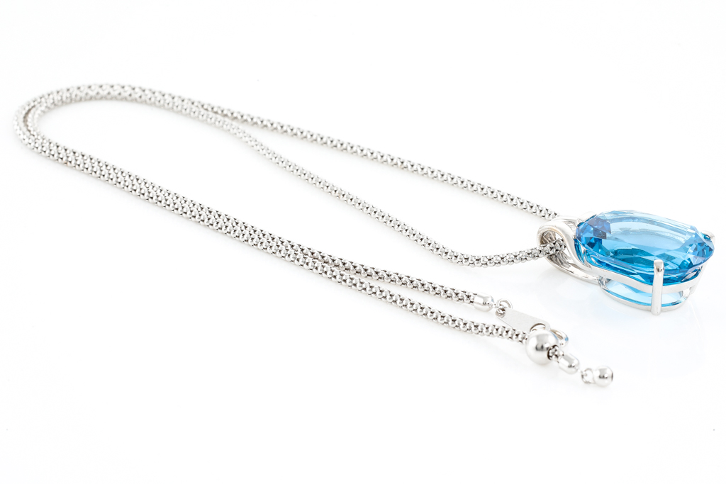 Topaz pendant with oval shape blue Topaz of 27.34ct. 18ct white gold with 51cm 18ct white gold adjustable chain. Weight: 16.7g. (Pre-owned)
