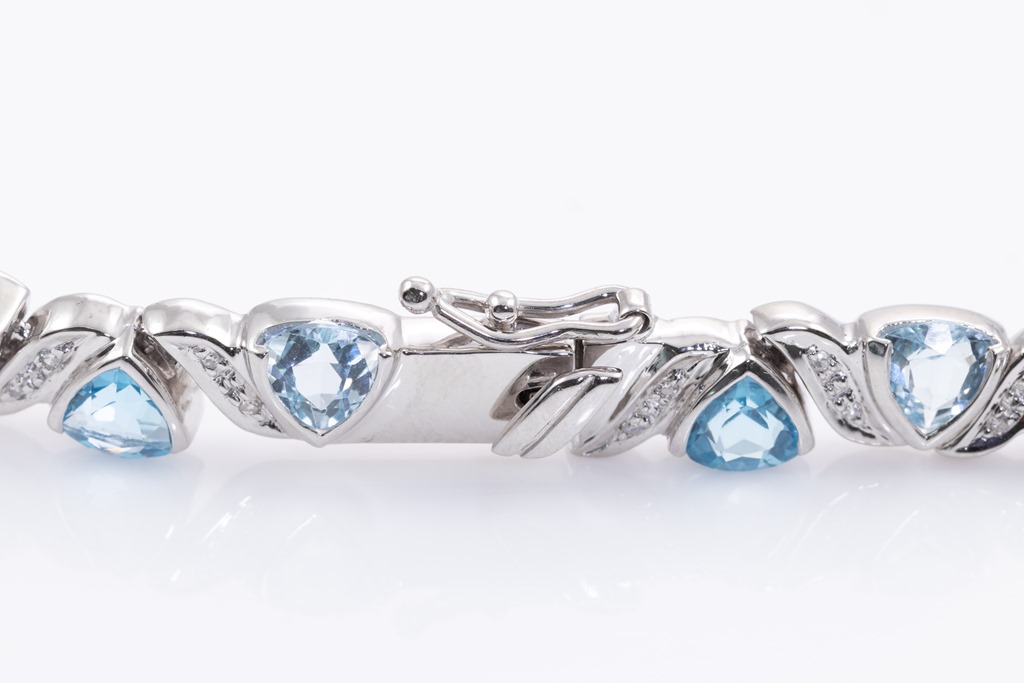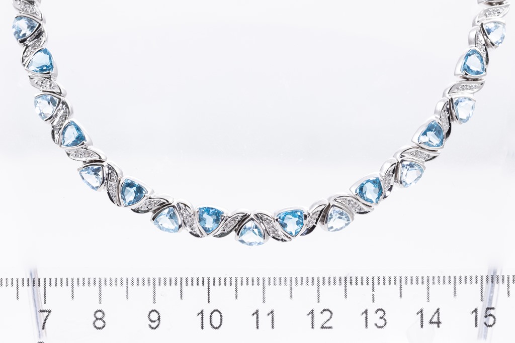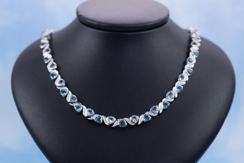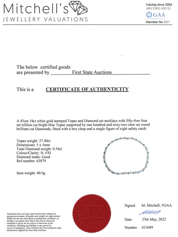 Topaz and Diamond necklace with trilliant cut Topaz totalling 27.40cts and round Diamonds totalling 0.54cts (Estimated grading: H-I SI). 18ct white gold. Length: 43cm. Weight: 40g. With Certificate #415689. (Pre-owned)