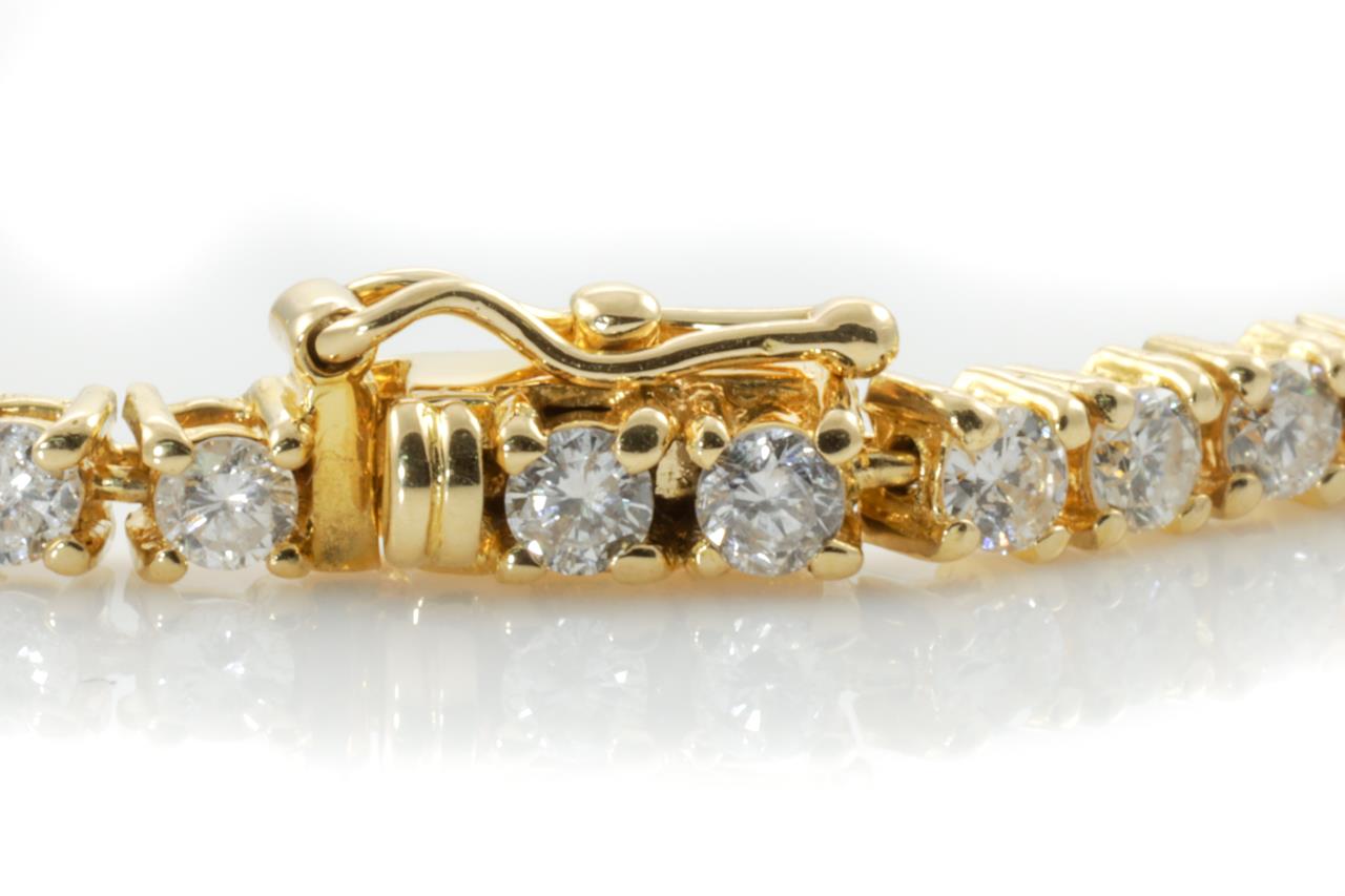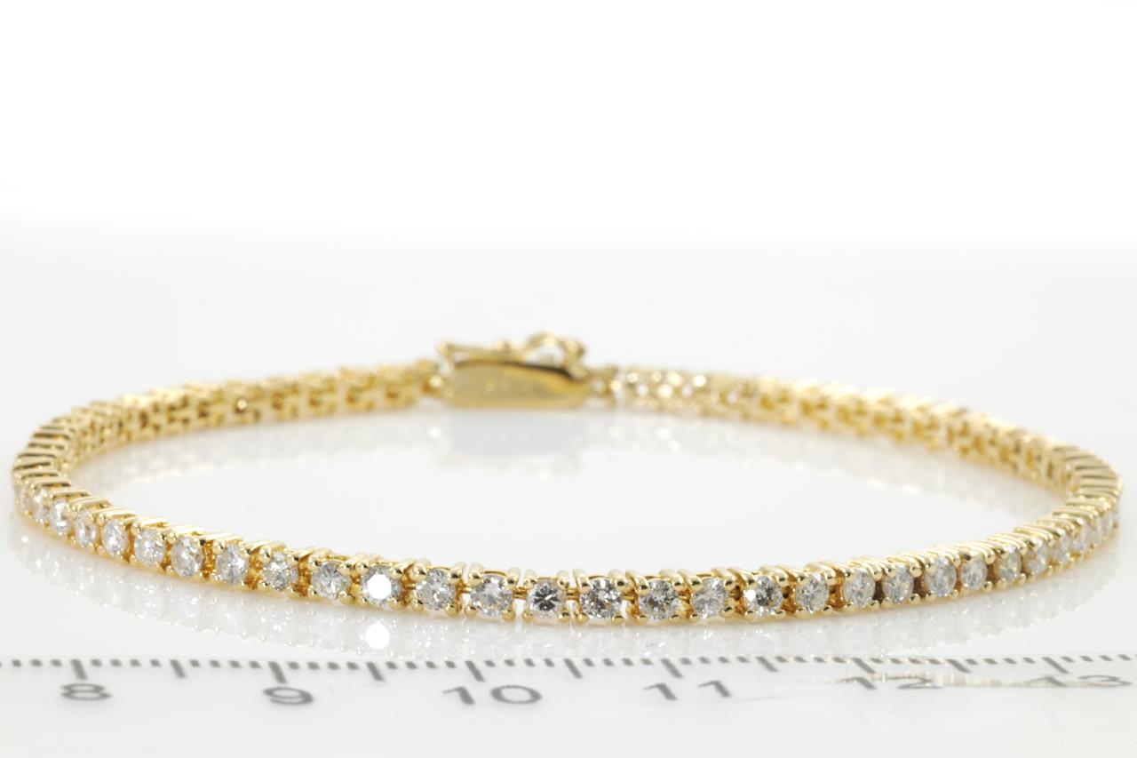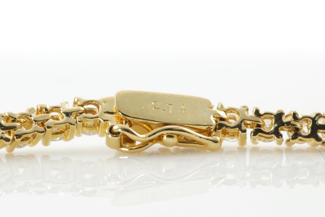 Diamond tennis bracelet with round Diamonds totalling 2.74cts (Estimated grading: H-I P1). 18ct yellow gold. Length: 19cm. Weight: 8.4g (Pre-owned)
