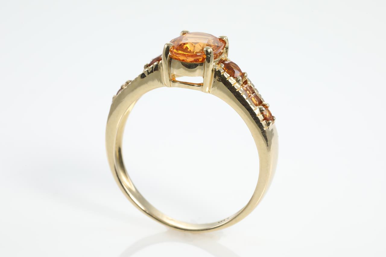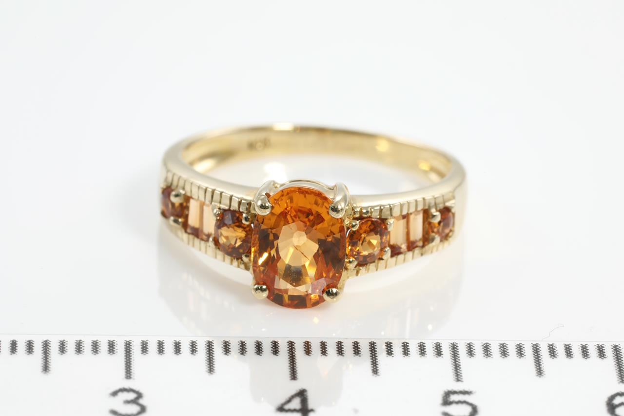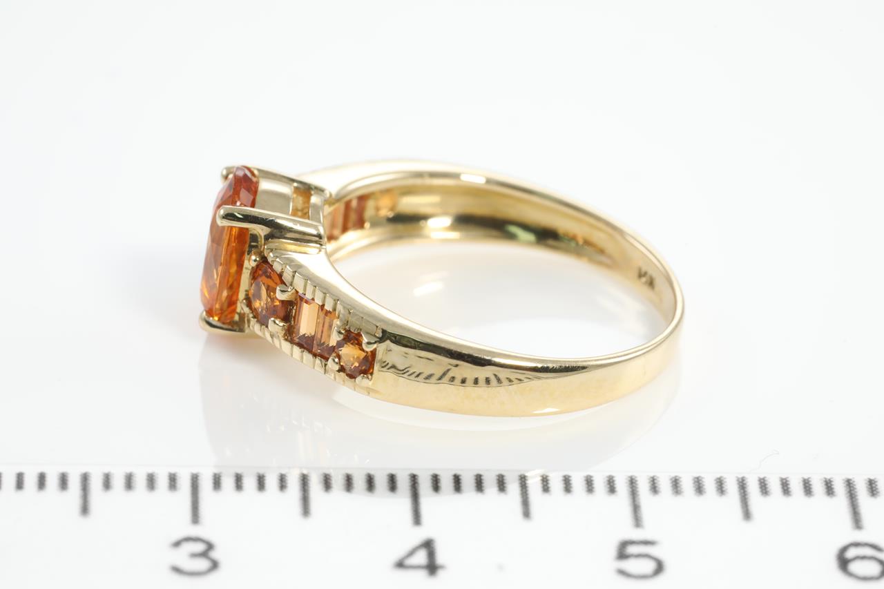 Garnet ring with round, oval and emerald cut Mandarin Garnets totalling 2.75cts. 14ct yellow gold. Ring size N. Weight: 3.4g (As New)