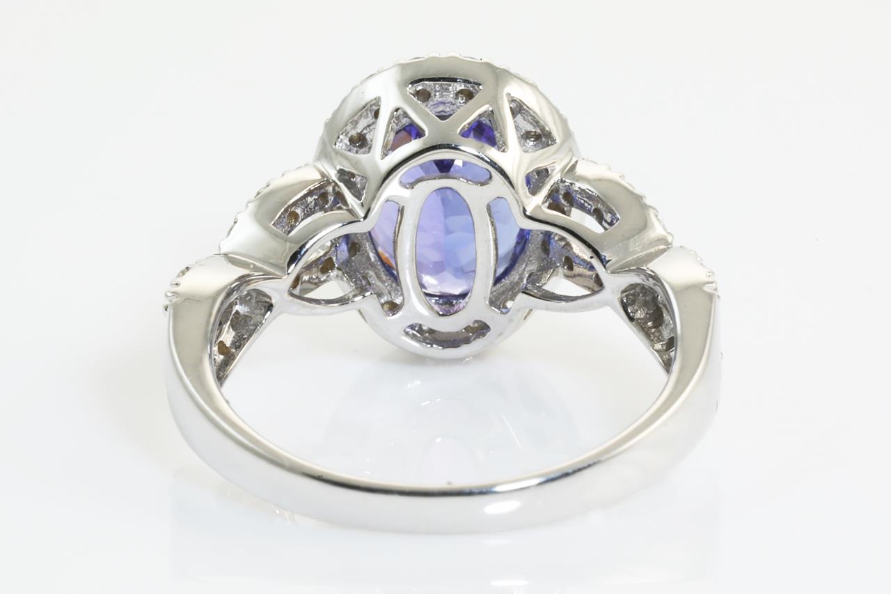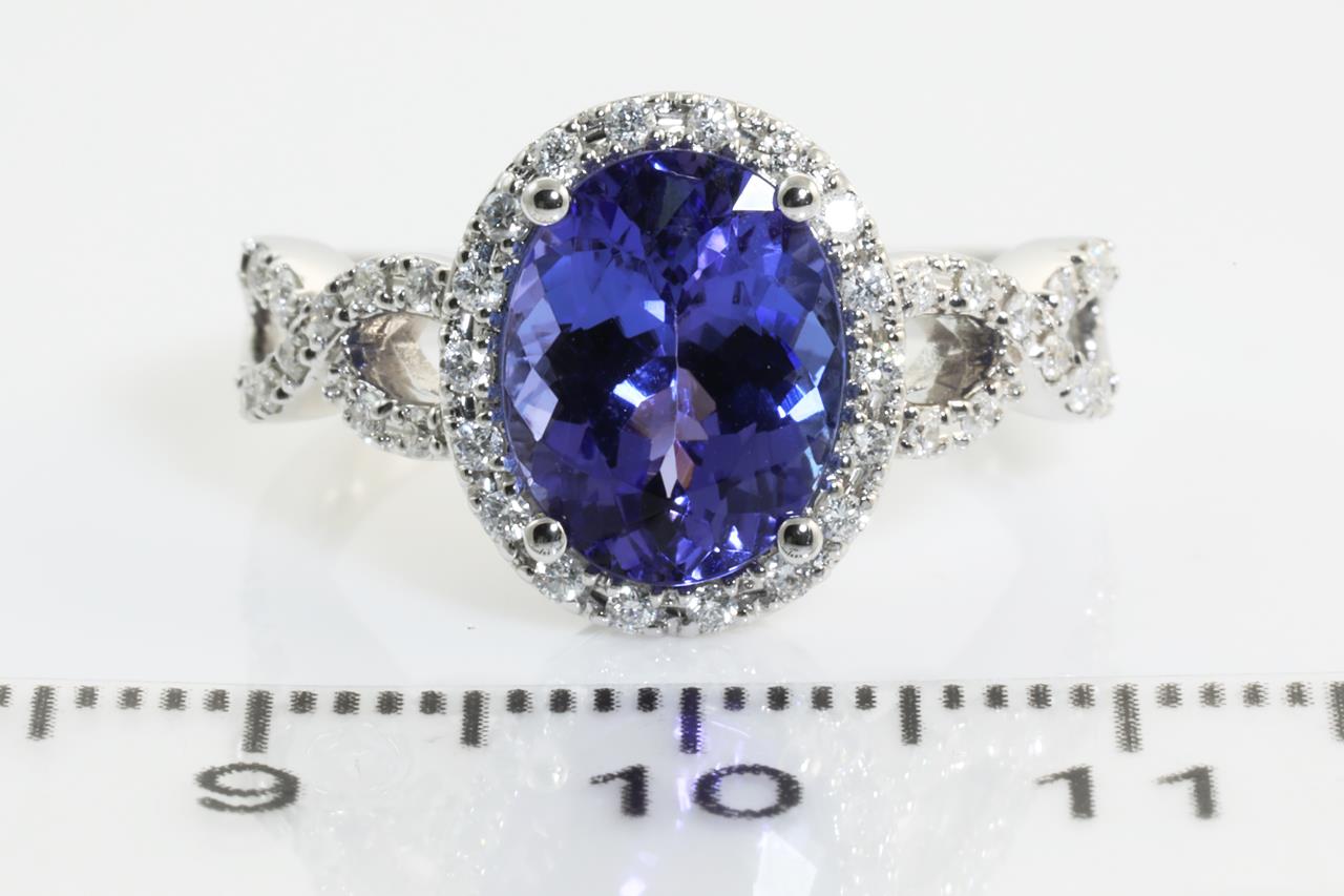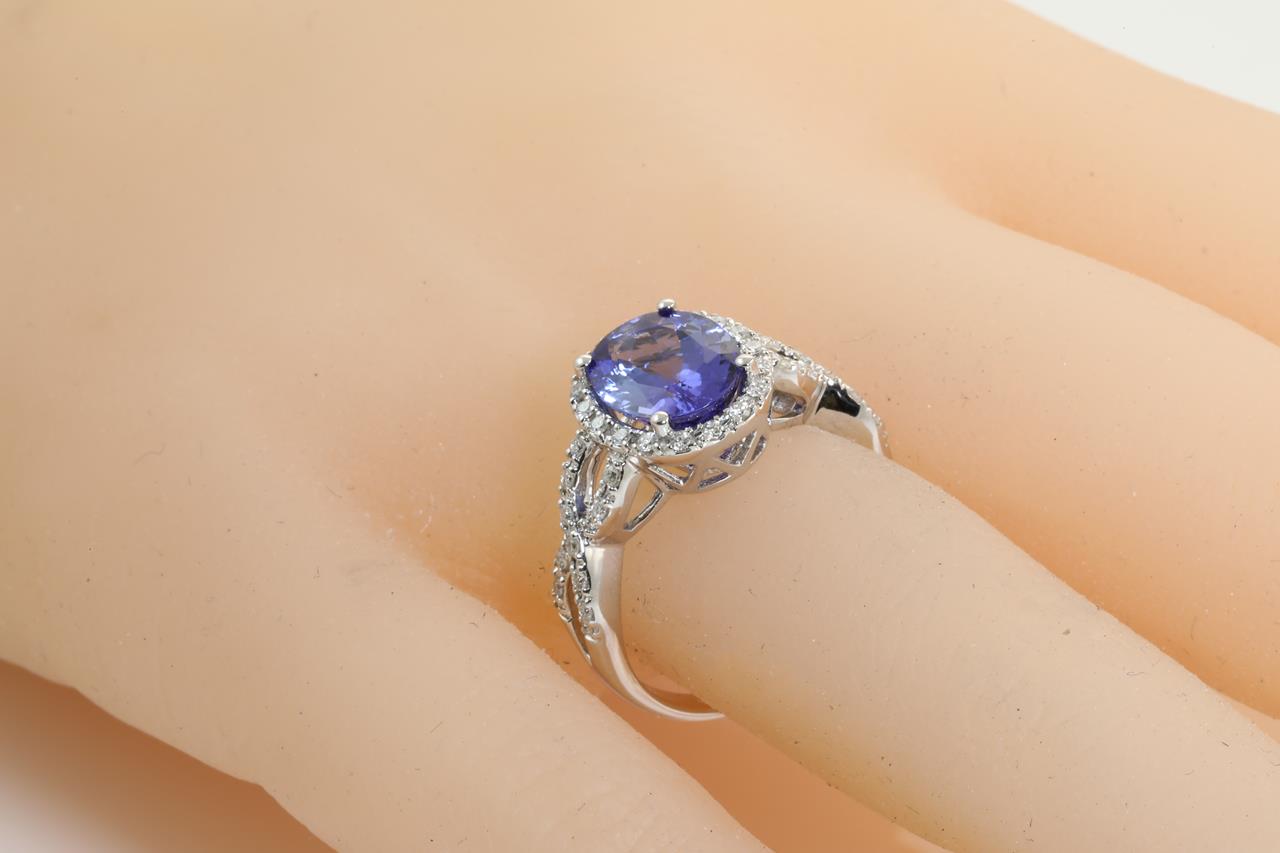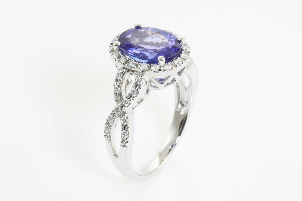 Tanzanite and Diamond ring with an oval Tanzanite of 2.75ct and round Diamonds totalling 0.27cts. 14ct white gold. Ring size N - can be resized up by a maximum of 3 sizes or down with ring clip. Weight: 4.8g (New).