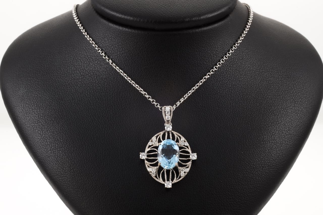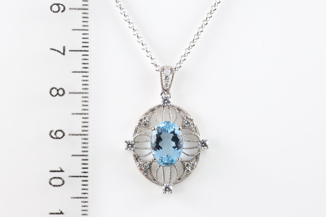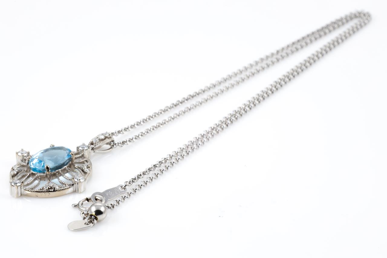 Aquamarine and Diamond pendant with an oval Aquamarine of 2.77ct and Diamonds totalling 0.35cts (Estimated grading: G-H SI). 18ct white gold with adjustable 45cm chain. Weight: 7.7g. (Pre-owned)