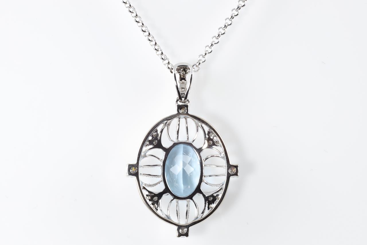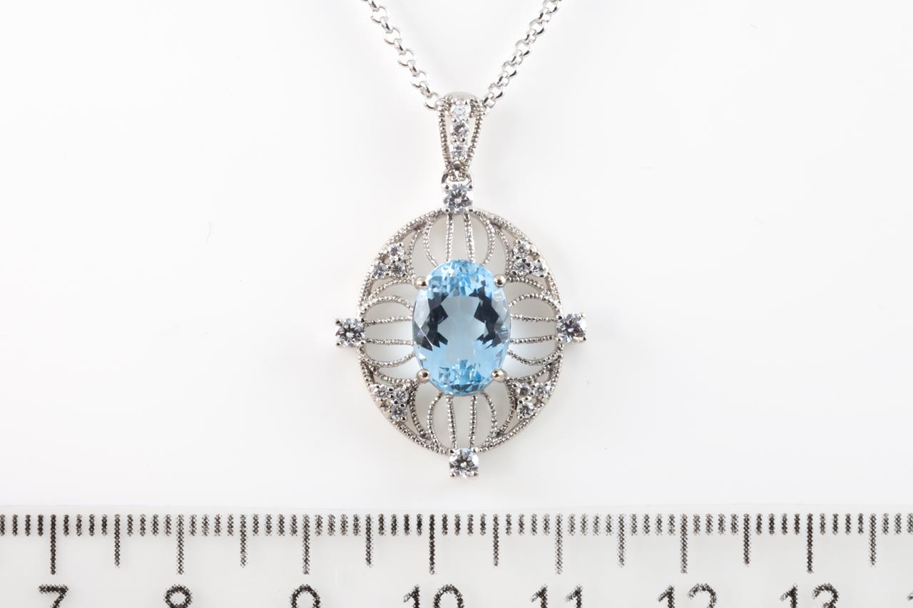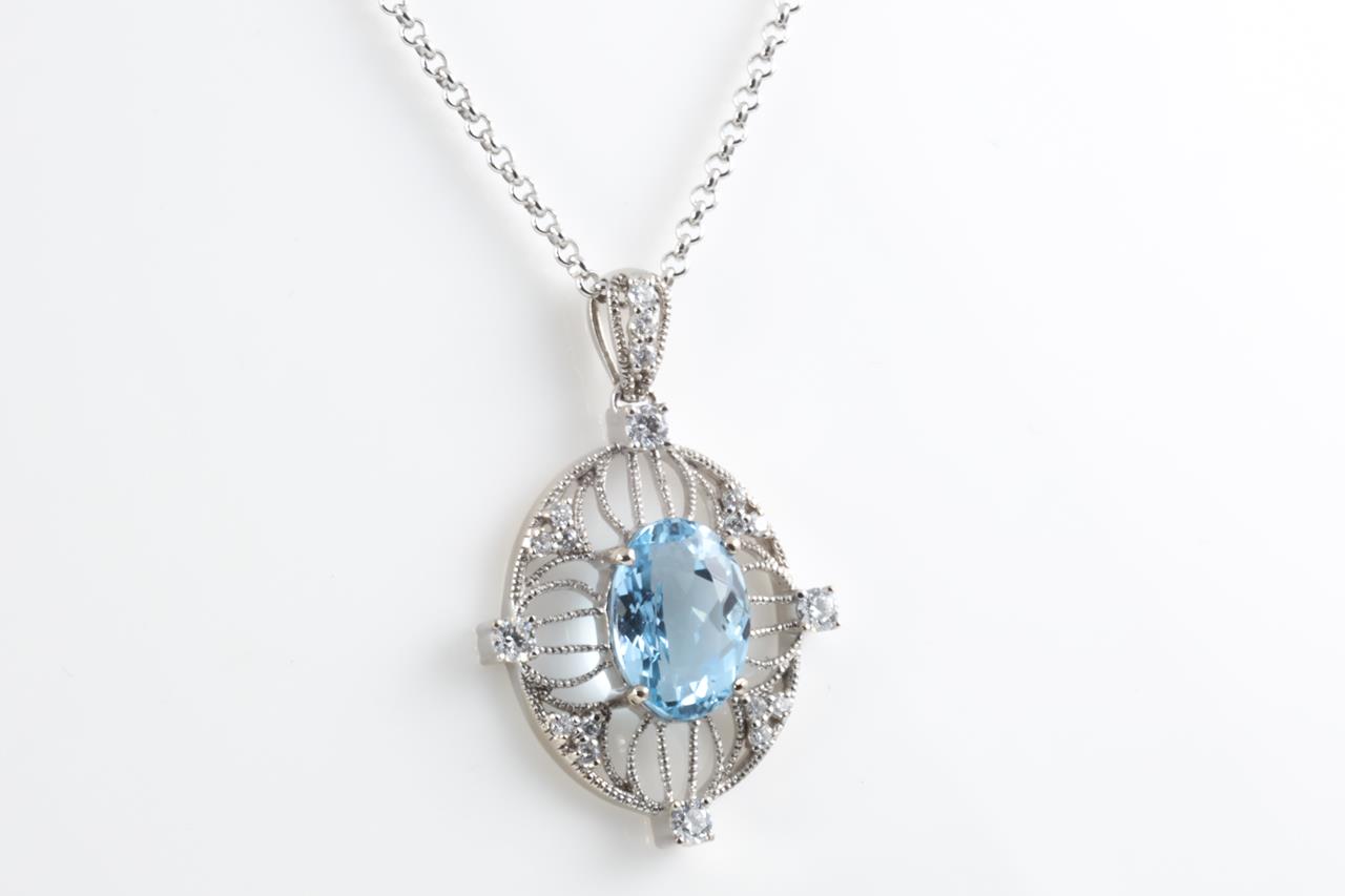 Aquamarine and Diamond pendant with an oval Aquamarine of 2.77ct and Diamonds totalling 0.35cts (Estimated grading: G-H SI). 18ct white gold with adjustable 45cm chain. Weight: 7.7g. (Pre-owned)