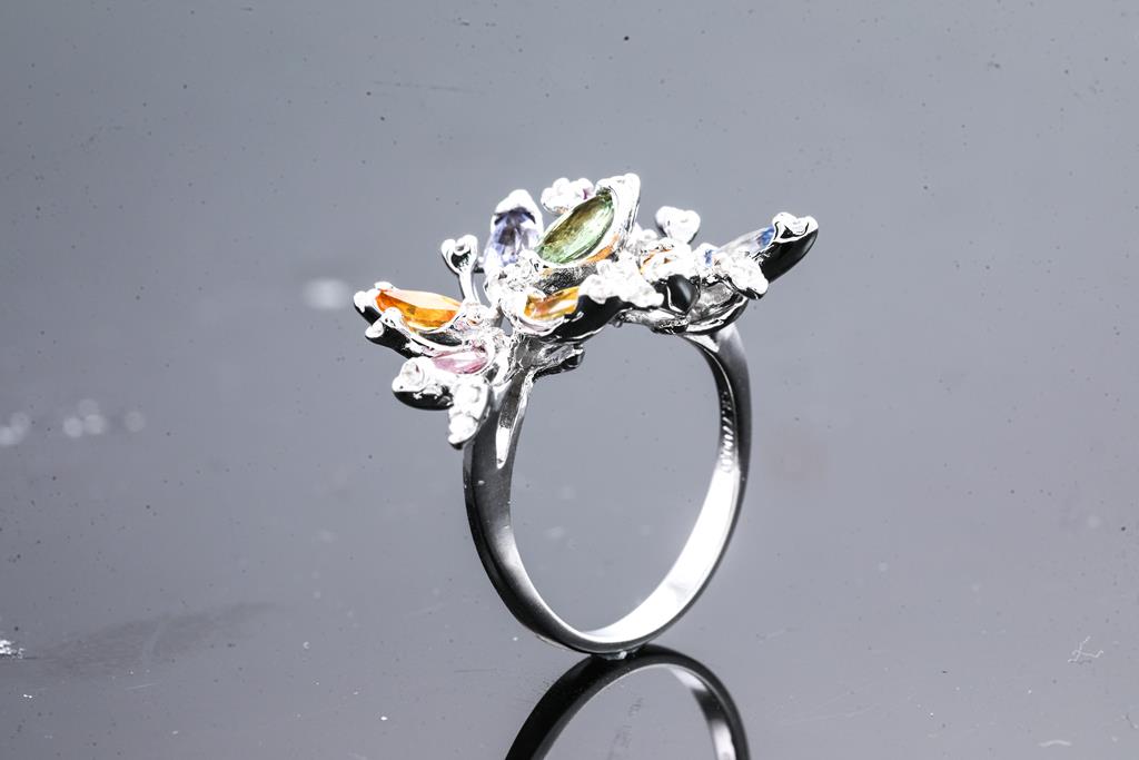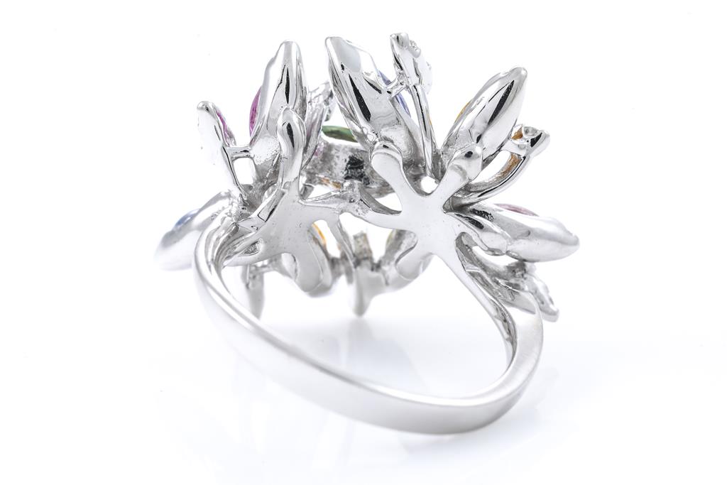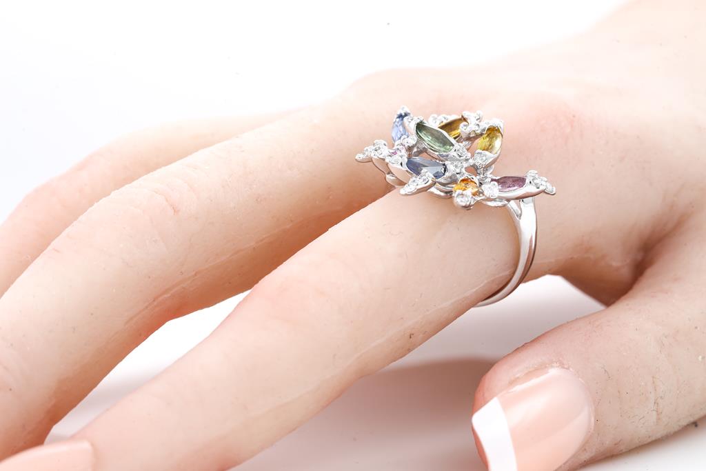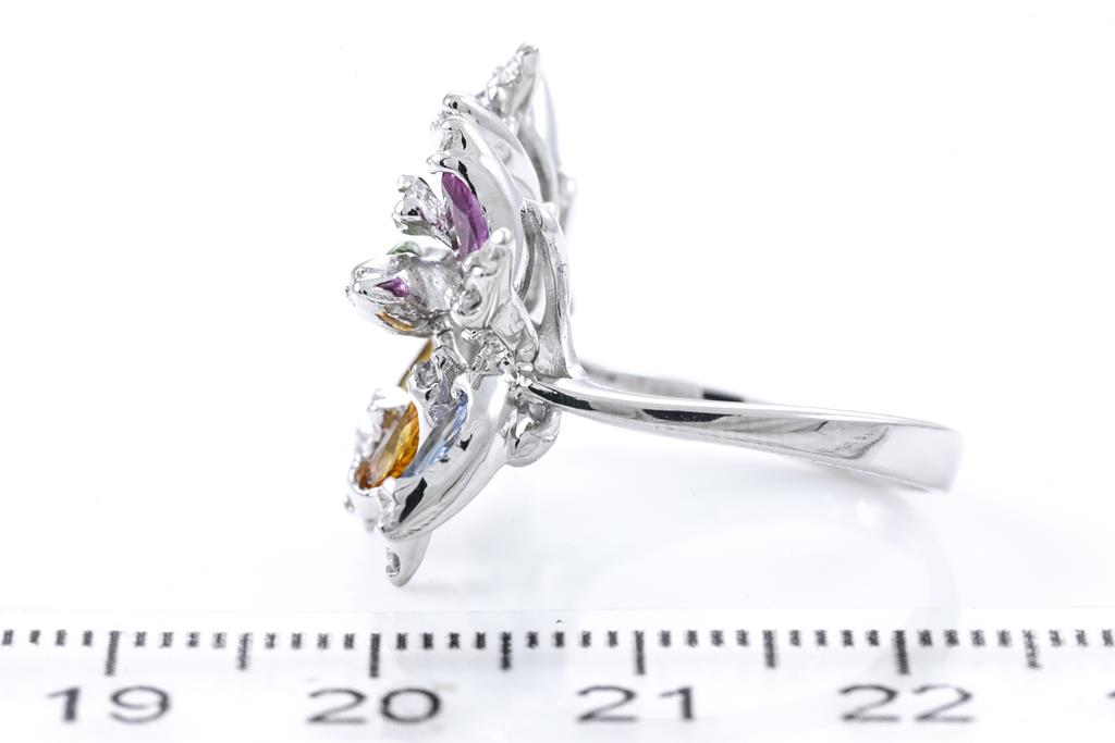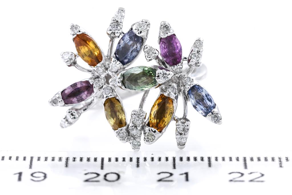 Sapphire and Diamond ring with marquise cut multi-colour Sapphires totalling 2.77cts and round Diamonds totalling 0.40cts (Estimated grading: G-H J-K SI-P1). 14ct white gold. Ring size N1/2 - ring resizing is not recommended. Weight: 6g. (Pre-owned)