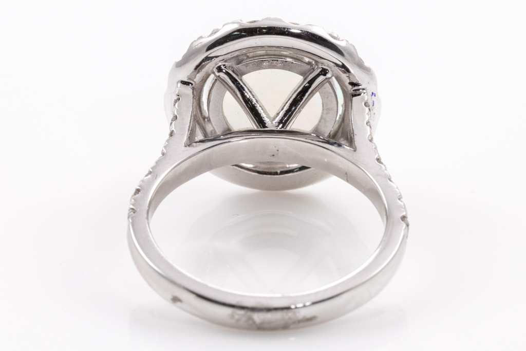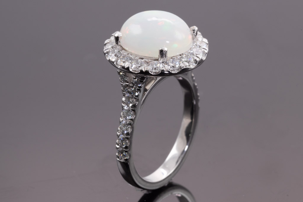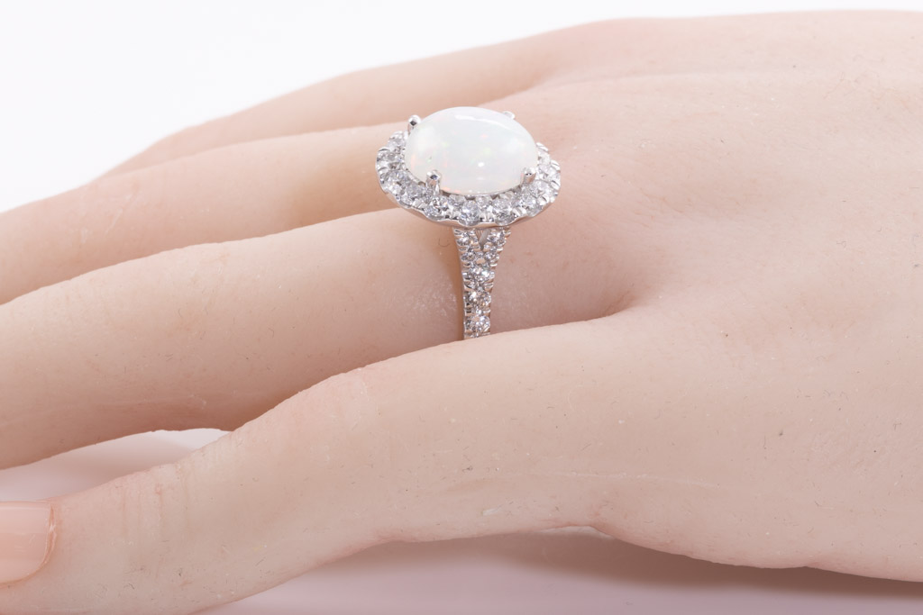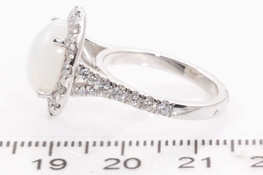 Opal and Diamond ring with cabochon cut solid white Opal of 2.77cts with surrounding round Diamonds totalling 1.23cts (Estimated grading: G SI). 18ct white gold. Ring size L1/2 - ring resize is not recommended. Weight: 7.7g (New)