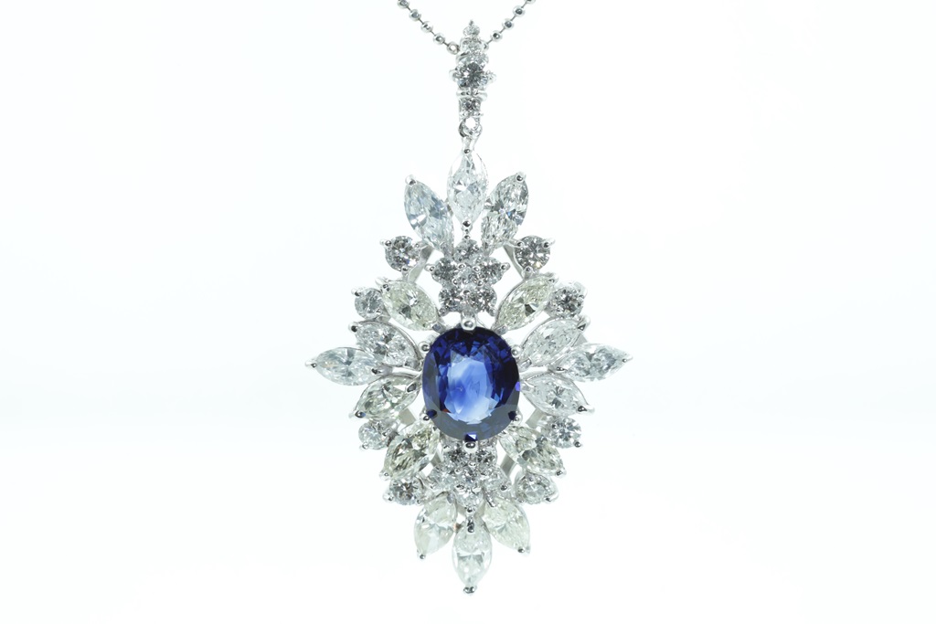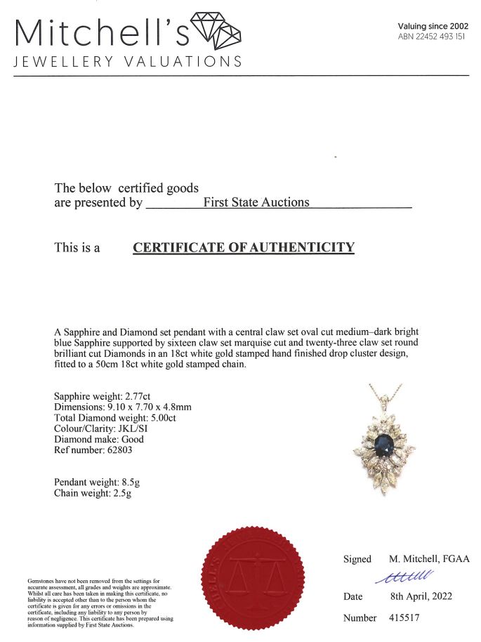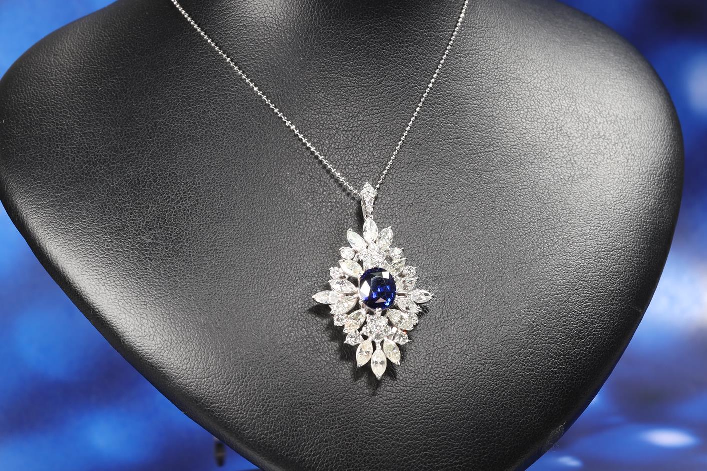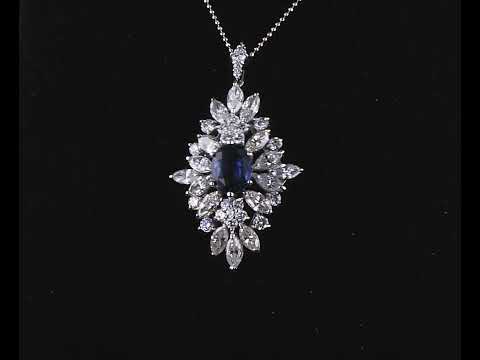 Sapphire and Diamond Pendant with centre oval shape blue Sapphire of 2.77ct and surrounding marquise cut and round Diamonds totalling 5.00cts (Estimated grading: JKL SI). 18ct white gold with 50cm adjustable chain. Weight: 11g. With Certificate #415517. (Pre-owned)