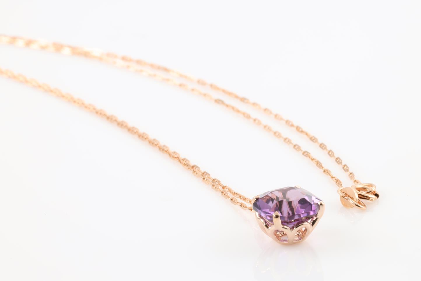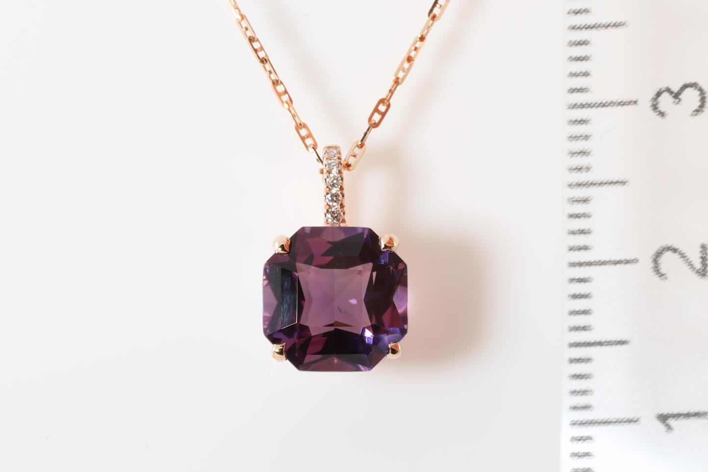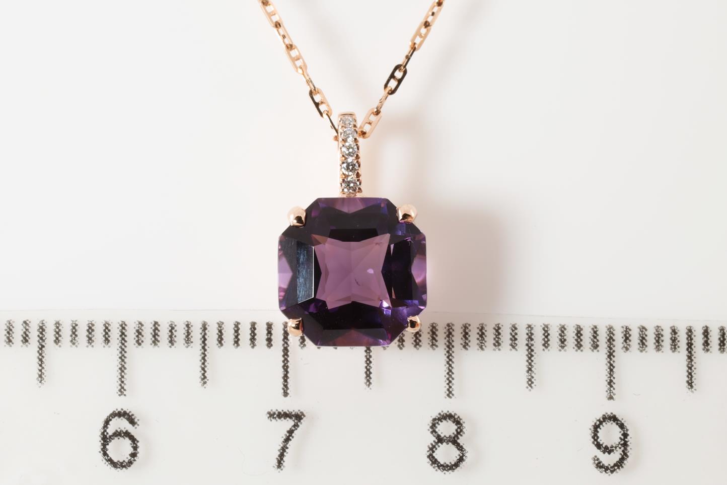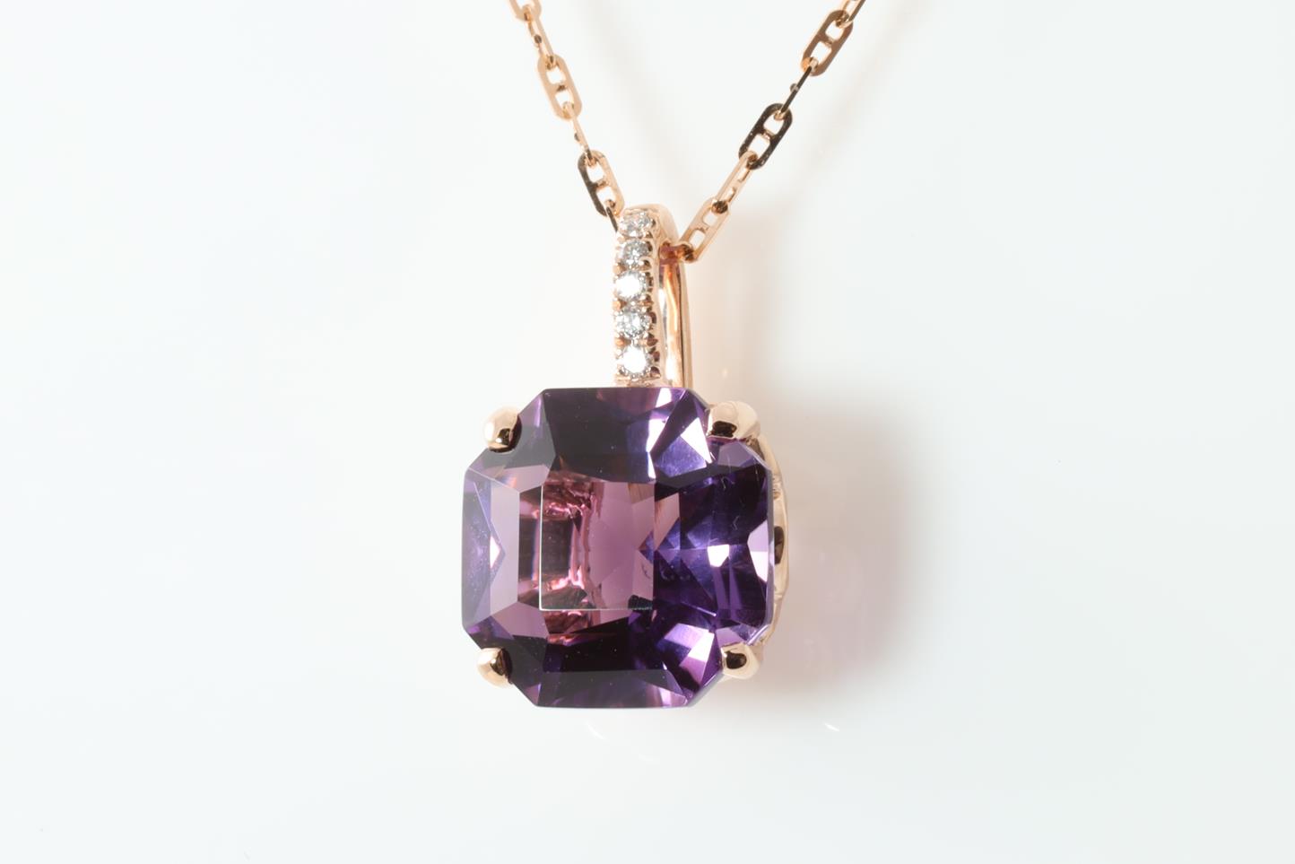 Amethyst and Diamond pendant with octagonal cut Amethyst of 2.79ct and Diamonds totalling 0.02cts. 14ct rose gold and 14ct gold 45cm chain. Weight: 3.5g (New)