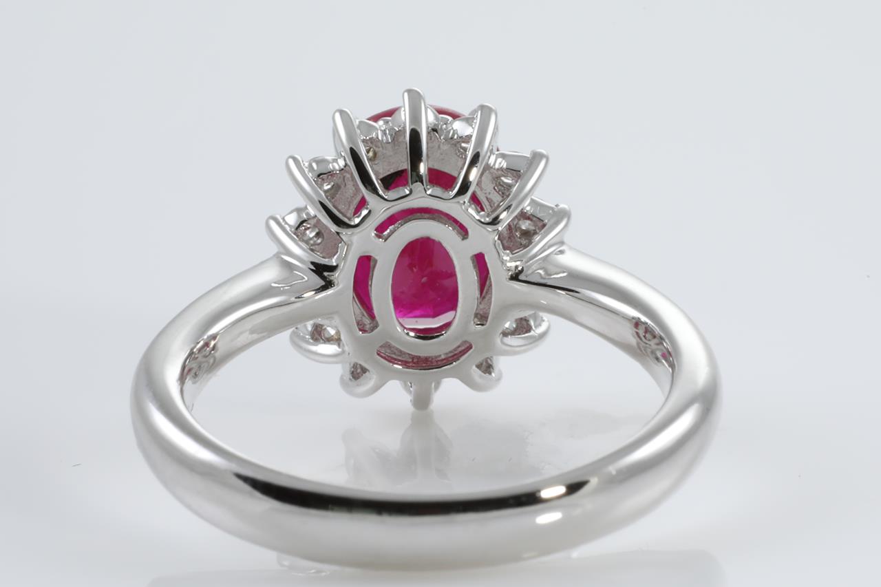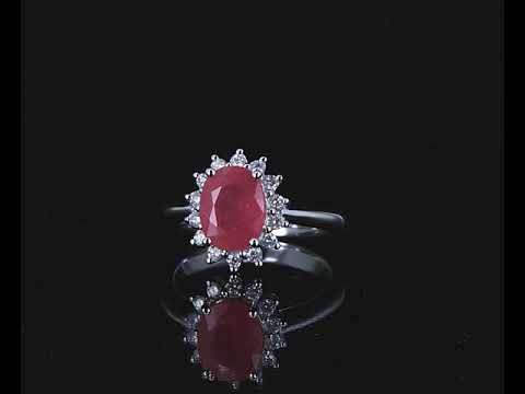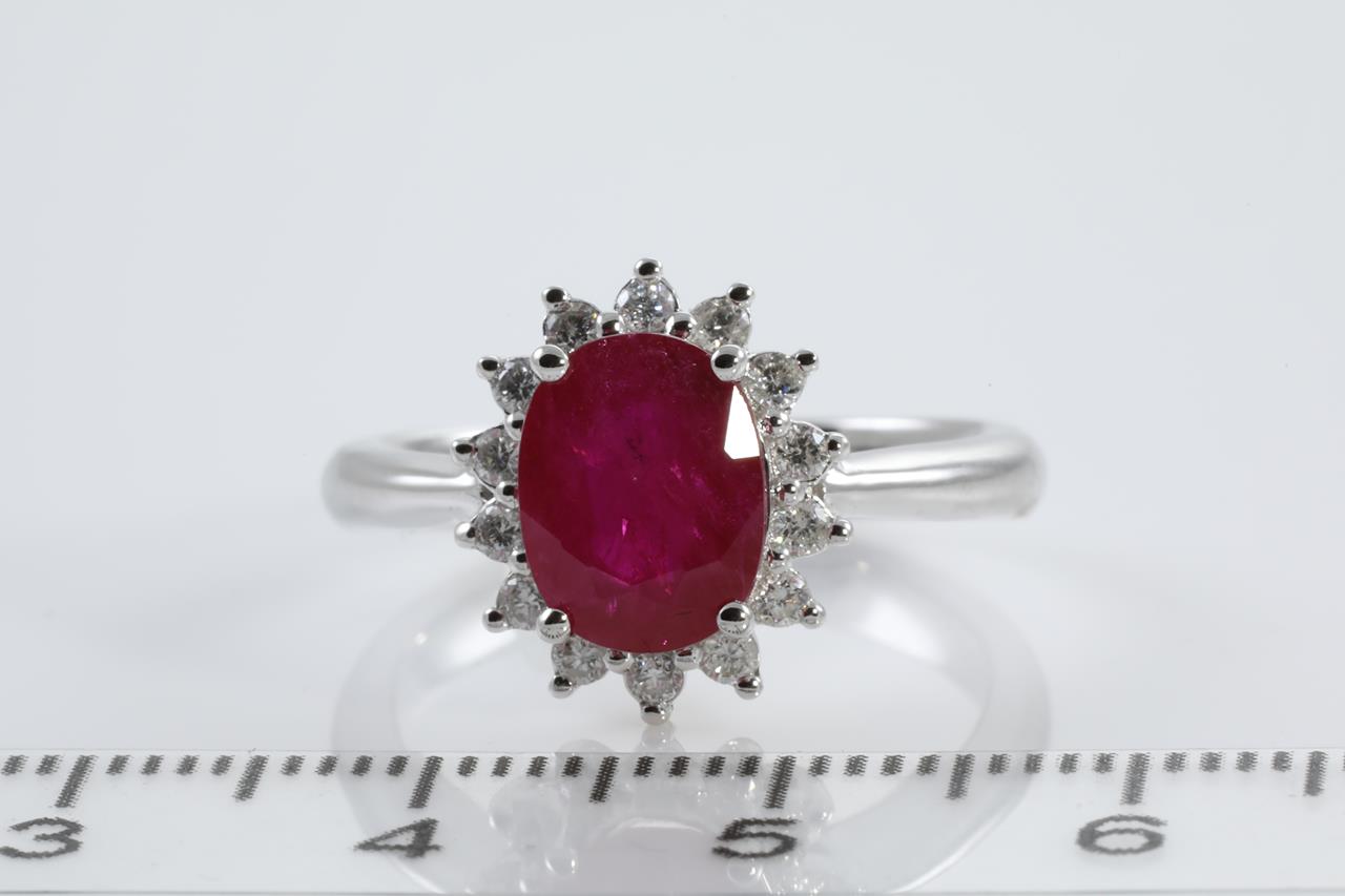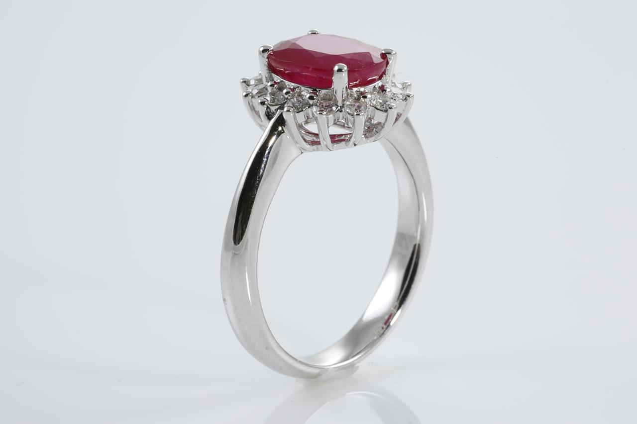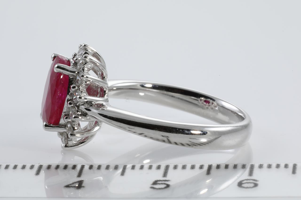 Ruby and Diamond ring with oval shape Ruby of 2.79ct and Diamonds totalling 0.24cts. 14ct white gold. Ring size N1/2 . Weight: 5.4g (As New)