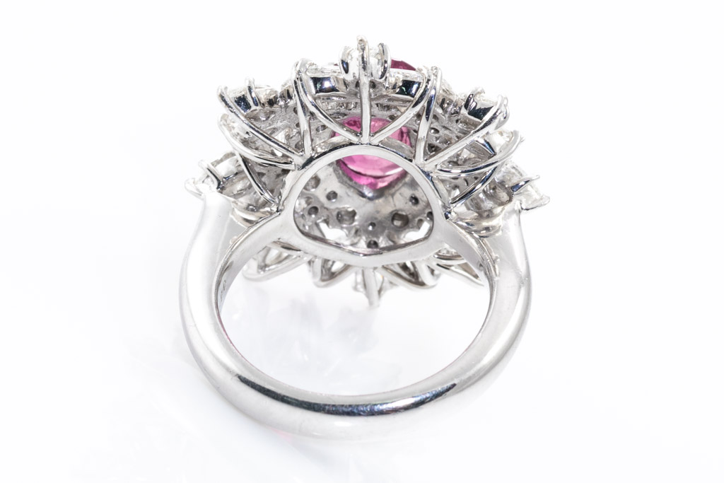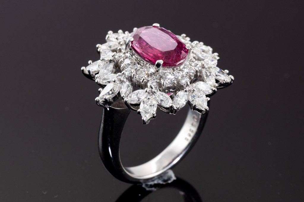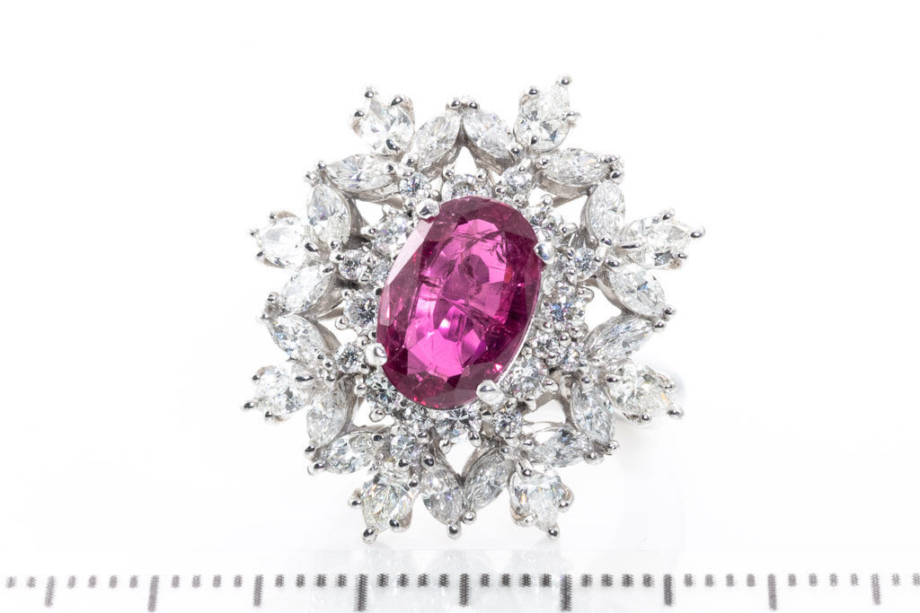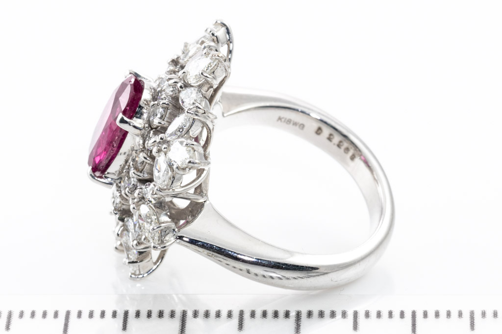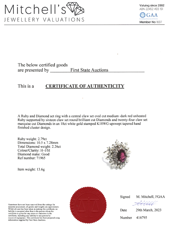Ruby and Diamond ring with oval unheated Ruby of 2.79ct (with natural and surface reaching inclusions) and round & marquise cut Diamonds totalling 2.26cts (Estimated grading: H-I SI) 18ct white gold. Ring size M. Weight: 13.6g. With Certificate #416795. (Pre-owned)