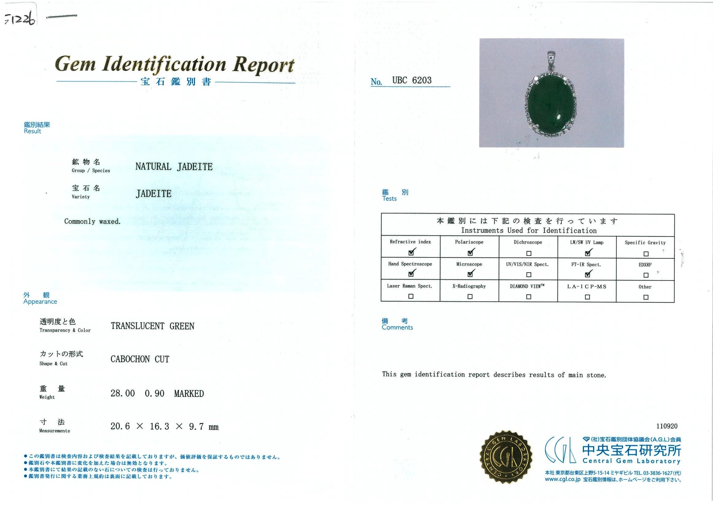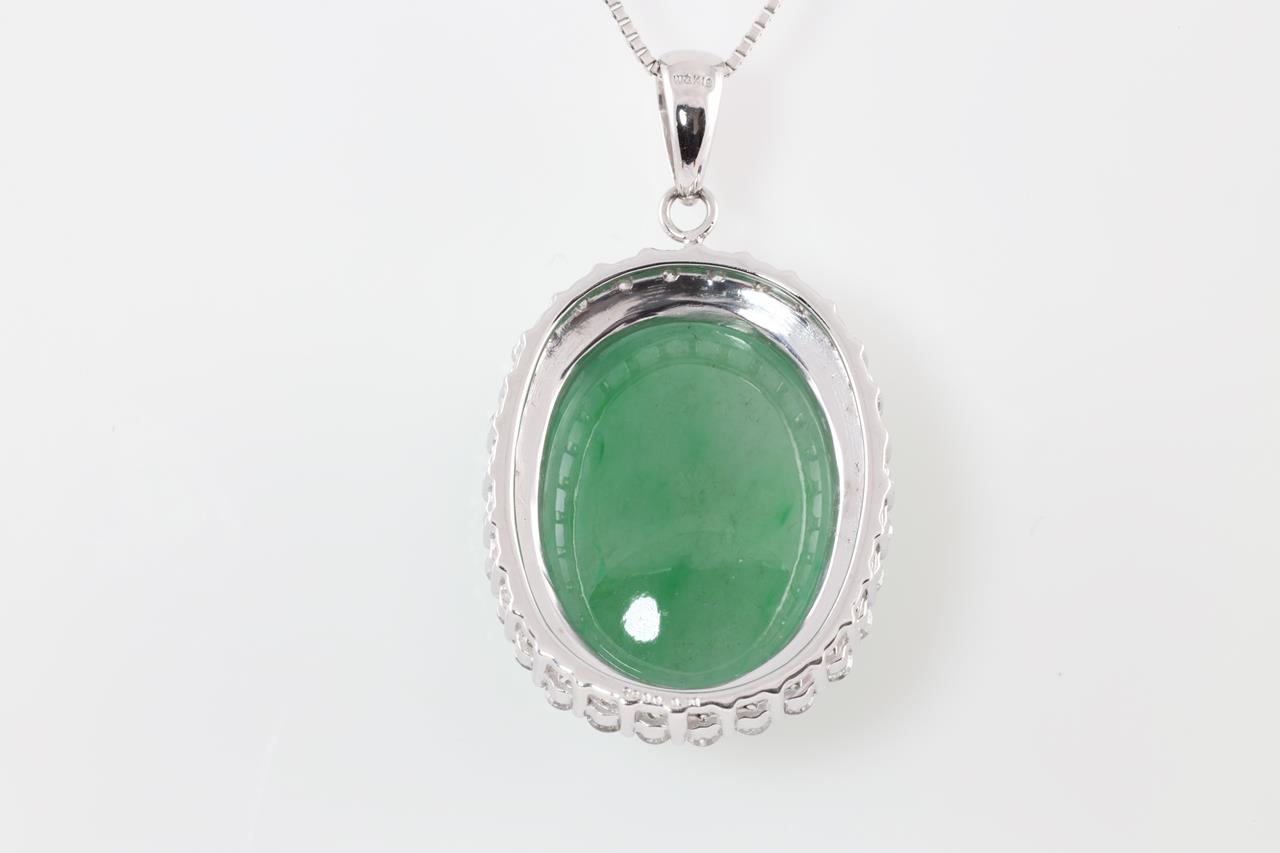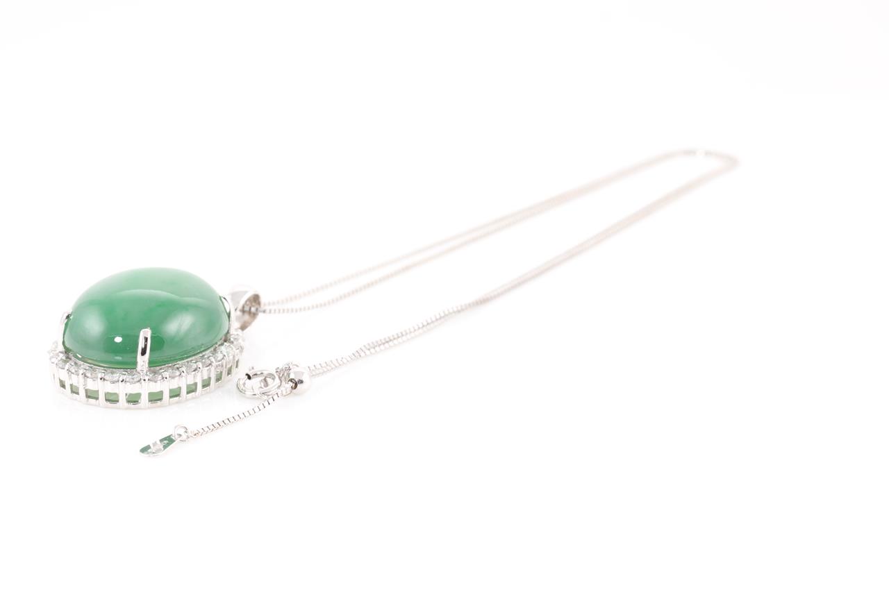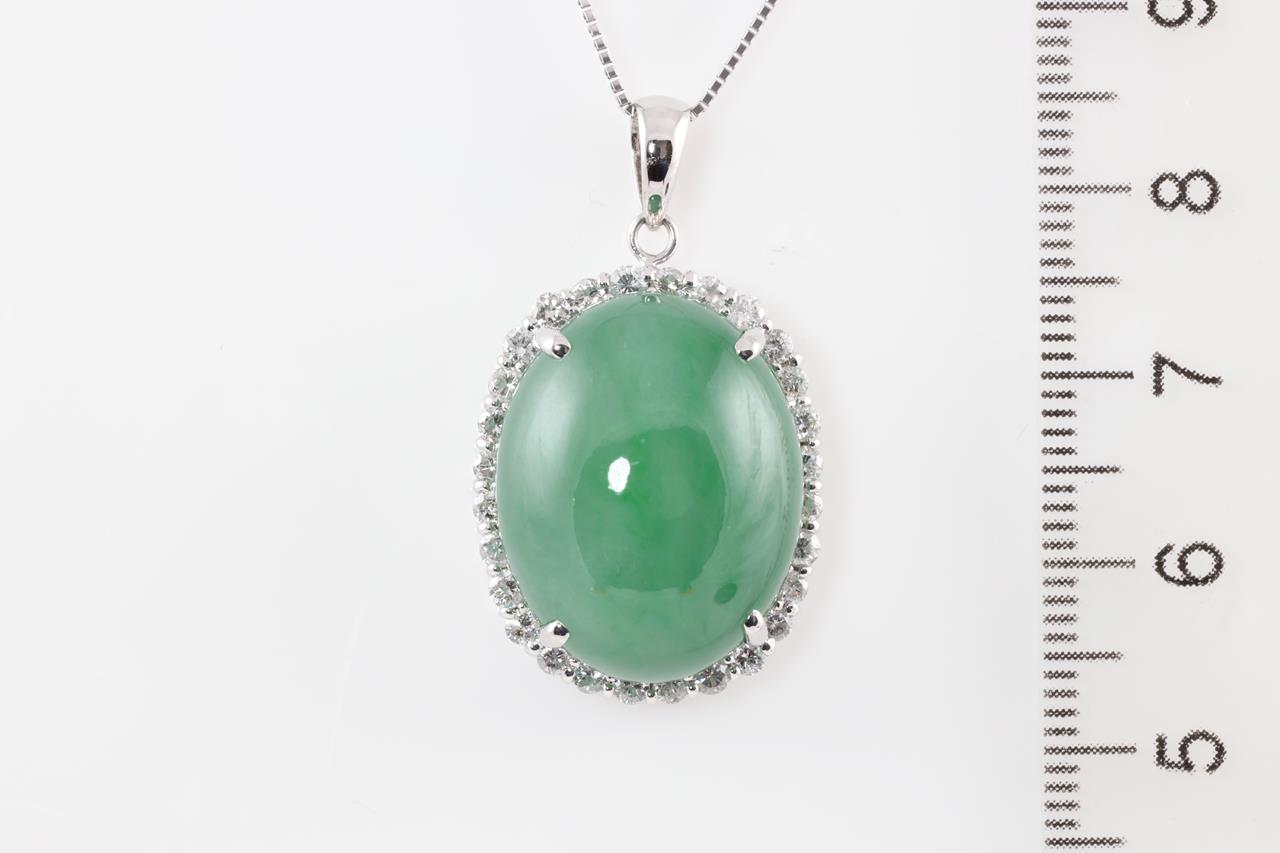 Jade and Diamond pendant with cabochon oval cut Jade translucent green natural Jadeite Jade of 28.00ct (with GEM identification report #UBC 6203) and Diamonds of 0.90cts (Estimated grading: H P1). 18ct white gold with 45cm 18ct gold adjustable chain. Weight: 11.3g (Pre-owned)