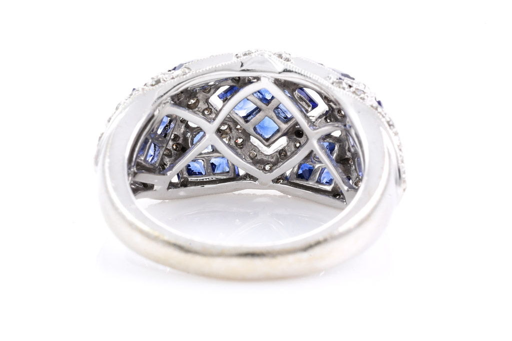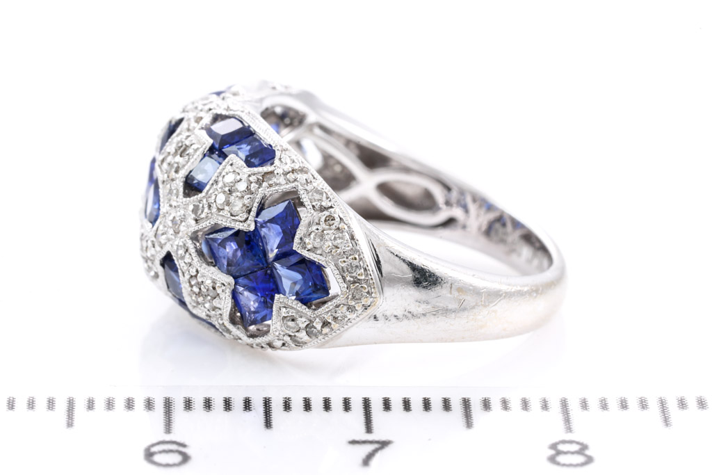Sapphire and Diamond ring with princess cut blue Sapphires totalling 2.80cts and round Diamonds totalling 0.40cts (Estimated grading: J-K SI). 18ct white gold. Ring size L - ring resizing is not recommended. Weight: 6.9g. (Pre-owned)