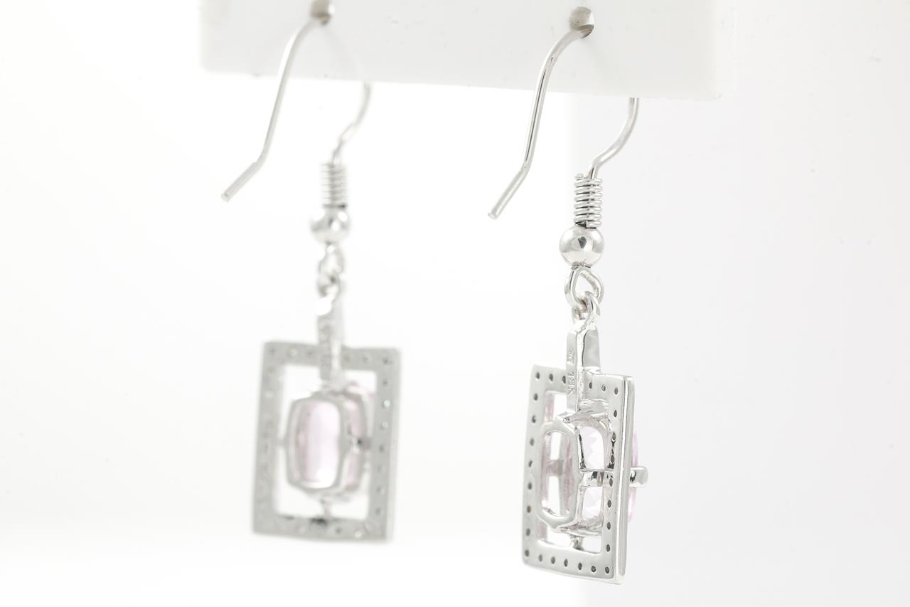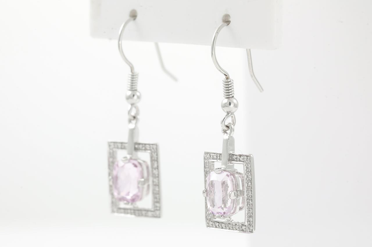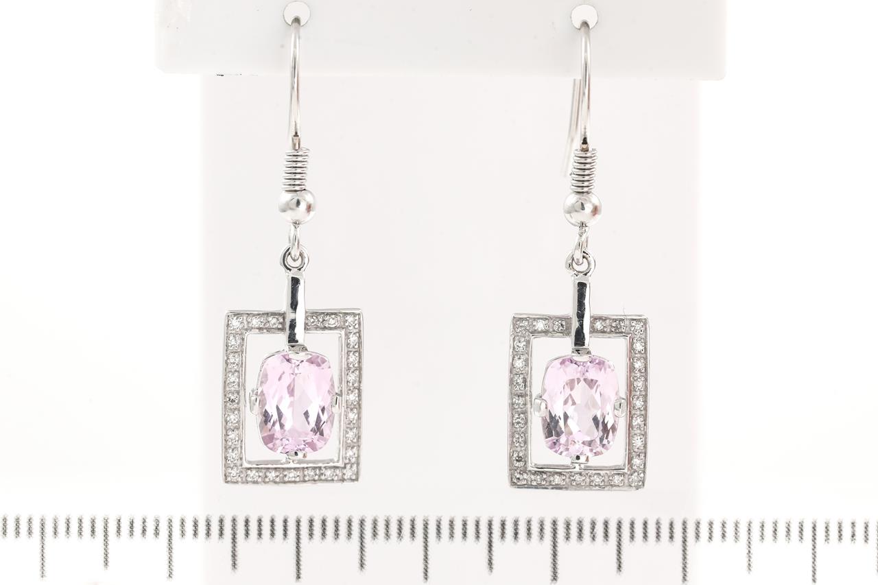 Kunzite and Diamond shepherd hook earrings with cushion cut Kunzite totalling approximately 2.80cts and Diamonds totalling approximately 0.27cts. 18ct white gold. Weight: 5.2g. (Pre-owned)