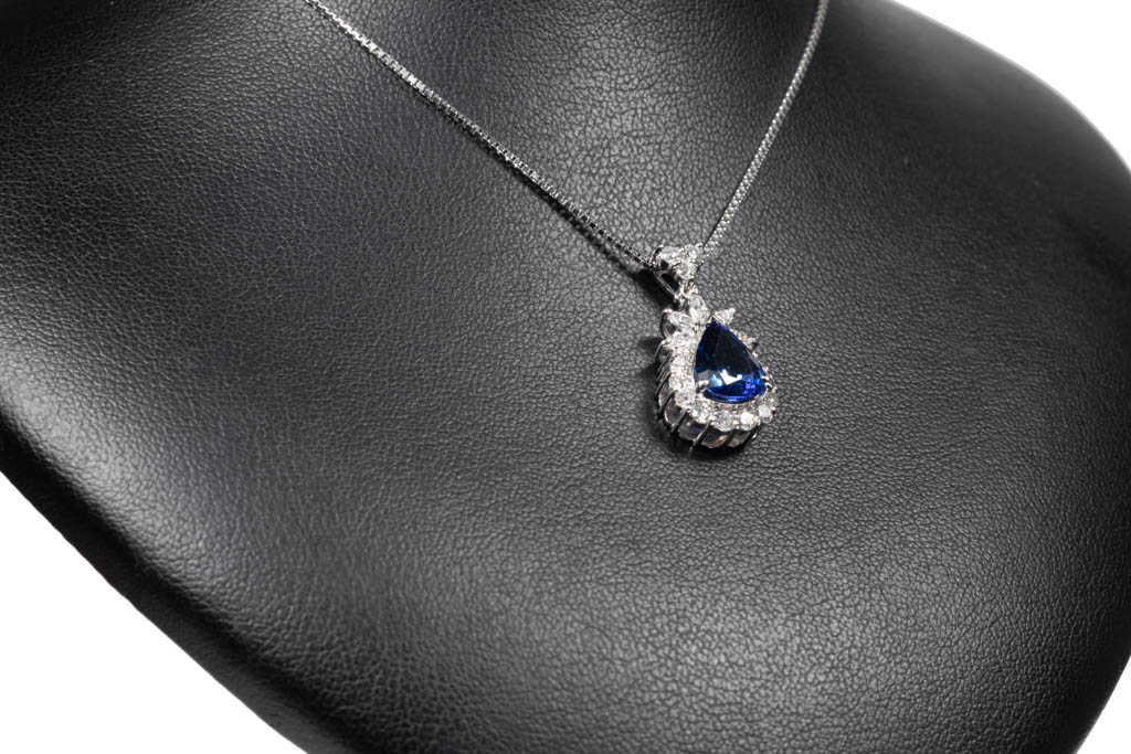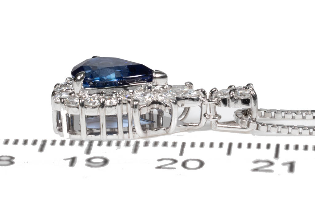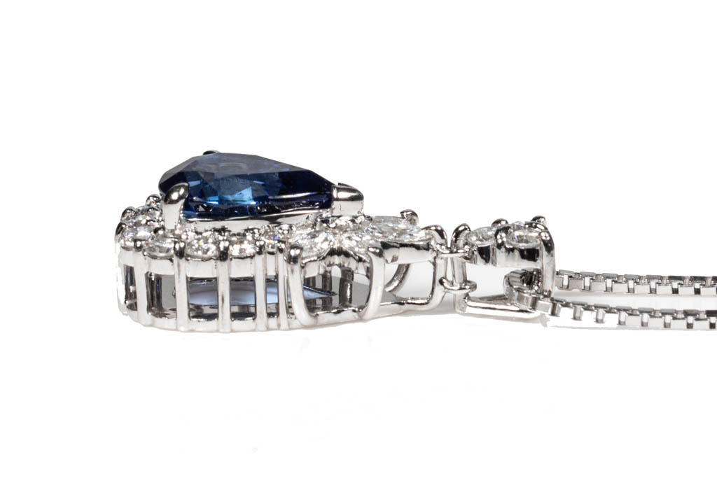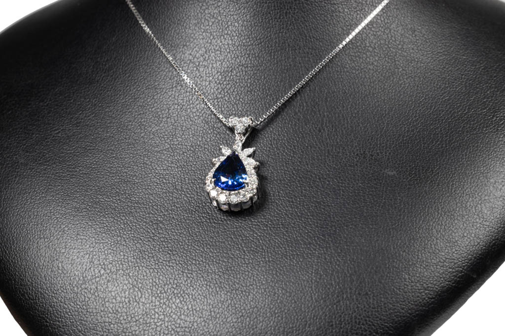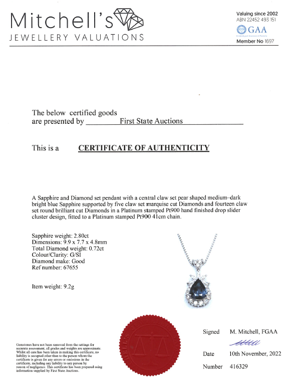 Sapphire and Diamond pendant with a pear shape blue Sapphire of 2.80ct and marquise cut & round Diamonds totalling 0.72cts (Estimated grading: G SI). Platinum with platinum adjustable 41cm chain. Weight: 9.2g. With certificate #416329. (Pre-owned)