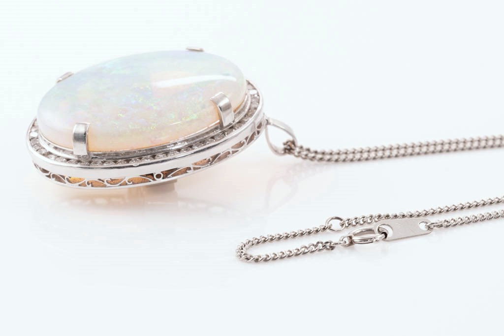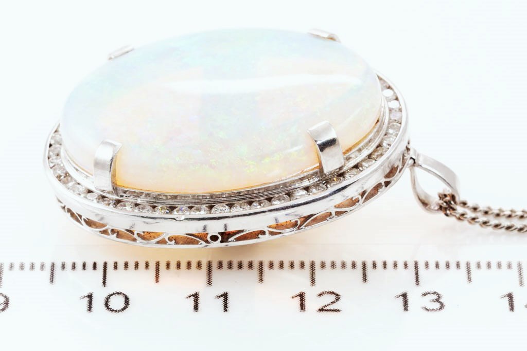 Opal and Diamond pendant with oval cabochon cut solid White Opal of 28.29ct and round Diamonds totalling 1.24cts (Estimated grading: H-I SI). Platinum with 42cm platinum adjustable chain. Weight: 28.1g. With certificate# 416750. (Pre-owned)