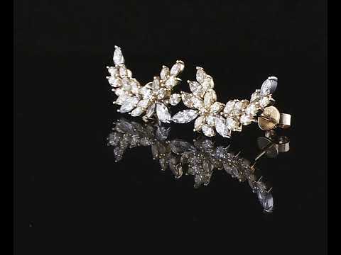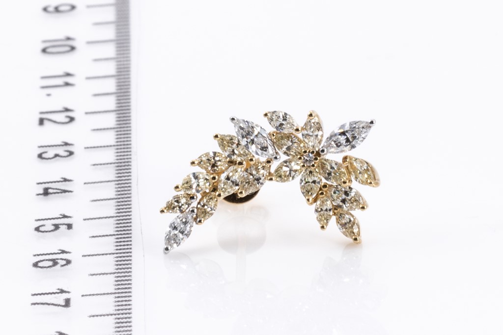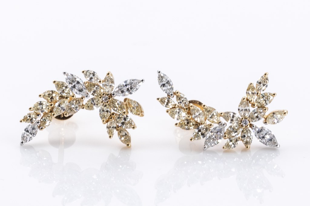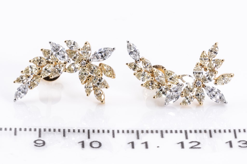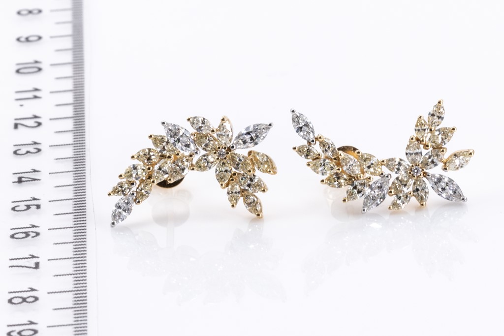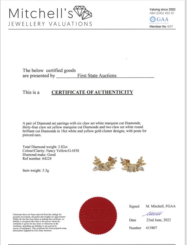 Diamond earrings with round & marquise cut Diamonds totalling 2.82cts (Estimated grading: Fancy yellow-G-H SI). 18ct yellow and white gold. Weight: 5.3g. With Certificate #415807. (As new)