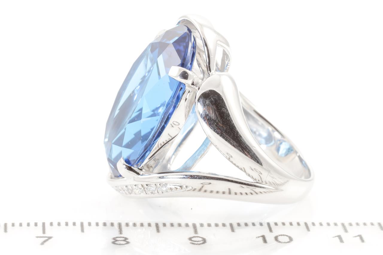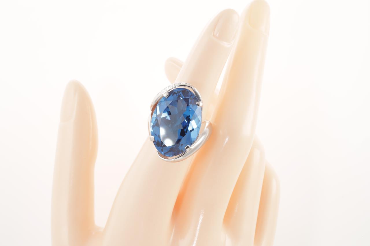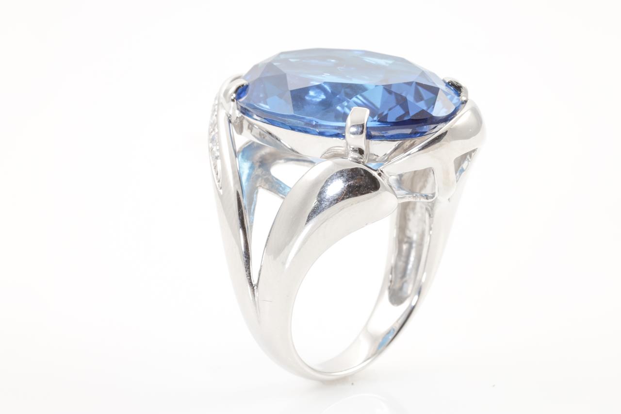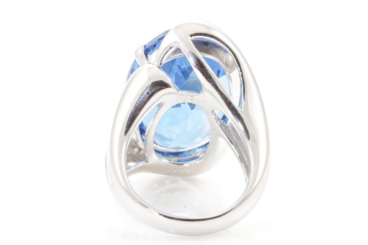 Topaz and Diamond ring with an oval Topaz of 28.37ct and Diamonds totalling 0.07cts. Platinum. Ring size L1/2. Weight: 21.0g (Pre-owned)