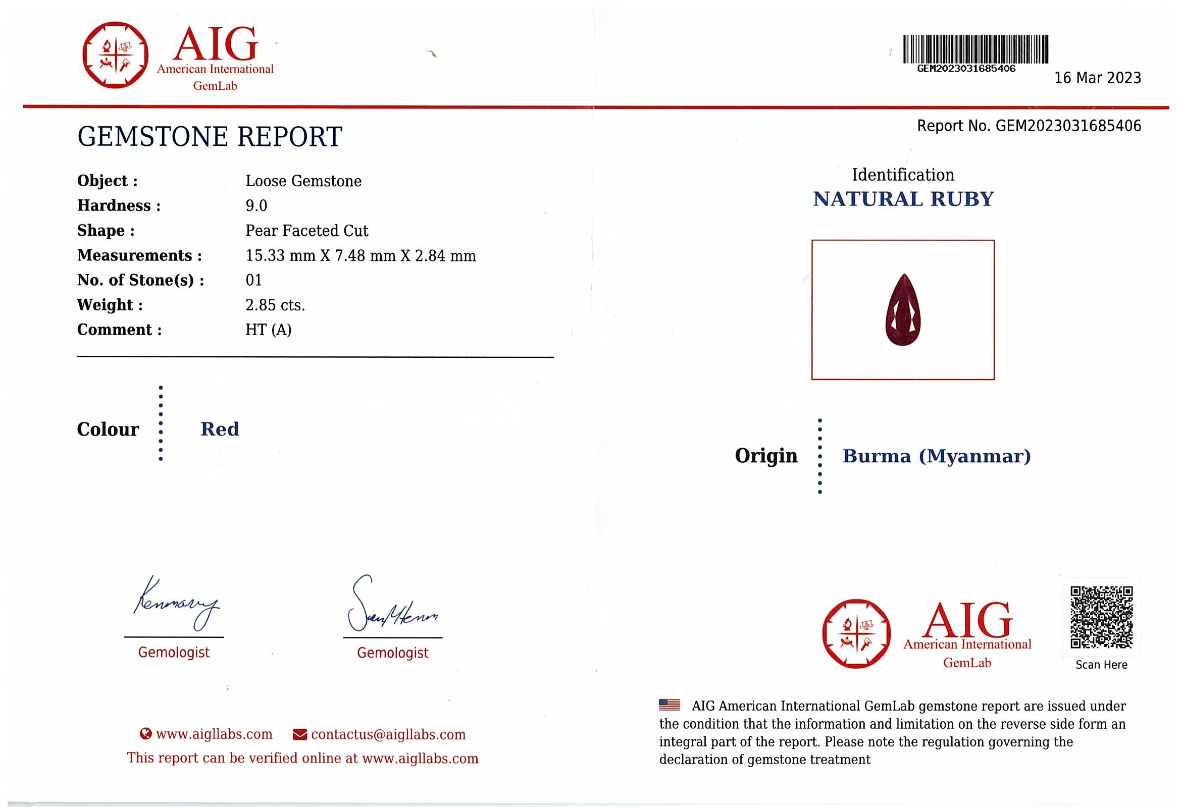 A loose pear shape Burmese Ruby of 2.85ct ( with AIG Report #2023031685406). (As New)