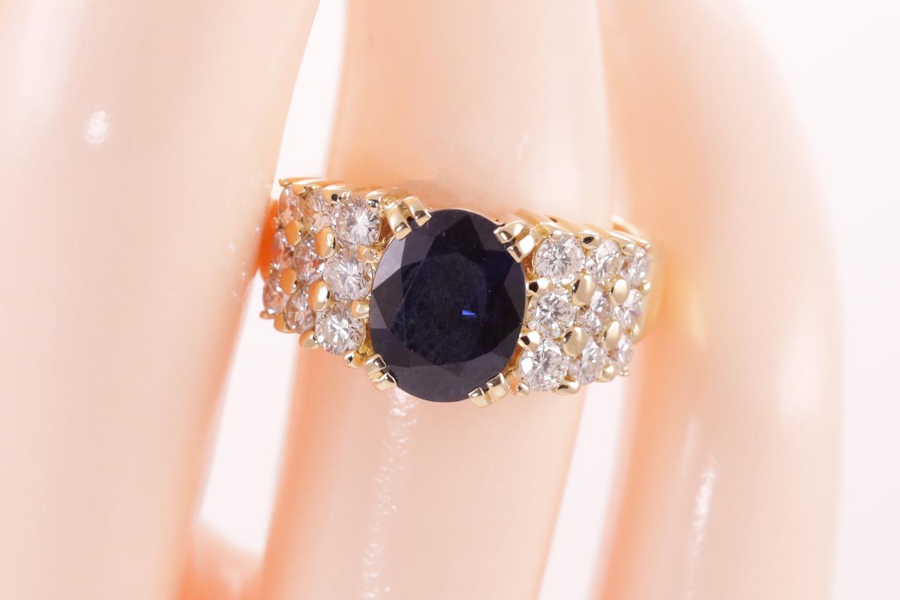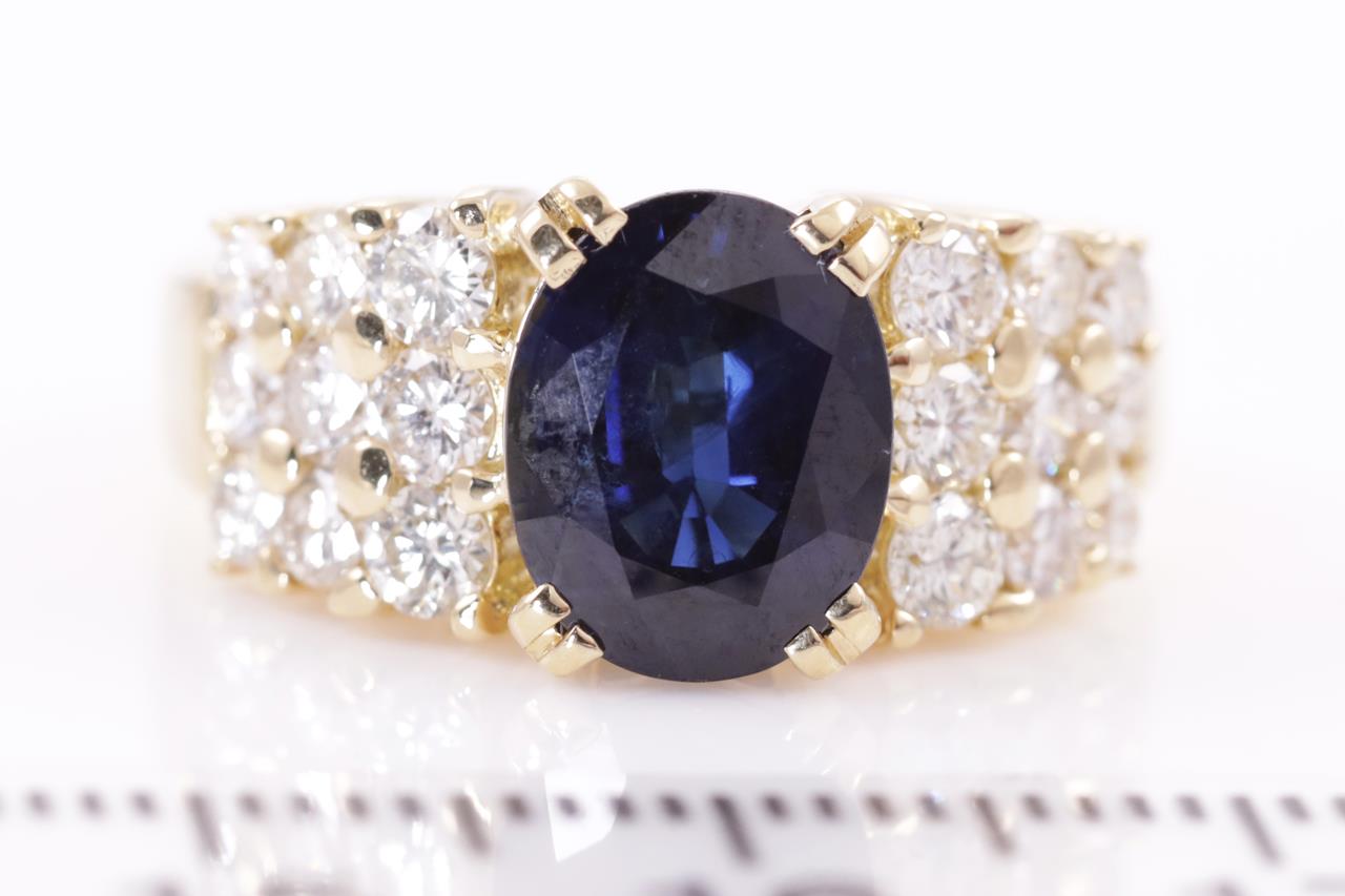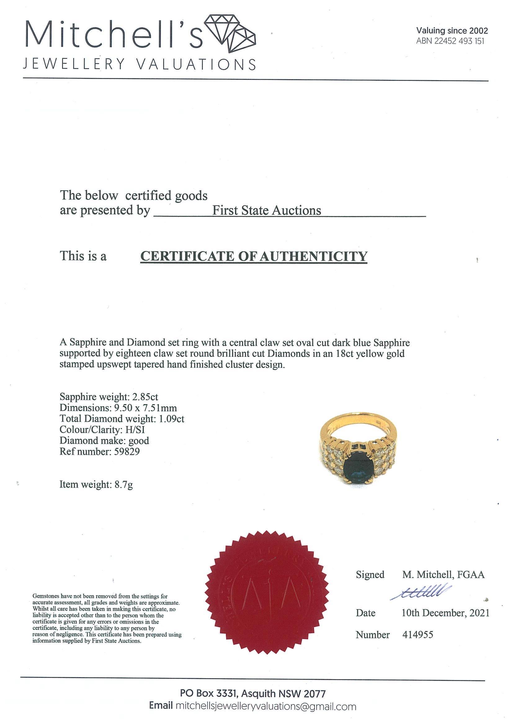 Sapphire and Diamond Ring with oval shape blue Sapphire of 2.85ct and round Diamonds totalling 1.09cts (Estimated grading: H SI). 18ct yellow gold. Ring size L - can be resized up by a maximum of 3 sizes, down with ring clip. Weight: 8.7g. With certificate #414955. (Pre-owned)