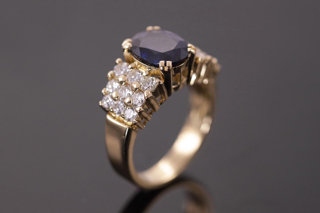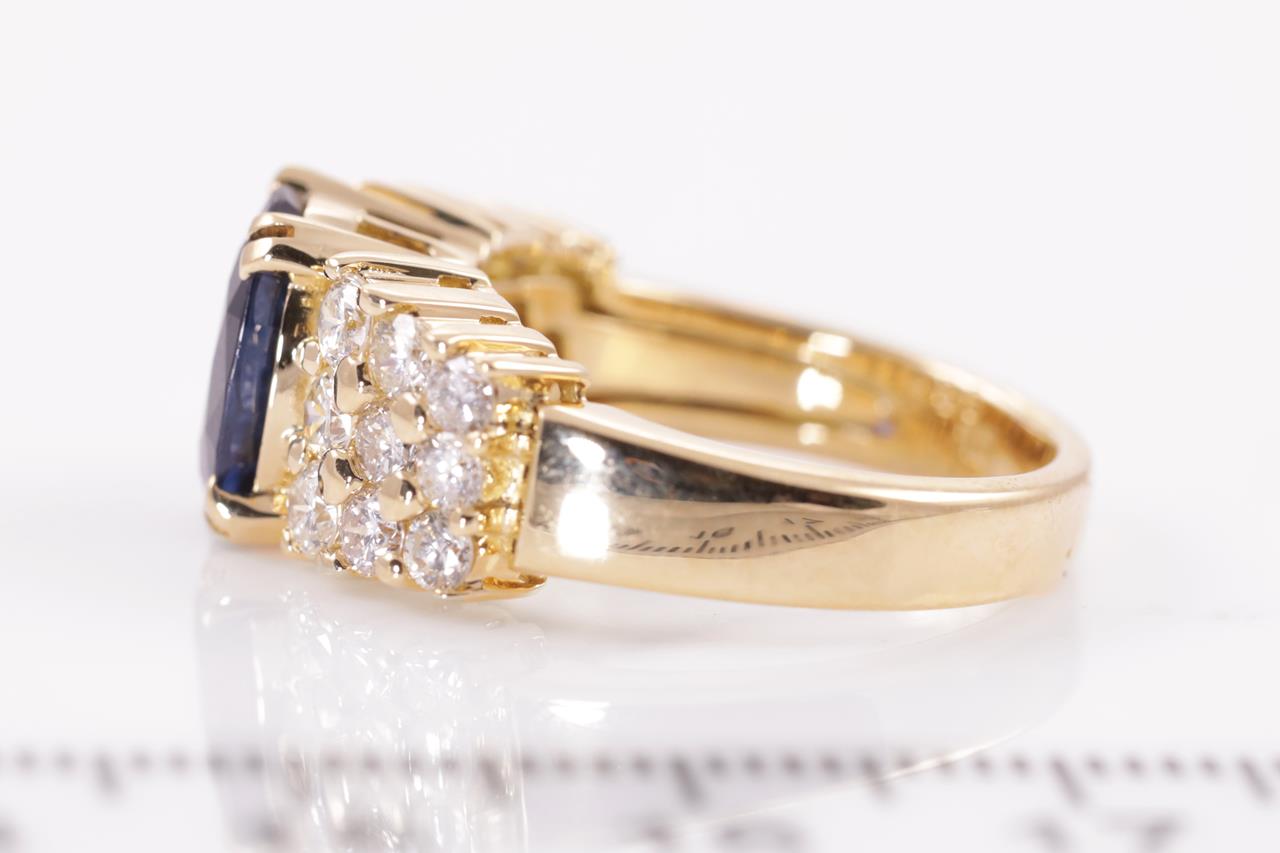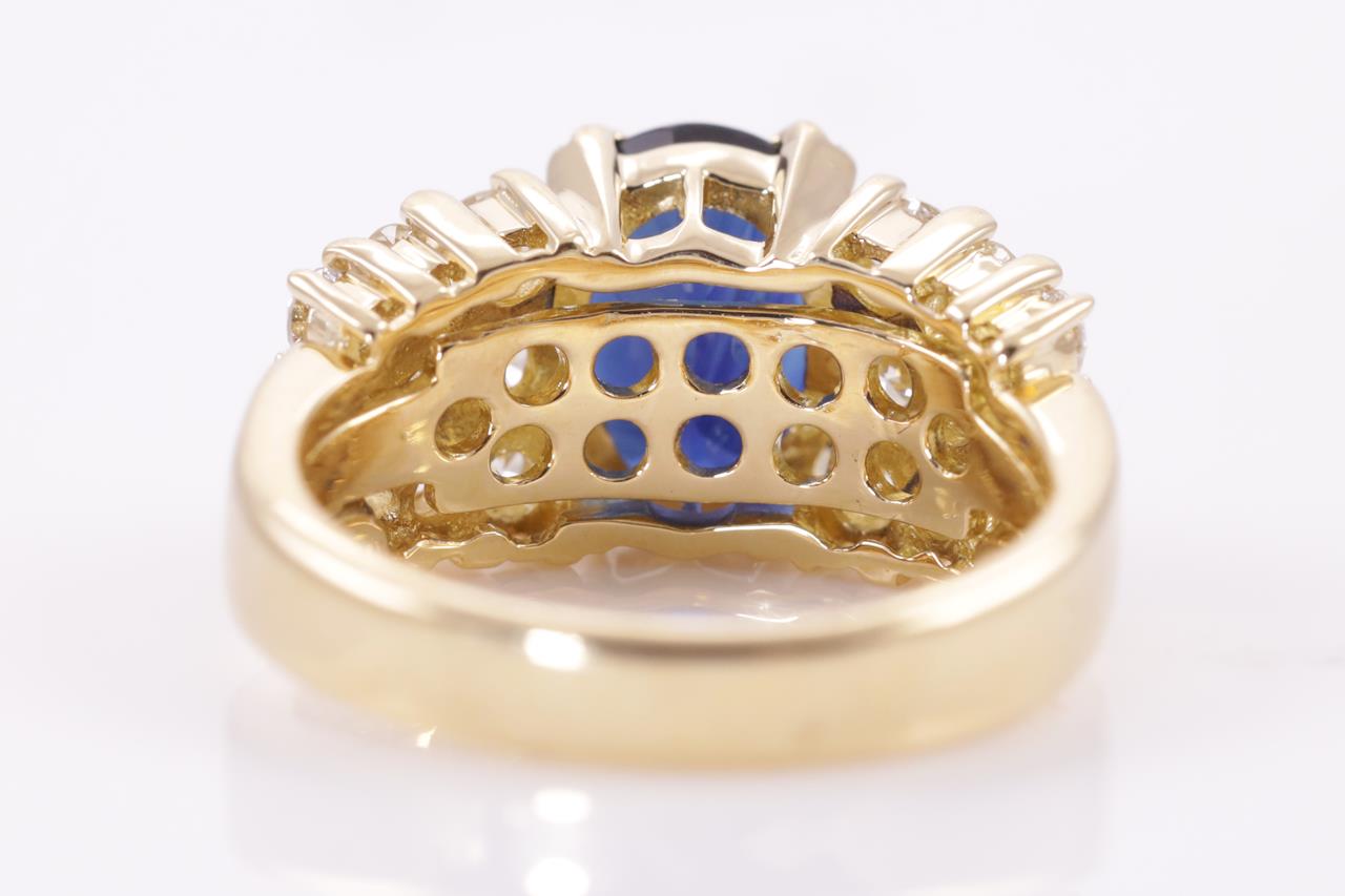 Sapphire and Diamond Ring with oval shape blue Sapphire of 2.85ct and round Diamonds totalling 1.09cts (Estimated grading: H SI). 18ct yellow gold. Ring size L - can be resized up by a maximum of 3 sizes, down with ring clip. Weight: 8.7g. With certificate #414955. (Pre-owned)