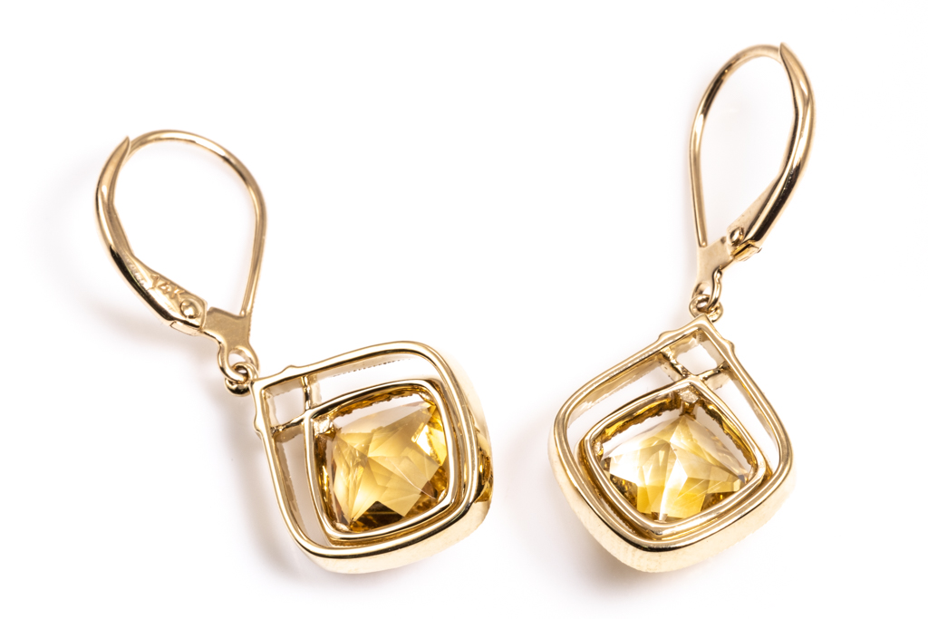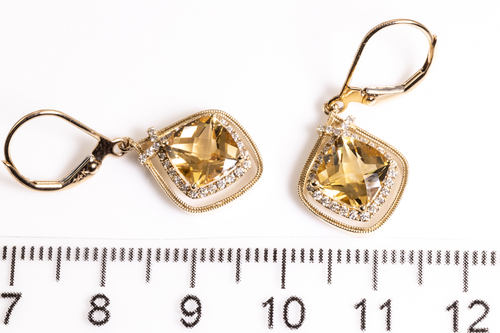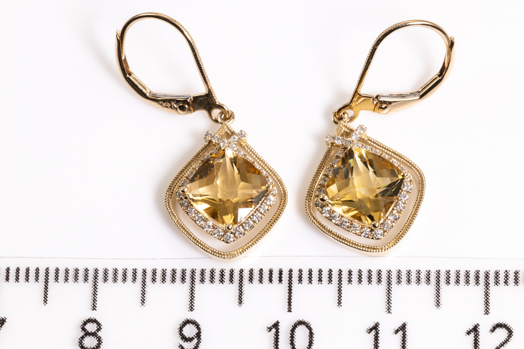 Citrine and Diamond earrings with cushion Citrine totalling 2.86cts and round Diamond totalling 0.22cts. 14ct yellow gold. Weight: 3.3g. (New)