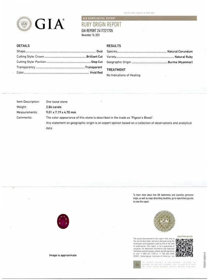 A Loose oval shape unheated Burmese Pigeon's blood (Vivid Red) Ruby of 2.86ct (with GIA report #2417221705). (New)