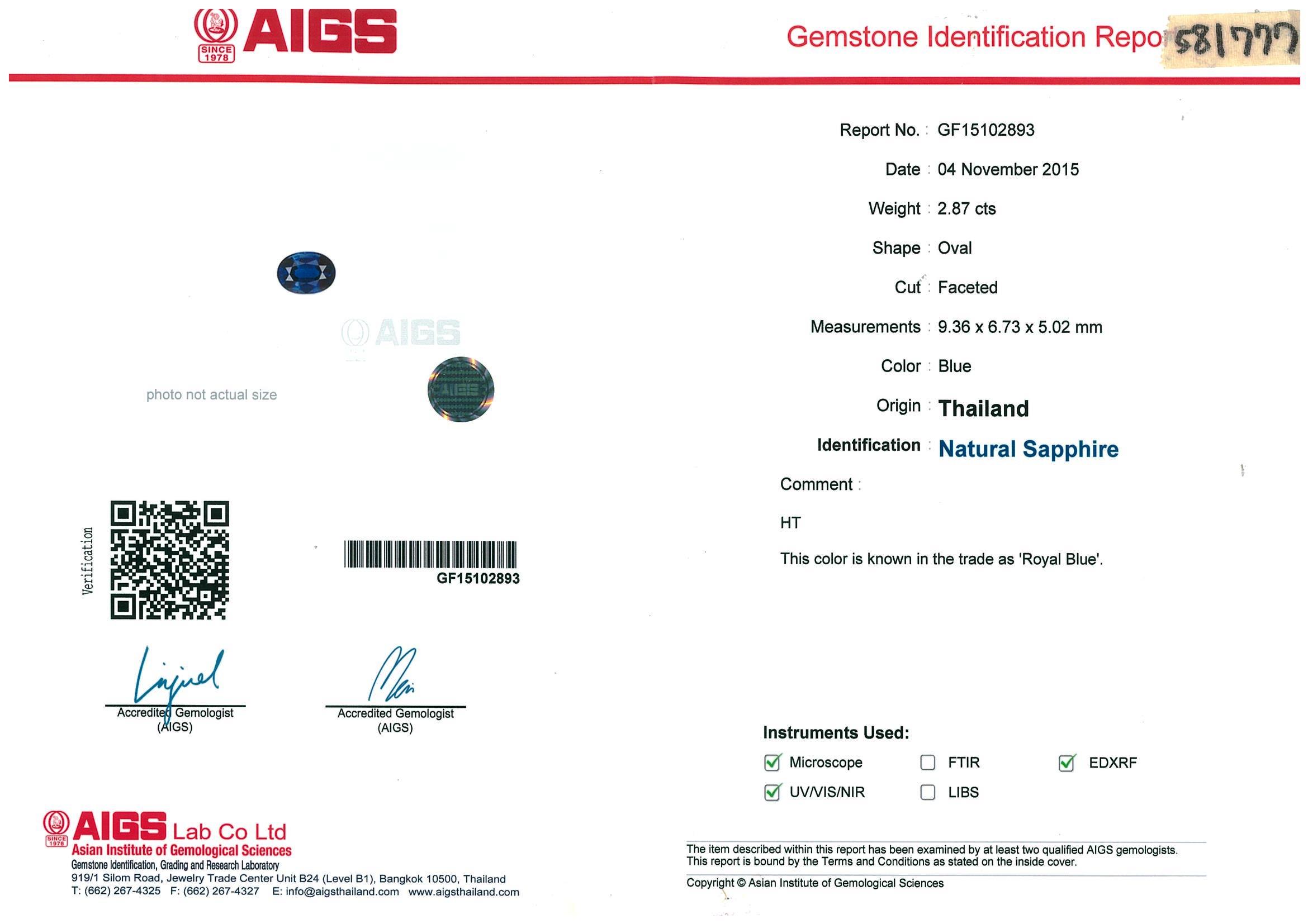 Sapphire and Diamond ring with an oval Royal Blue Thai Sapphire of 2.87ct (With AIGS report #15102893) and Diamonds totalling 1.65cts (Estimated grading: G VS). Platinum. Ring size L. Weight: 8g. (Pre-owned)