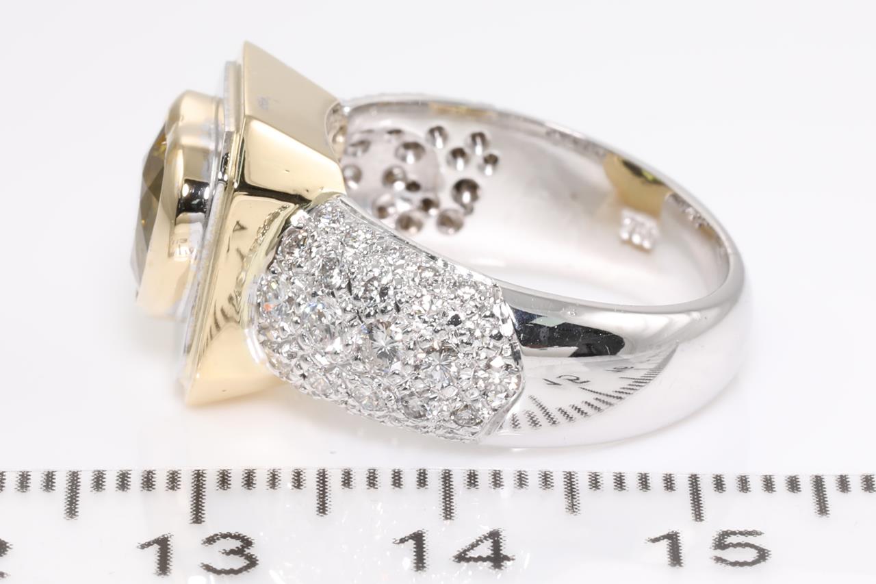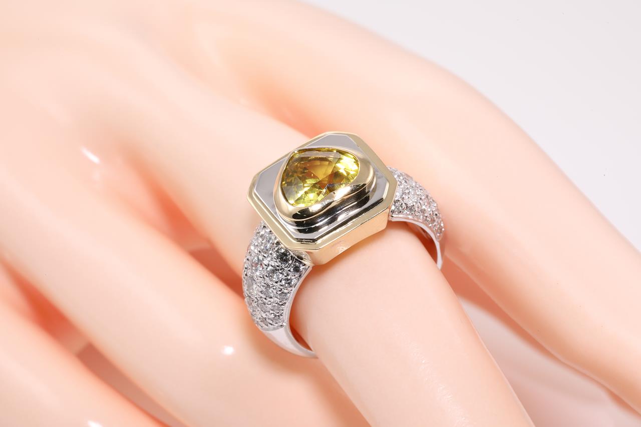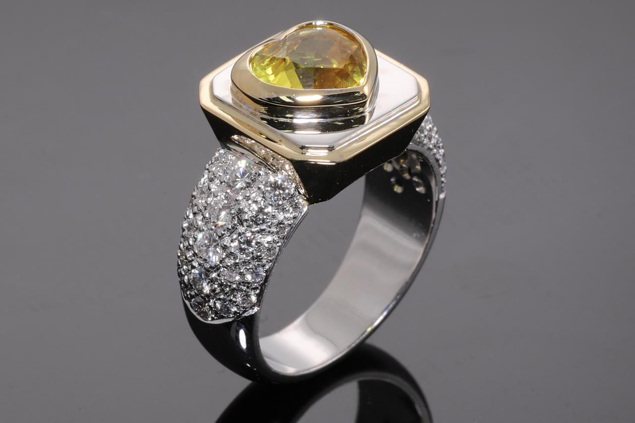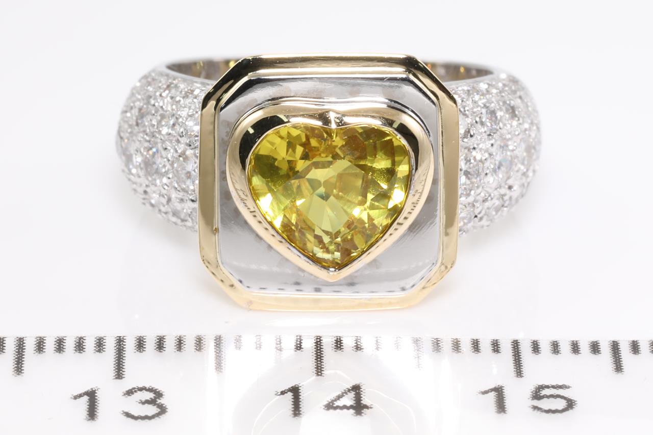 Sapphire Diamond ring with heart shape yellow Sapphire of 2.87ct and round Diamonds totalling approximately 0.75cts (Estimated grading: G-H VS-SI). 18ct yellow and white gold. Ring size M. Weight: 13.5g (Pre-owned)