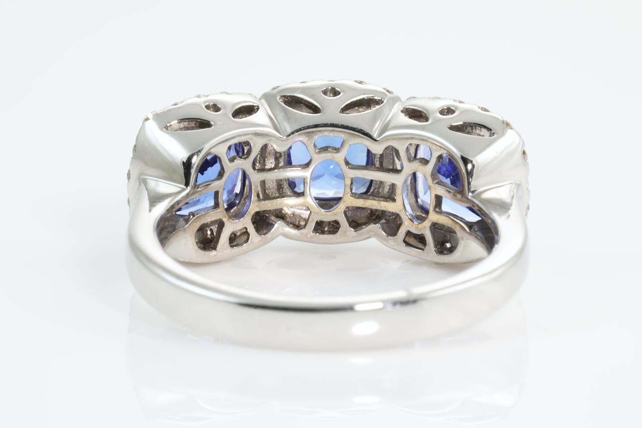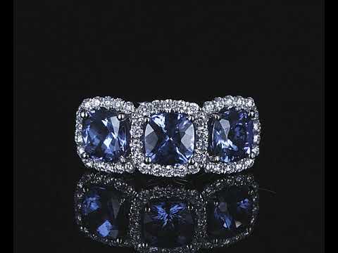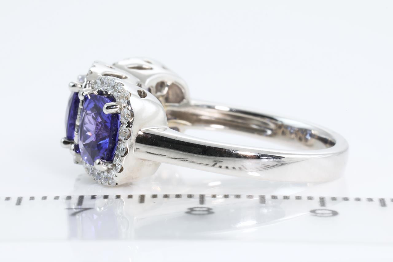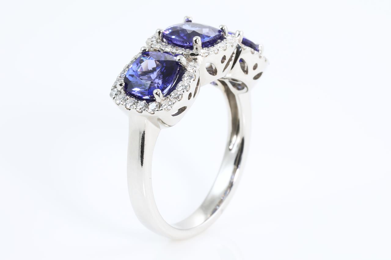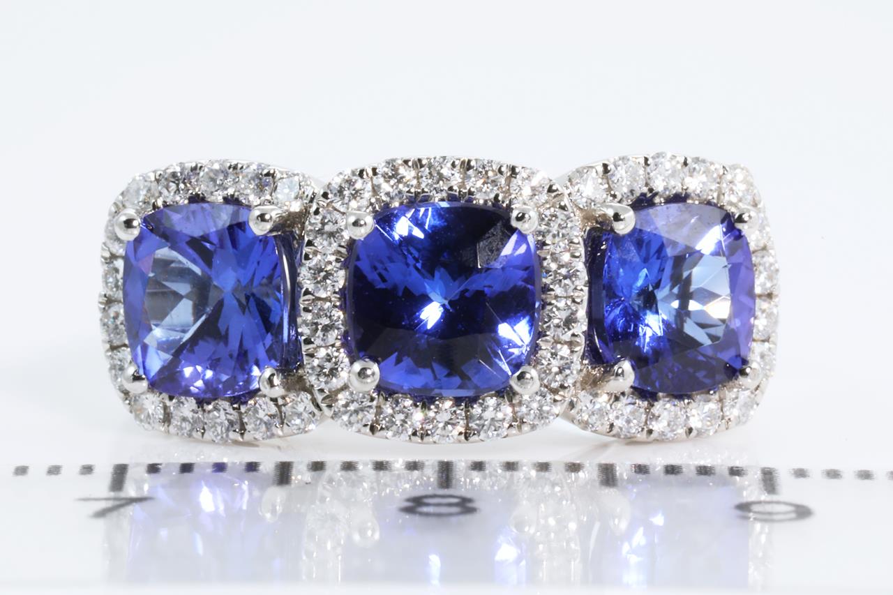 Tanzanite and Diamond ring with 3 cushion cut Tanzanites totalling 2.89cts and round Diamonds totalling 0.49cts (Estimated grading: H SI). 18ct white gold. Ring size N1/2 - Note this ring cannot be resized. Weight: 6.4g (As New)