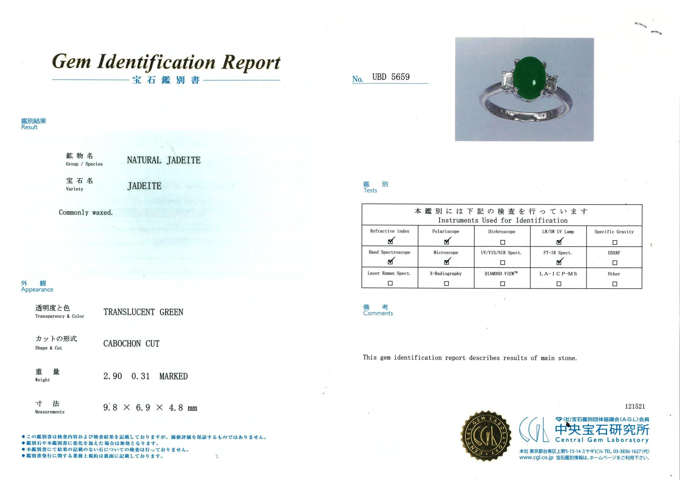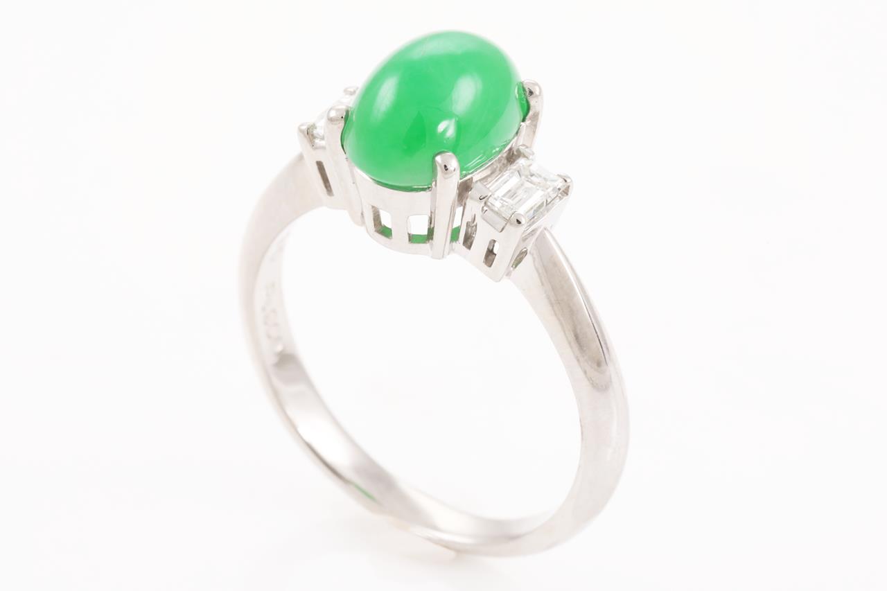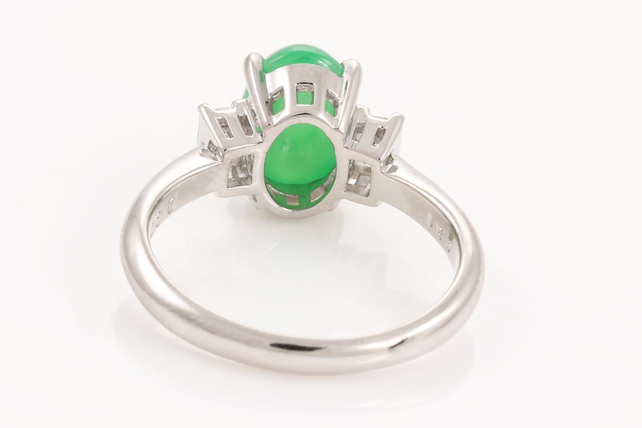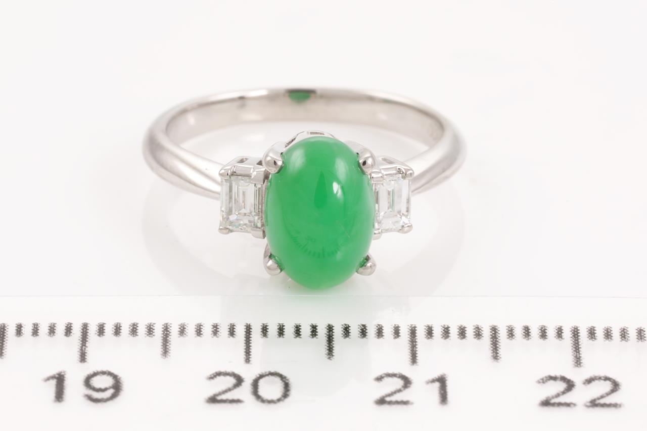 Jade and Diamond Ring with oval cabochon cut translucent green natural Type A Jadeite Jade of 2.90ct and 2 baguette cut Diamonds totalling 0.31cts (Estimated grading: I VS). Platinum. Ring size N. Weight: 5.9g. With Gem Identification Report #UBD5659. (Pre-owned)