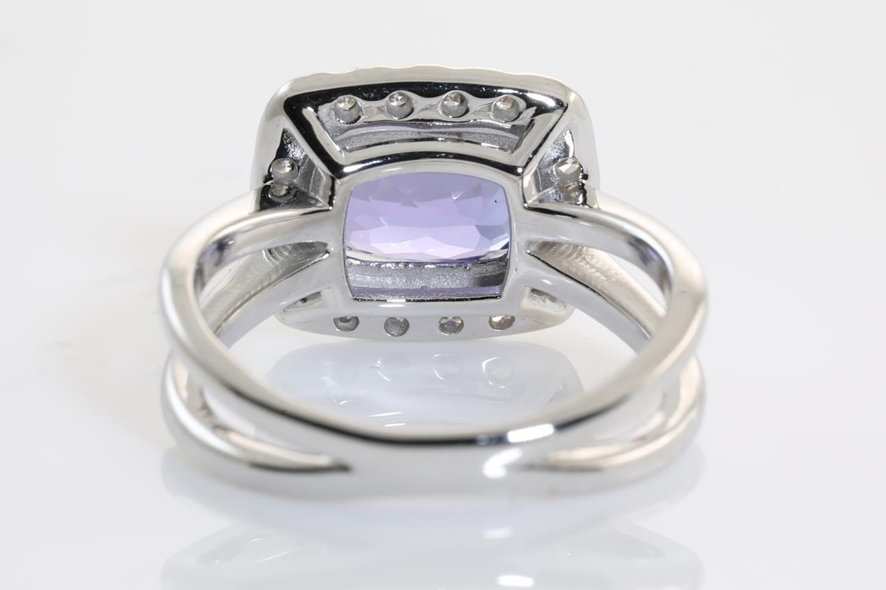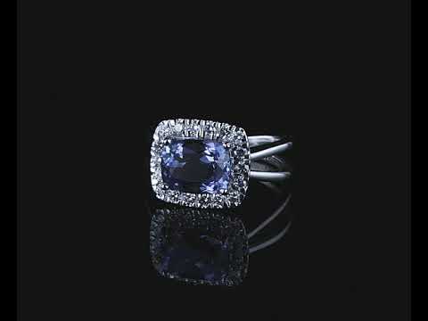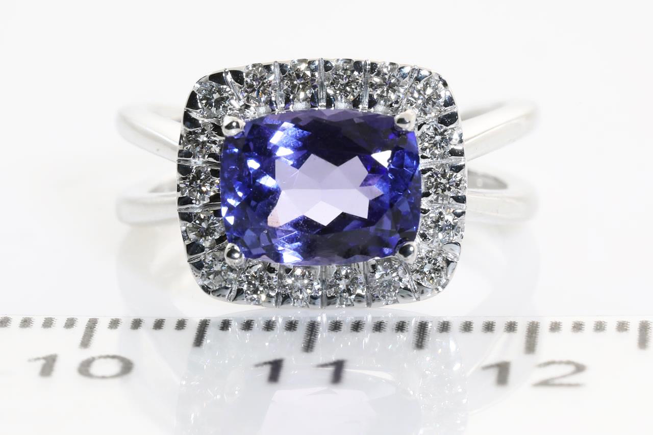 Tanzanite and Diamond ring with a cushion cut Tanzanite of 2.92ct and Diamonds totalling 0.42cts (Estimated grading: I SI). 18ct white gold. Ring size M. Weight: 6.3g. (As new)