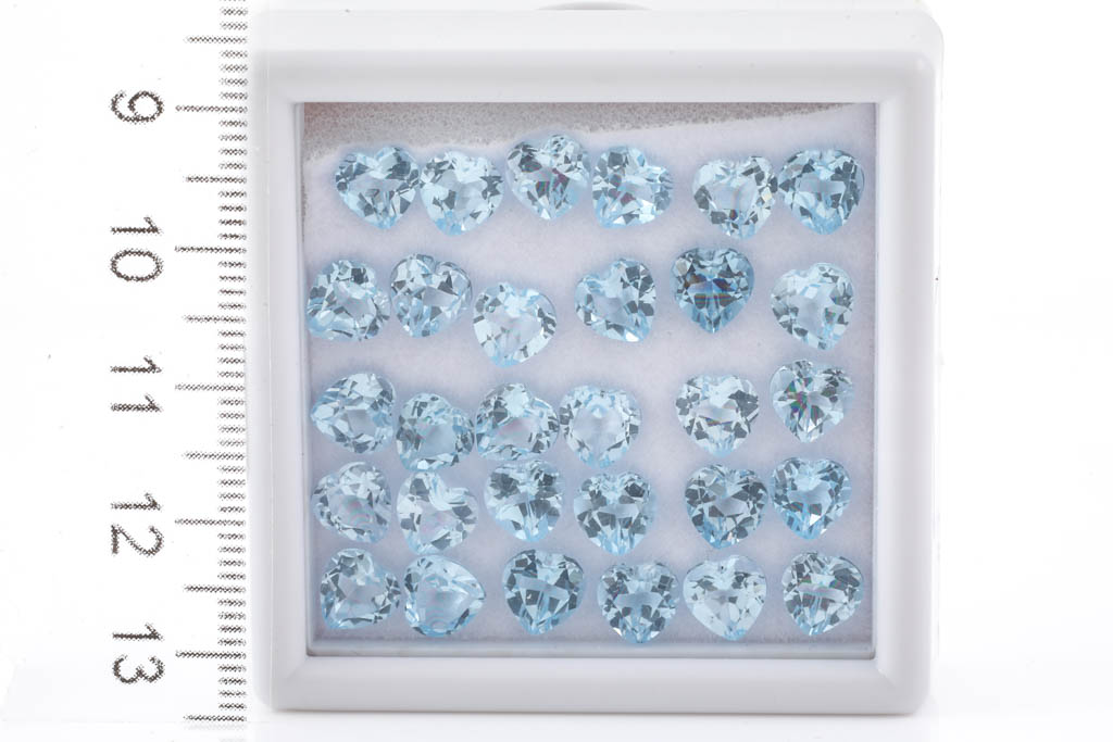 A loose parcel of approximately 30 heart shape blue Topaz totalling 29.30cts. Measuring approximately 6mm. (As New)