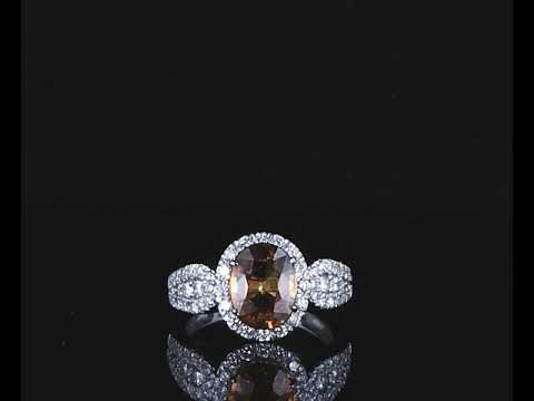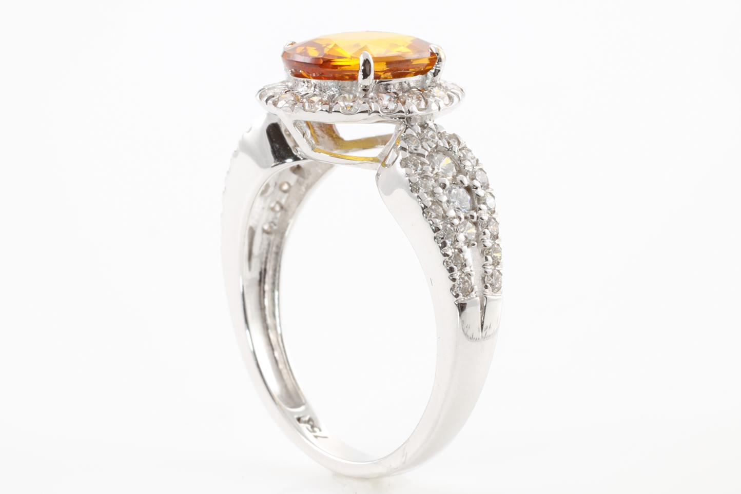 Sapphire and Diamond ring with an oval orange Sapphire of 2.94ct and round Diamonds totalling 0.70cts (Estimated grading: H SI). 18ct white gold. Ring size N -ring resizing up is not recommended, can only be resized down with ring clip. Weight: 5g (As New)