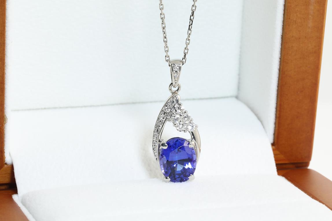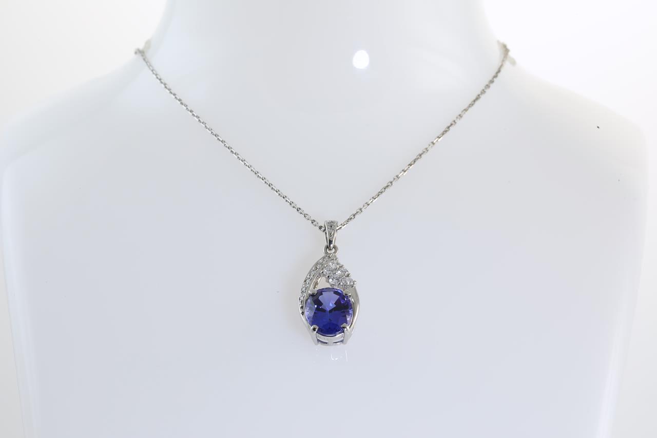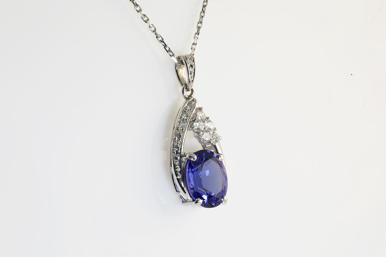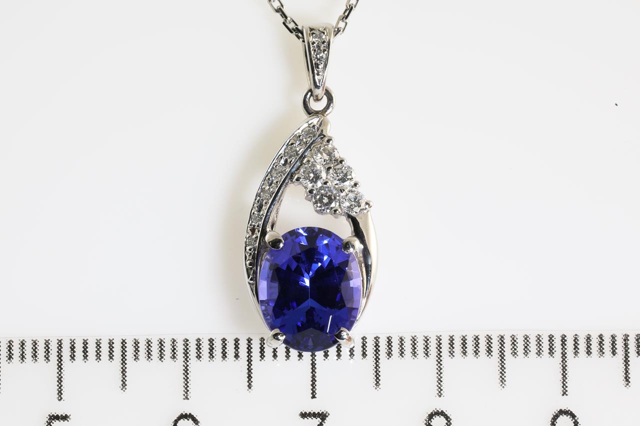 Tanzanite and Diamond pendant with an oval Tanzanite of 2.96ct and Diamonds totalling 0.24cts. Platinum with adjustable 45cm chain. Weight: 5.7g. (Pre-owned)