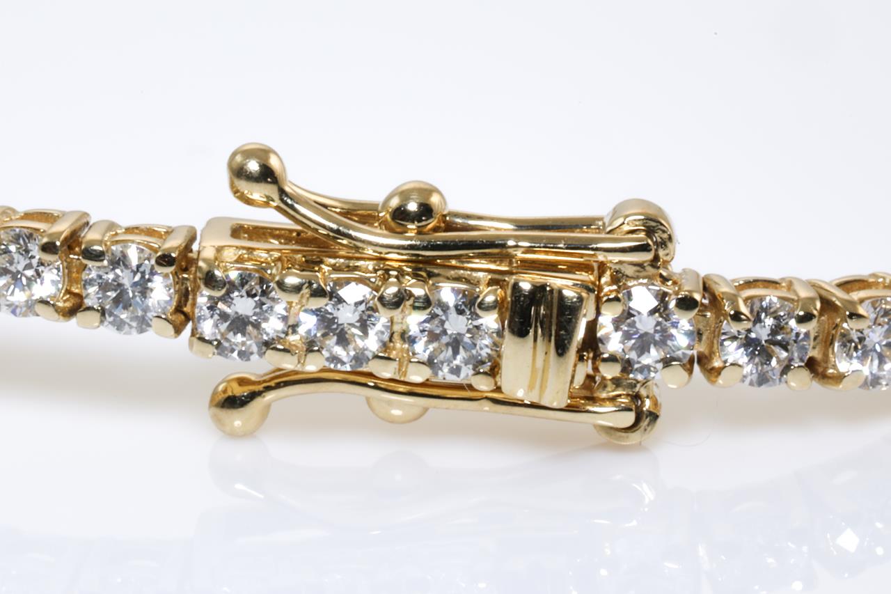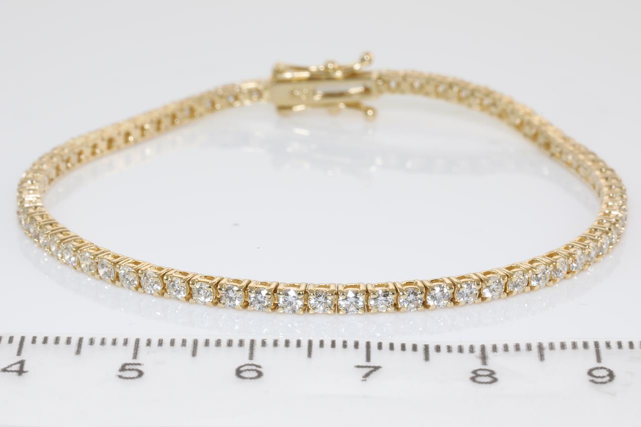 Diamond tennis bracelet with 69 round Diamonds totalling 2.97cts (Estimated grading: I-J SI). 18ct yellow gold. Length: 18.5cm Weight: 8.3g (New)