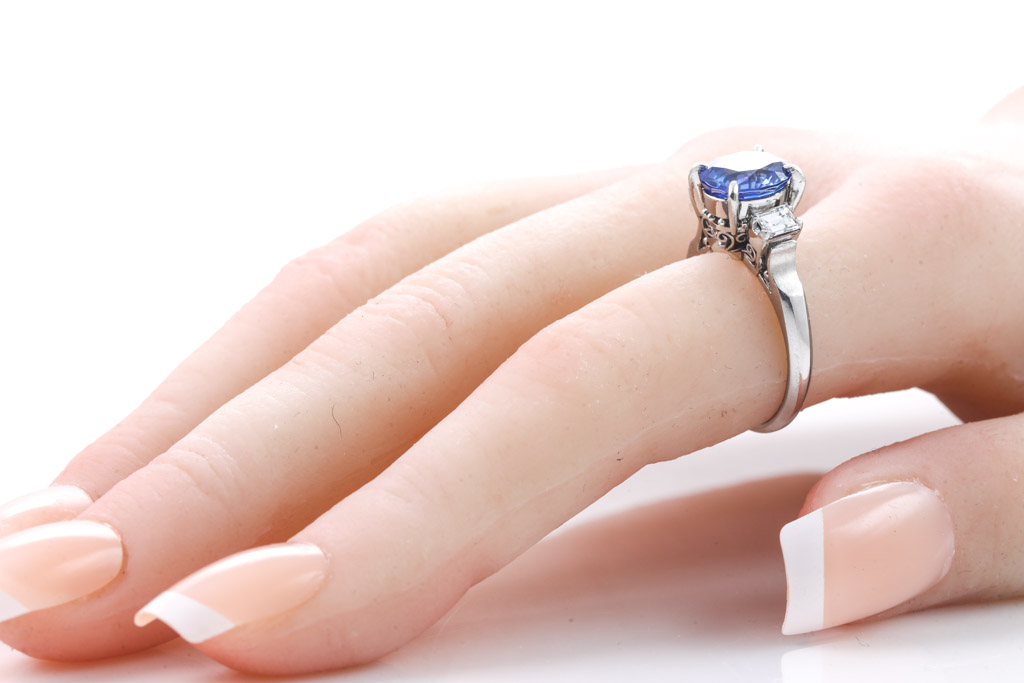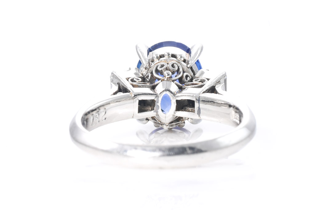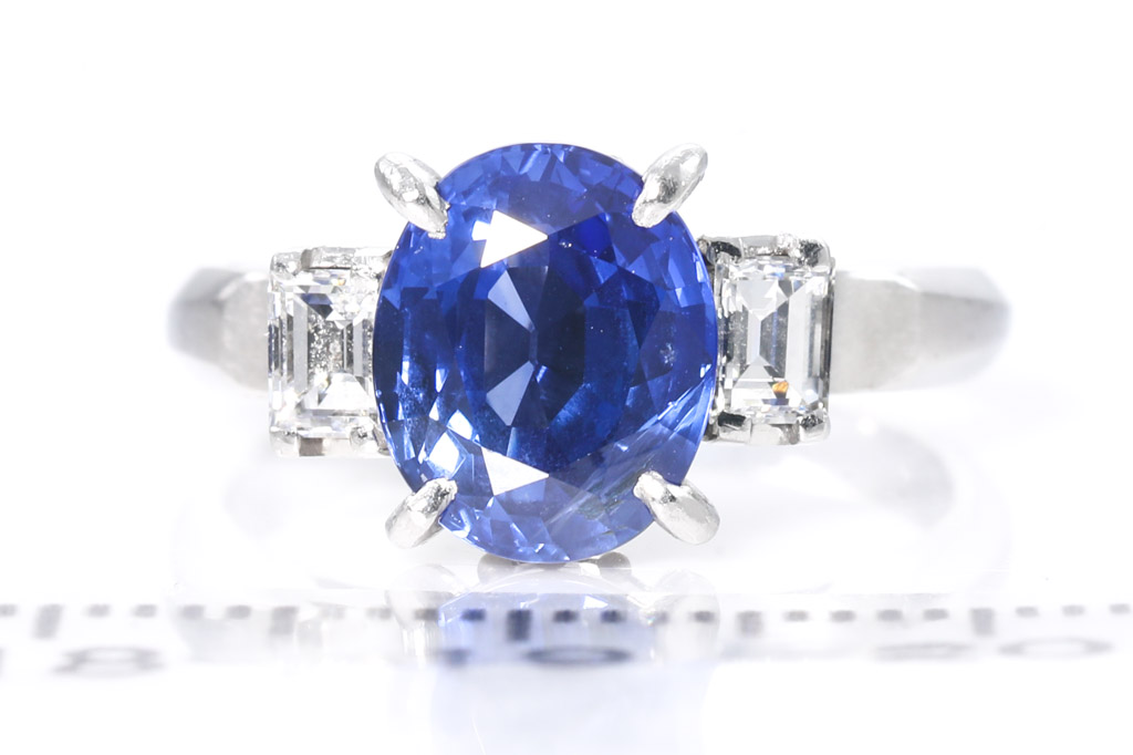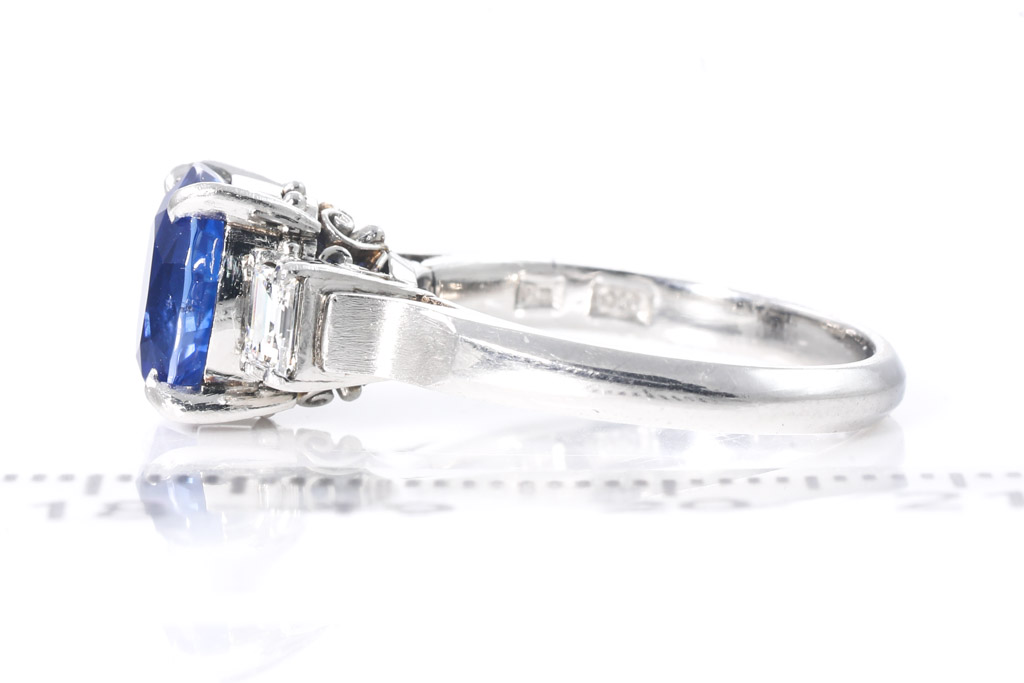 Sapphire and Diamond ring with oval shape blue Sapphire of 2.97ct and 2 emerald cut Diamonds totalling 0.41cts (Estimated grading: G VS-SI). Platinum. Ring size L. Weight: 7.4g. (Pre-owned)