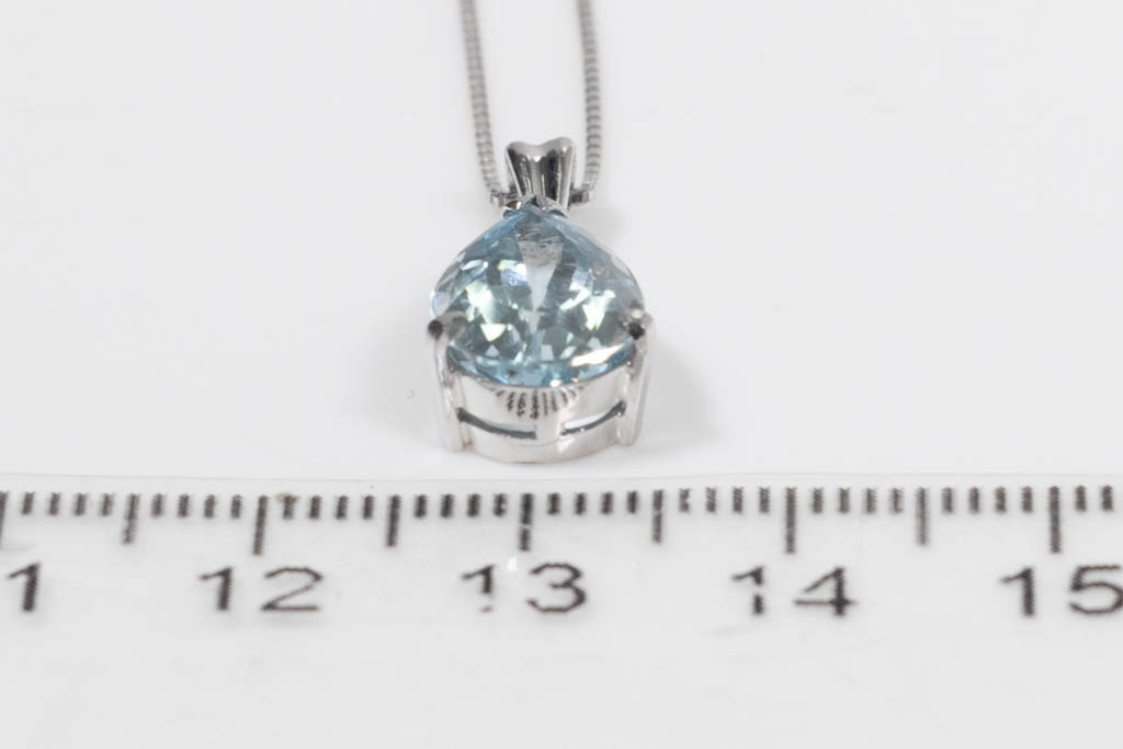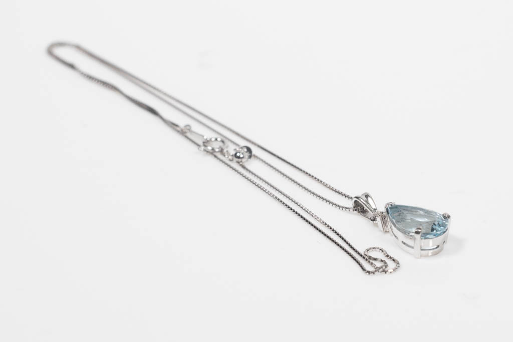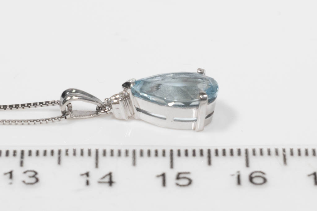 Aquamarine and Diamond pendant with pear shape Aquamarine of 2.98ct and round Diamond of 0.05ct. Platinum with 18ct white gold adjustable 44cm chain. Weight: 4.2g. (Pre-owned)