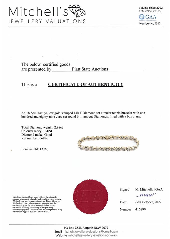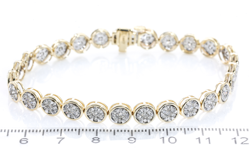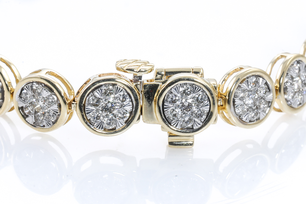 Diamond bracelet with 189 round Diamonds totalling 2.98cts (Estimated grading: H-I SI). 14ct yellow gold. Length: 18.5cm. Weight: 13.9g. With Certificate #416280. (New)
