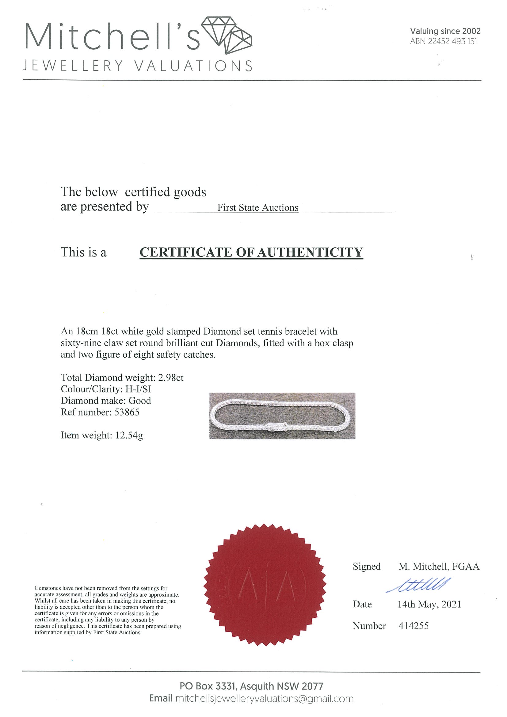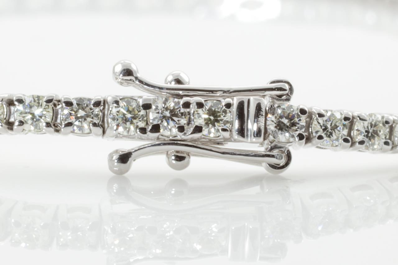 Diamond tennis bracelet with 69 round Diamonds totalling 2.98cts (Estimated grading: H-I SI). 18ct white gold. Length: 18cm. Weight: 12.5g. With certificate #414255. (New)