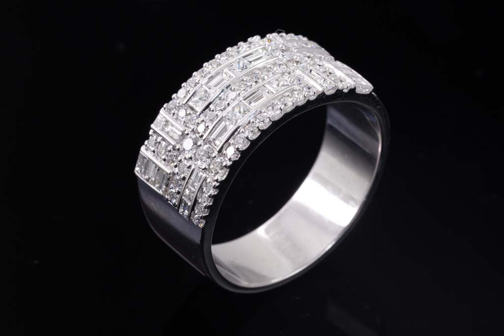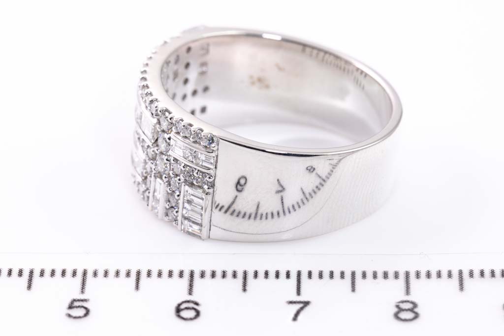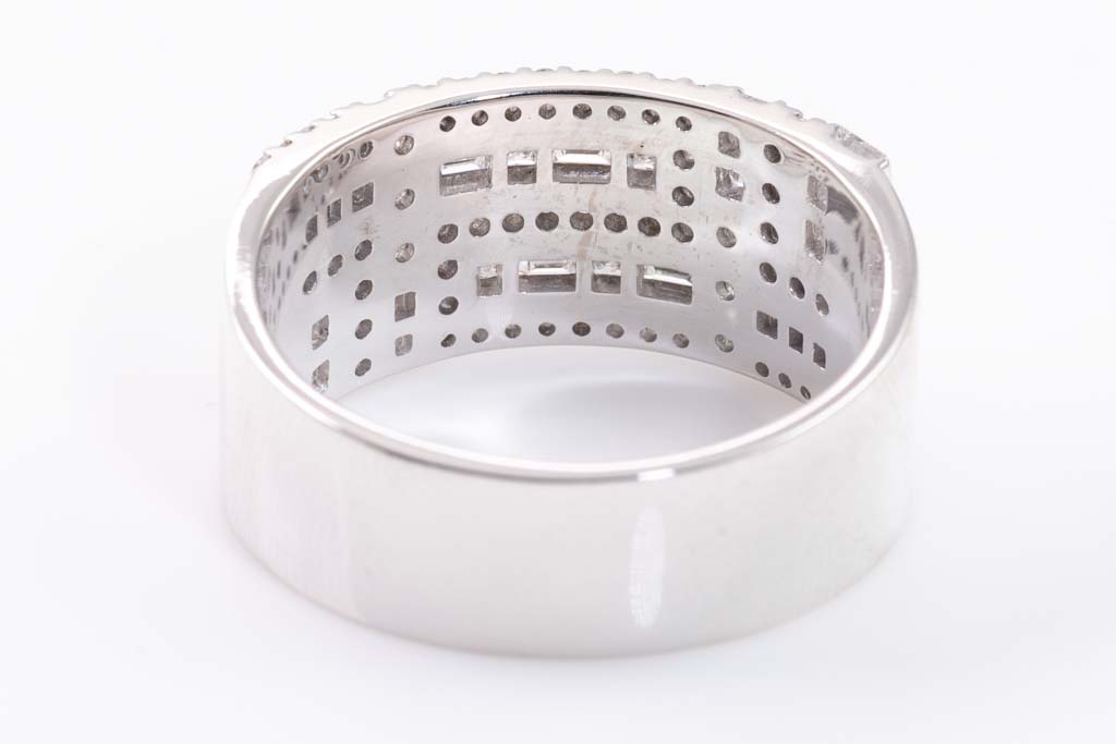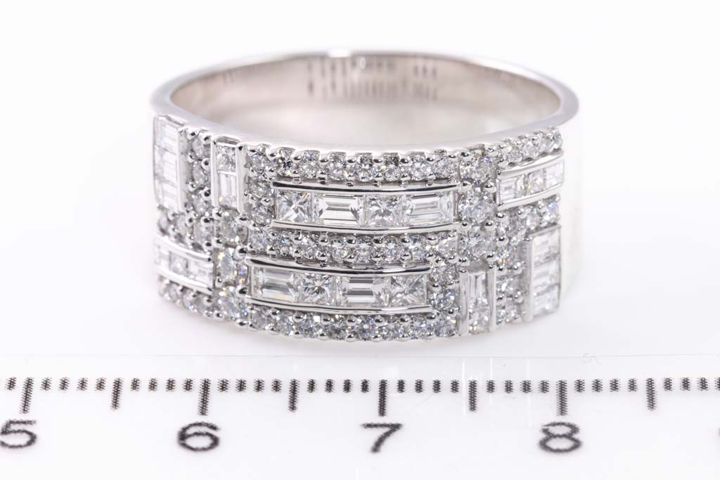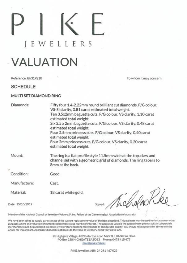 Diamond dress ring with round, baguette and princess cut Diamonds totalling 2.99cts (Estimated grading: F-G VS-SI). 18ct white gold. Ring size Z1/2. With copy of Valuation Certificate dated 15/10/2019. Weight: 16.8g (Pre-owned)