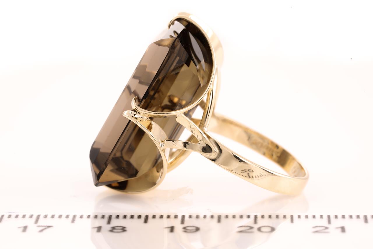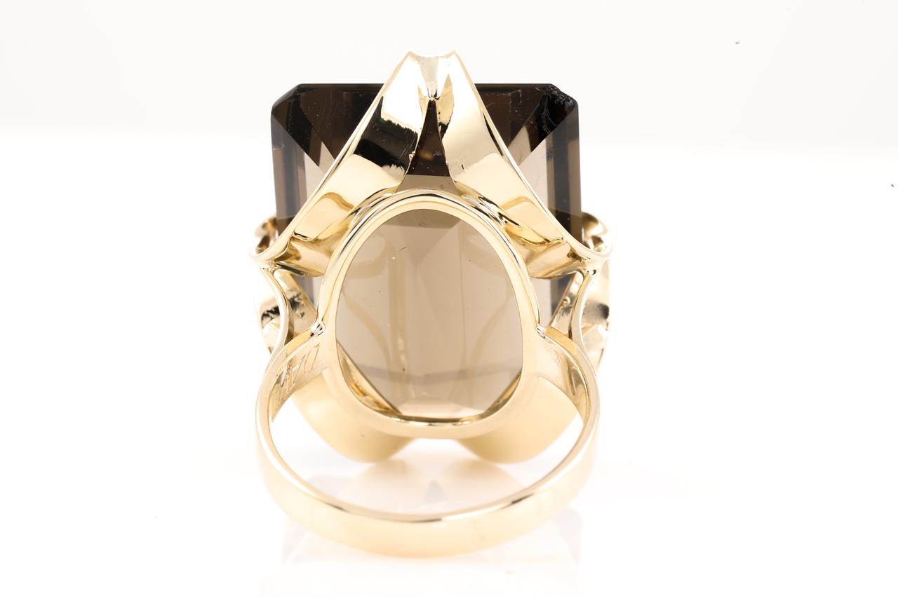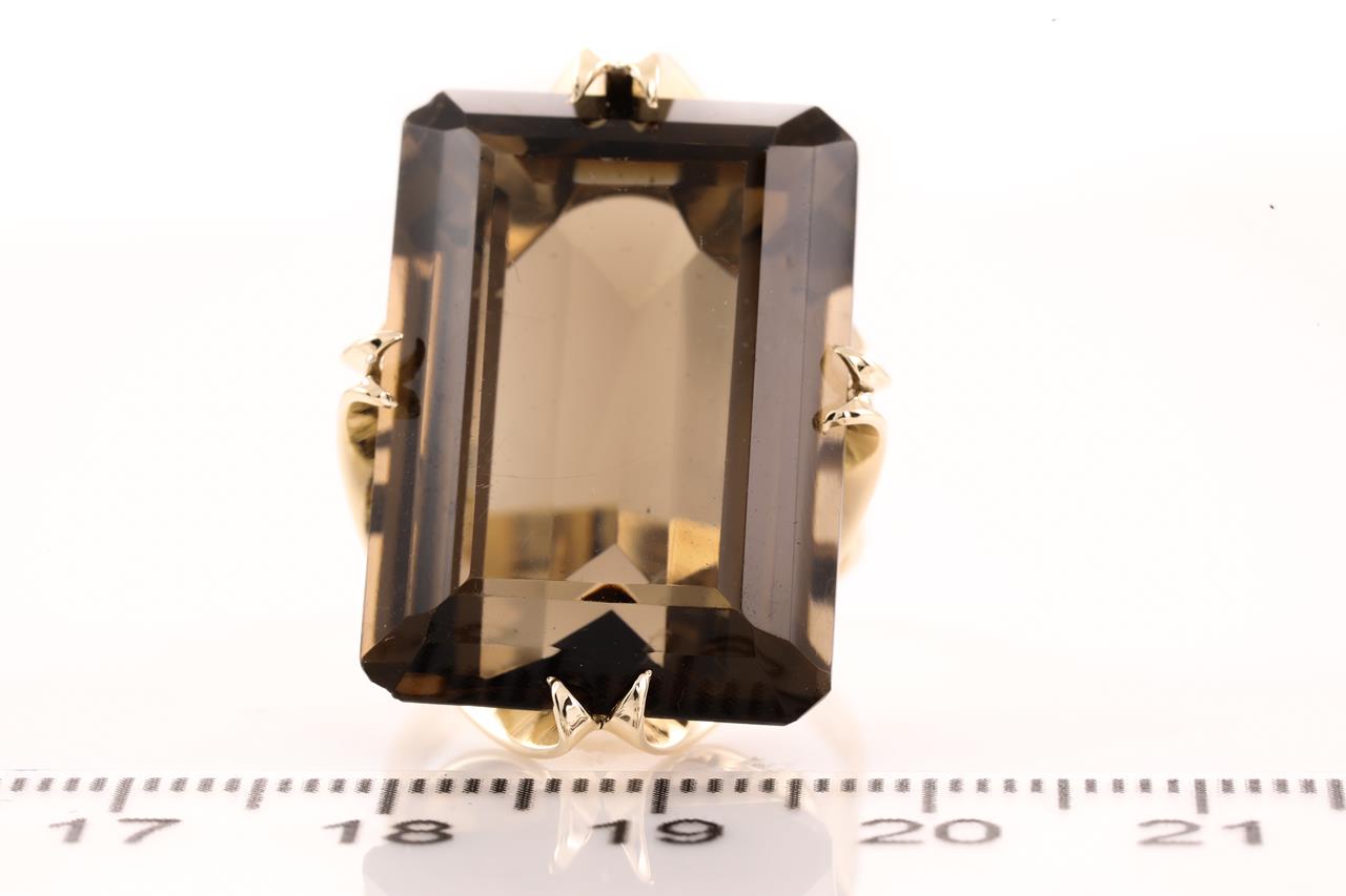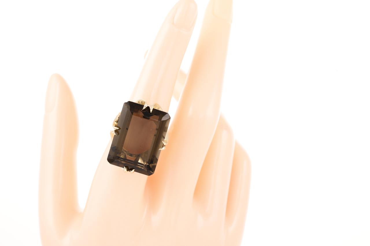 Ring with emerald cut Smoky Quartz of approximately 30.00ct. 9ct yellow gold. Ring size O. Weight 11.2g. (Pre-owned)