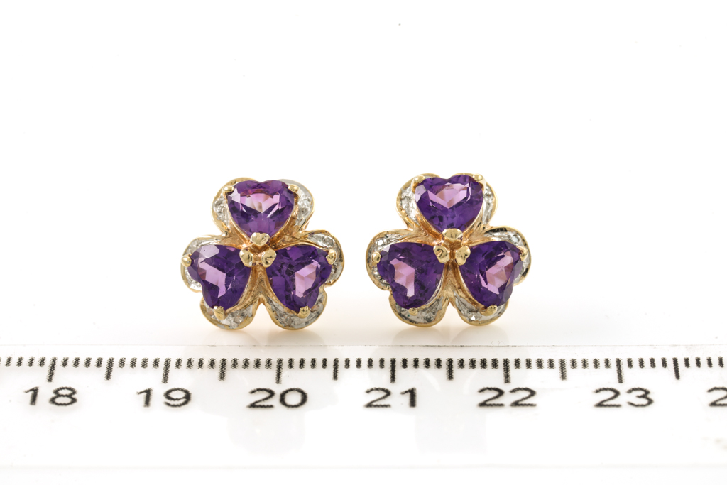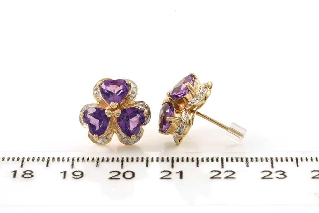 Amethyst and Diamond earrings with heart shaped Amethysts totalling approximately 3.00cts and round Diamonds totallings approximately 0.04cts. 14ct yellow gold with rubber backs. Weight 5.5g. (Pre-owned)
