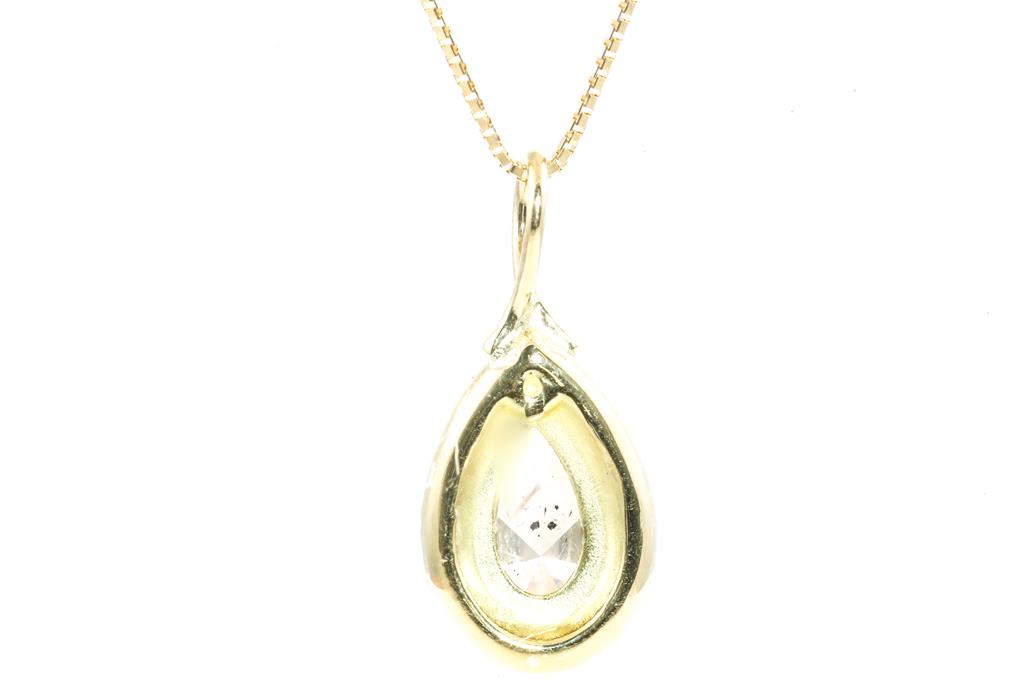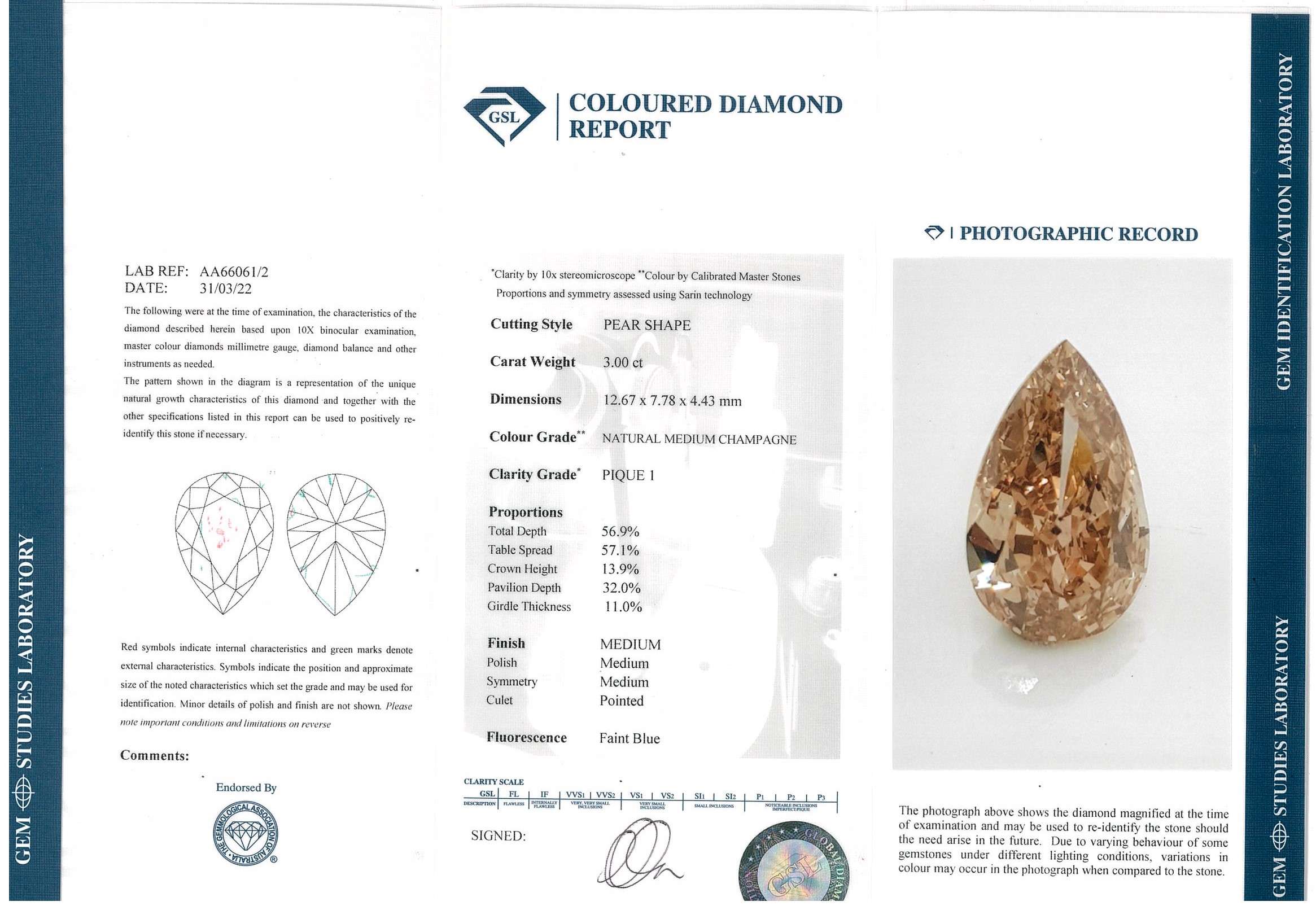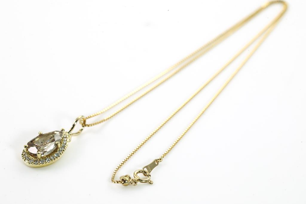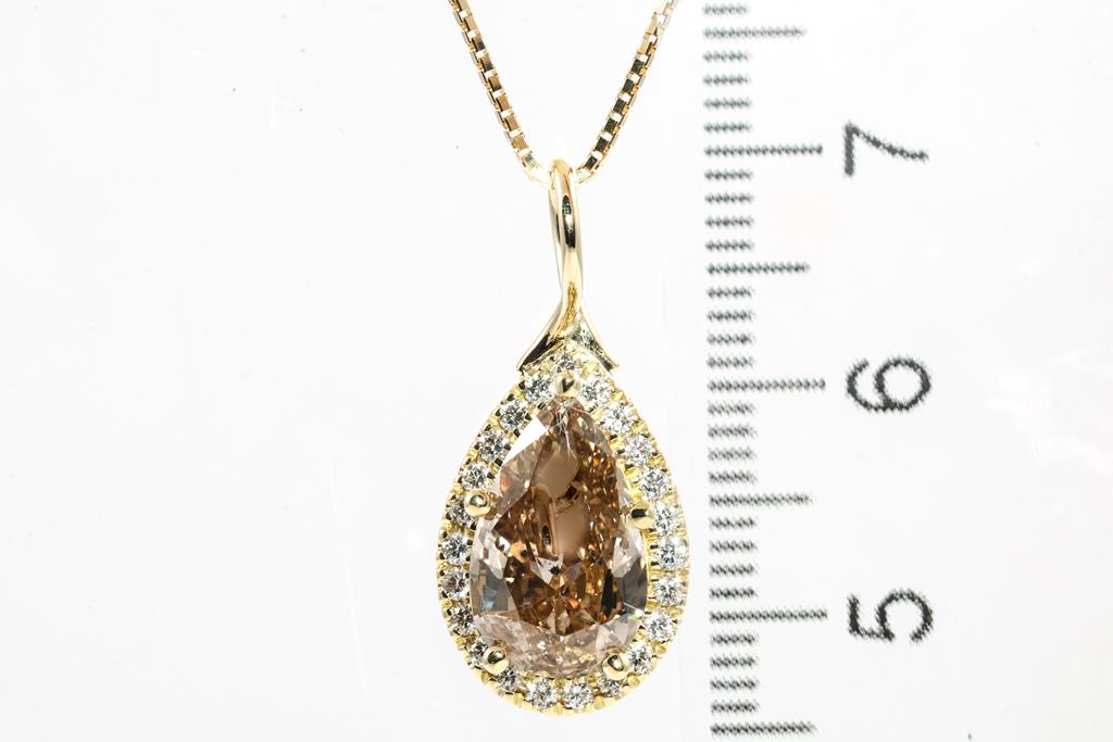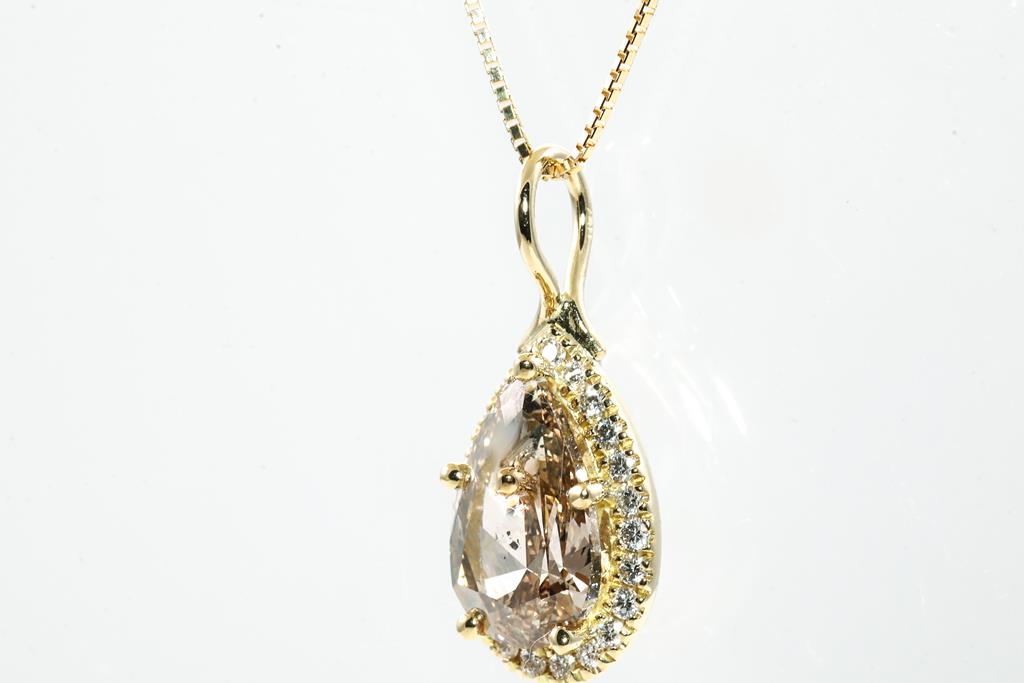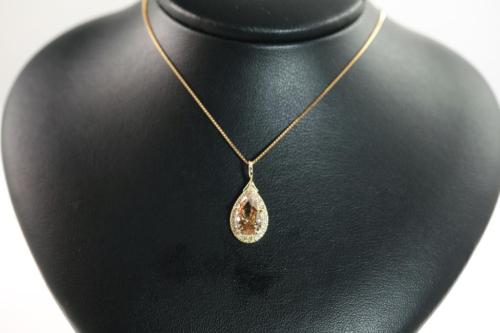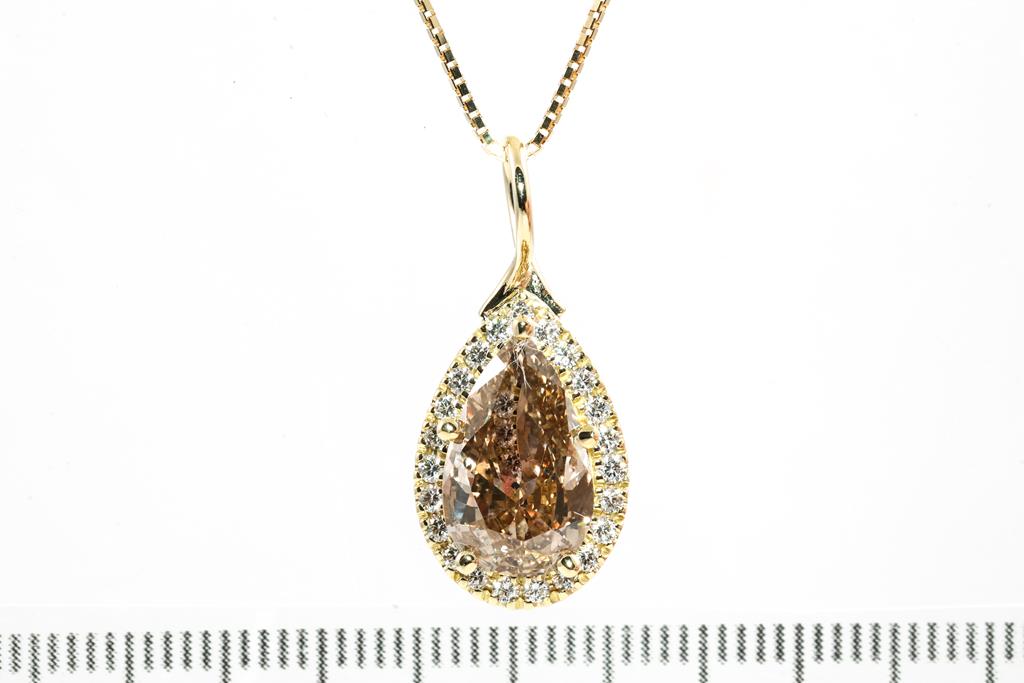Diamond pendant with centre Pear shape Diamond of 3.00ct (With GSL Report graded as Natural Medium Chamgagne P1 #AA66061/2) and surrounding round Diamonds totalling 0.25cts. 18ct yellow gold with 44cm 18ct yellow gold adjustable chain. Weight: 5.7g. (New)