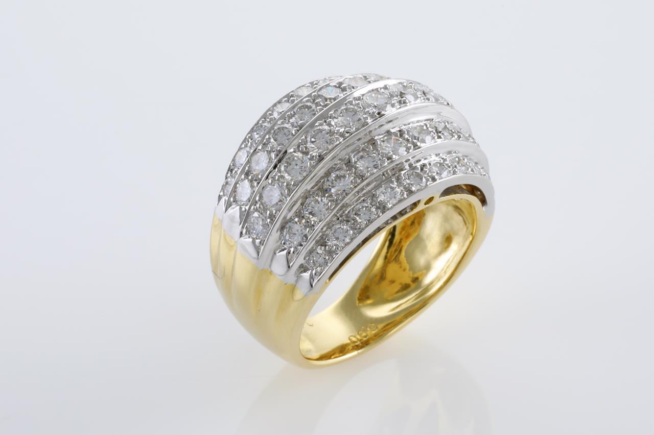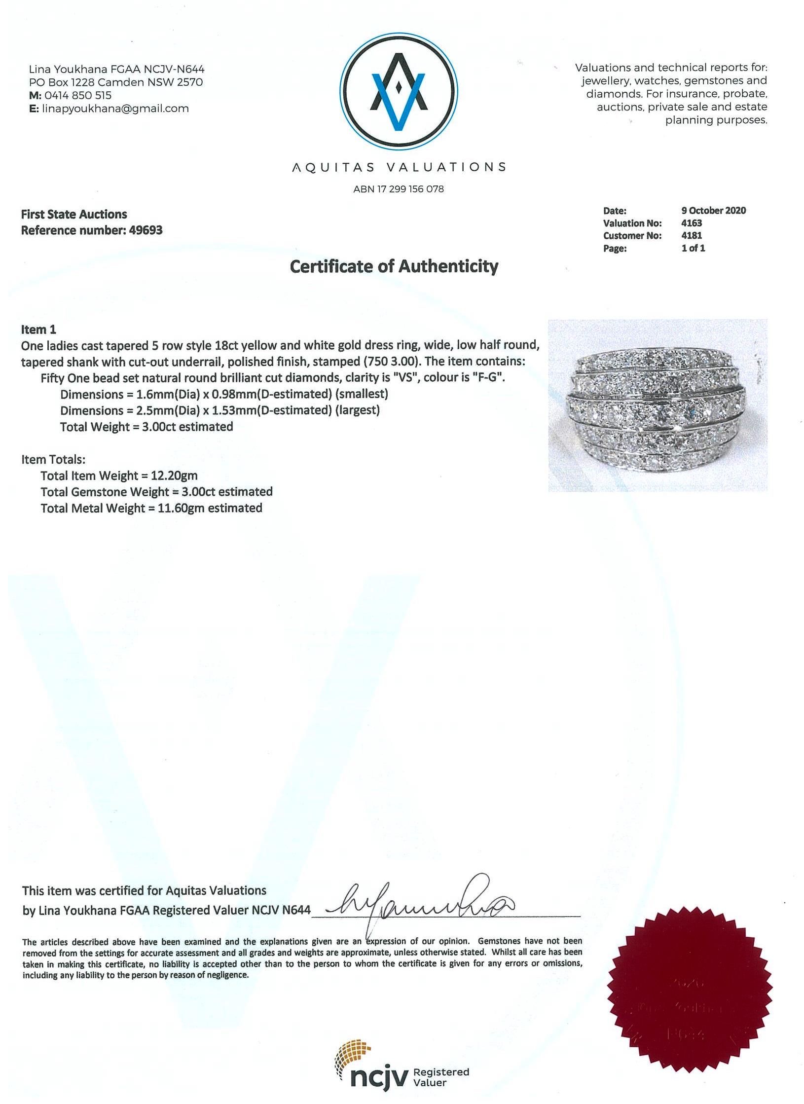 Diamond dress ring with round Diamonds totalling 3.00cts (Estimated grading: F-G VS). 18ct yellow & white gold. Ring size: M1/2 - Note this ring cannot be resized. Weight: 12.2g. With Certificate #4163. (Pre-owned)