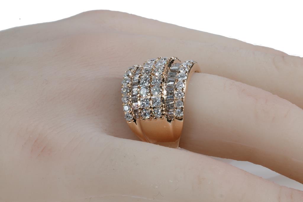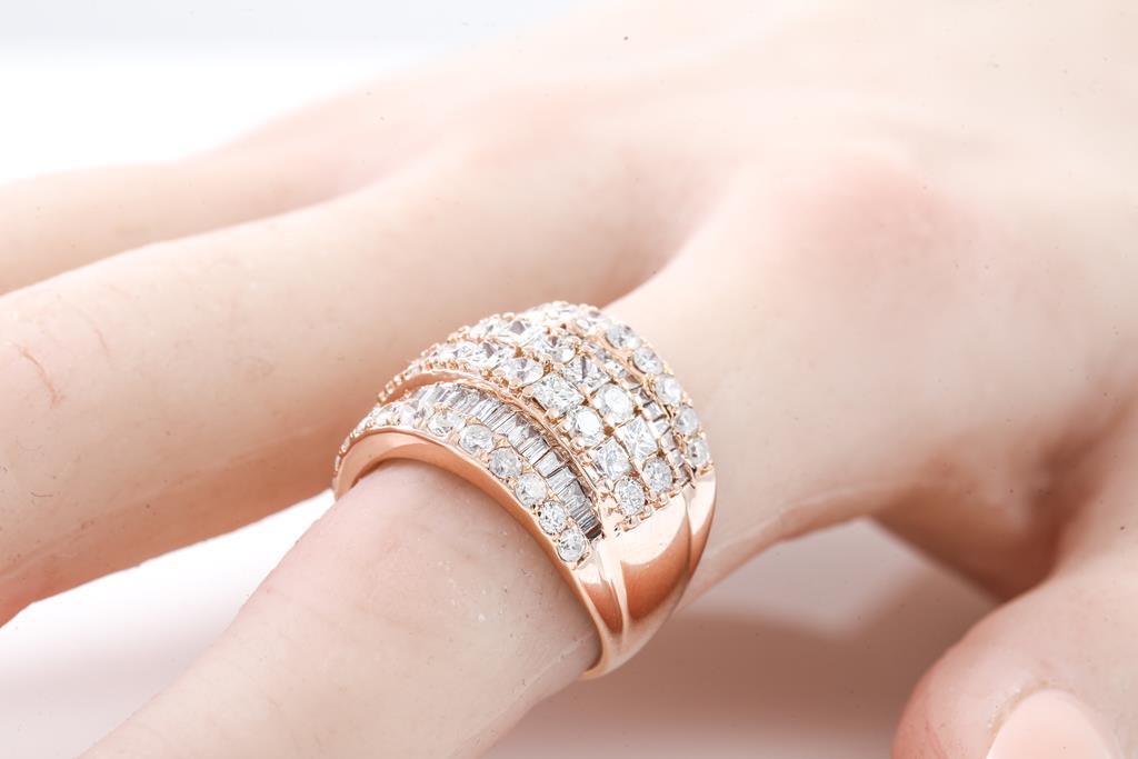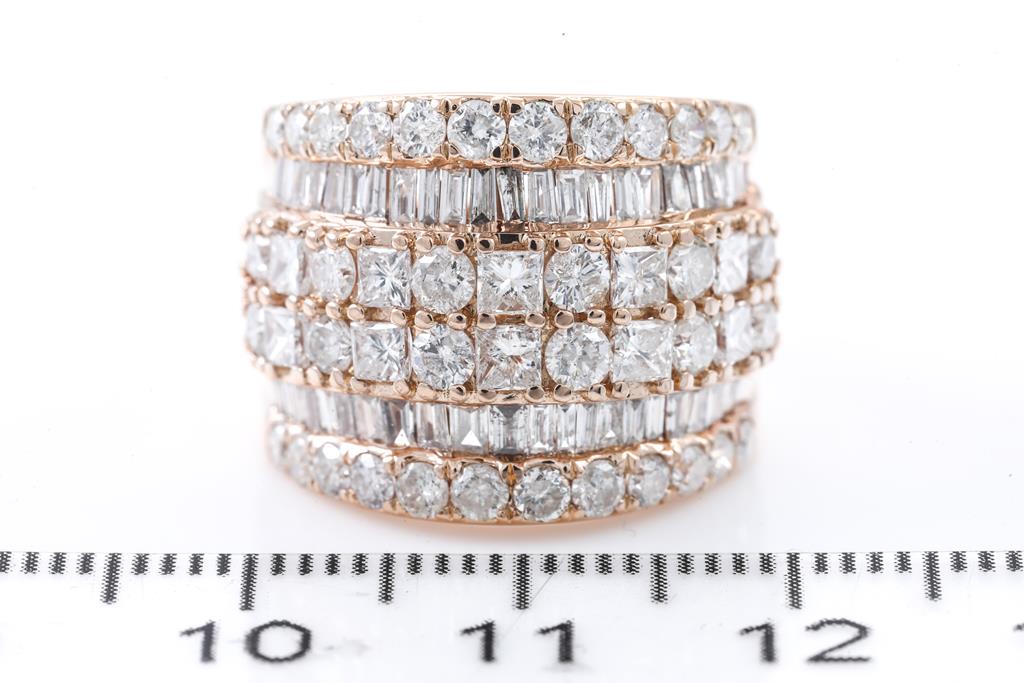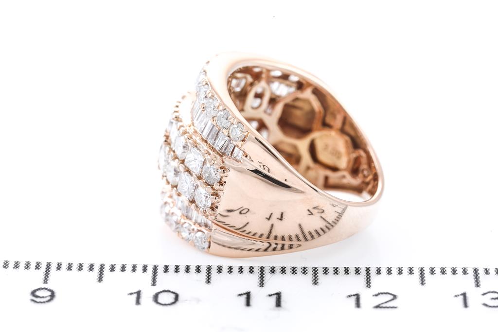 Diamond dress ring with princess, round & baguette cut Diamonds totalling 3.00cts (Estimated grading: H-I SI2-P2). 18ct rose gold. Ring size K - ring resizing is not recommended. Weight: 7.4g. With certificate #415907. (Pre-owned)