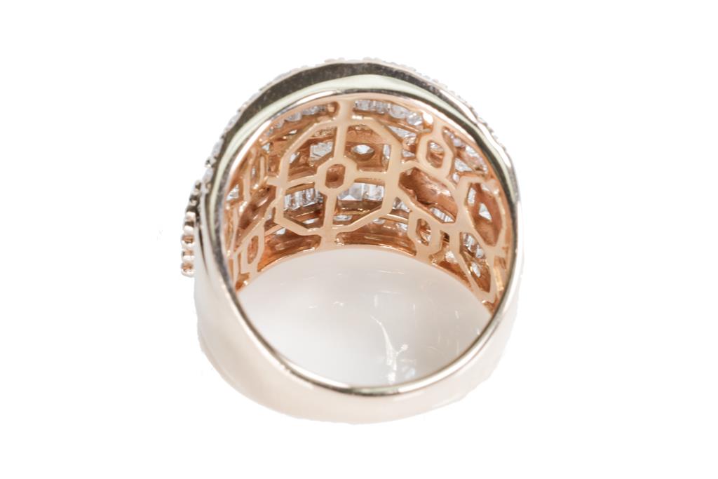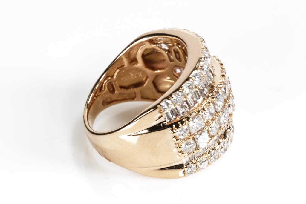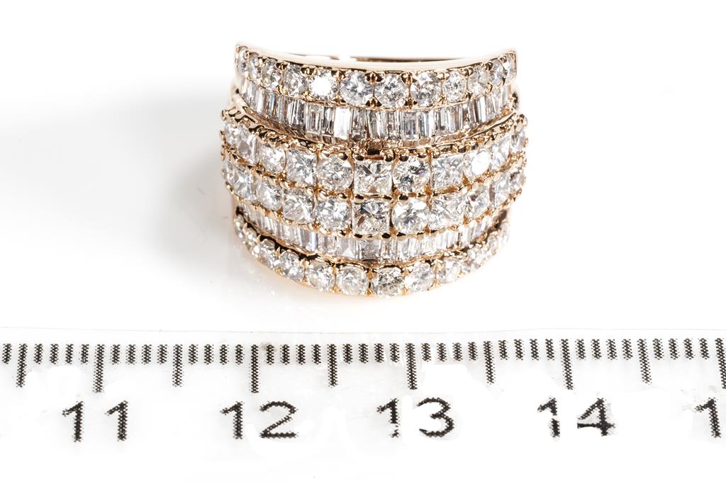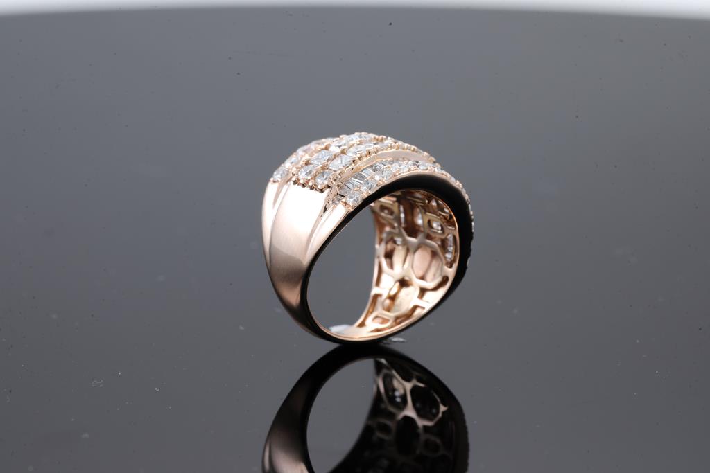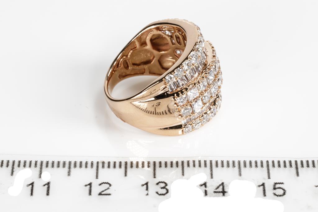 Diamond dress ring with princess, round & baguette cut Diamonds totalling 3.00cts (Estimated grading: H-I SI2-P2). 18ct rose gold. Ring size K - ring resizing is not recommended. Weight: 7.4g. With certificate #415907. (Pre-owned)