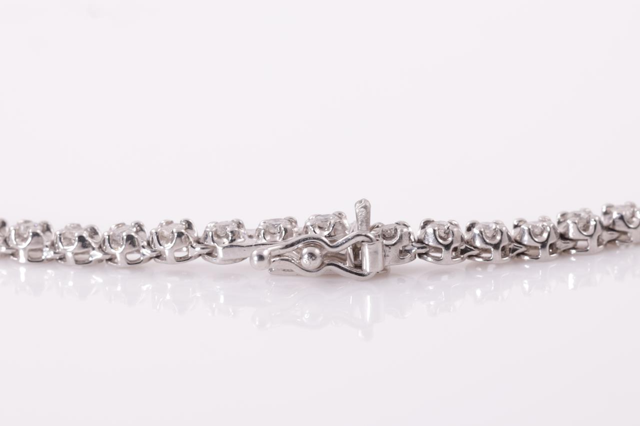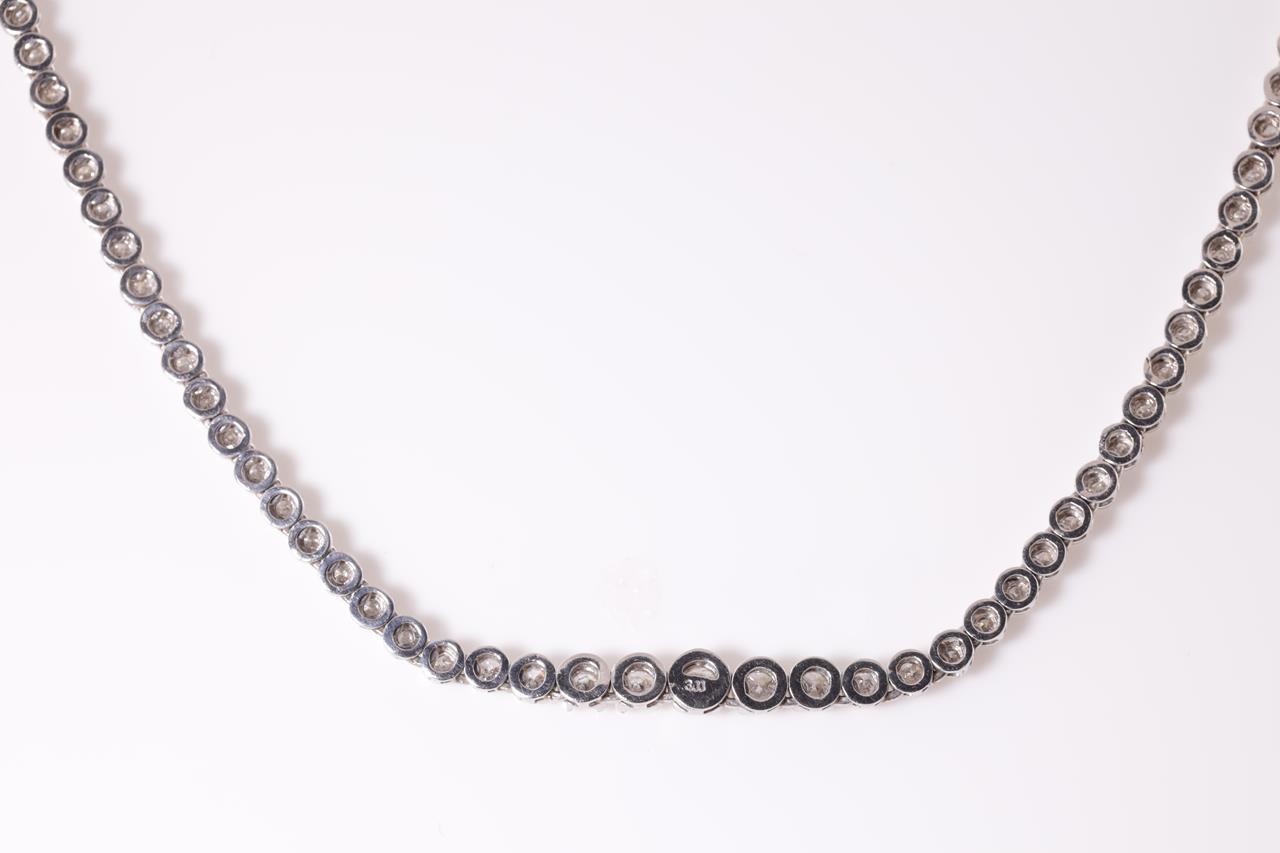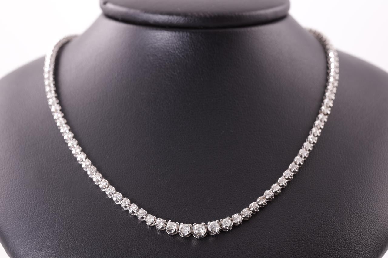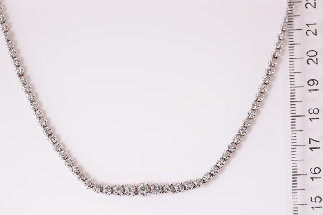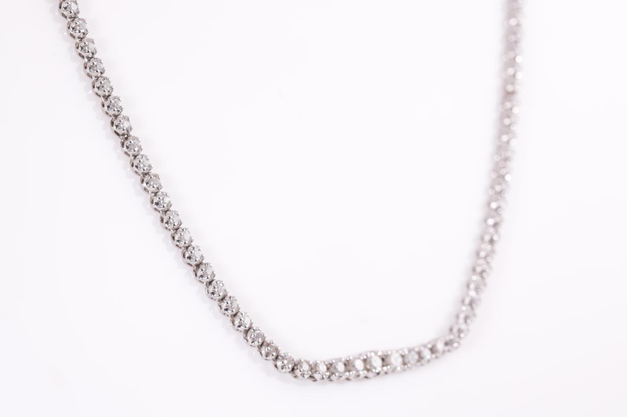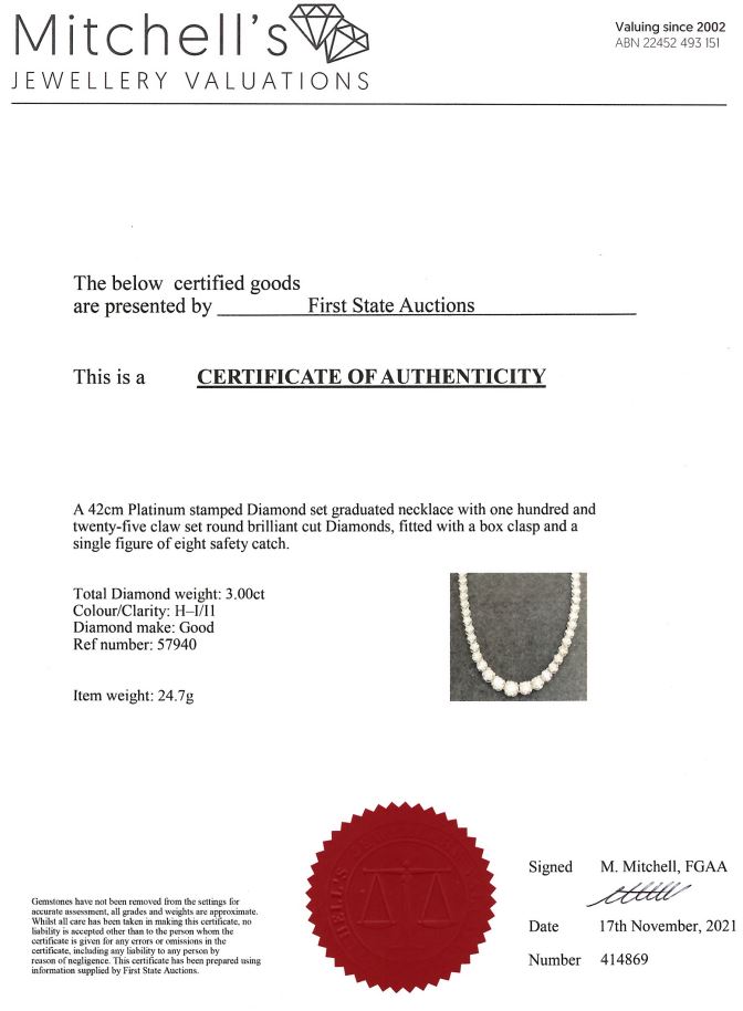Diamond tennis necklace with 125 round Diamonds totalling 3.00cts (Estimated grading: H-I P1). Platinum. Length: 42cm. Weight: 24.7g. With certificate #414869. (Pre-owned)