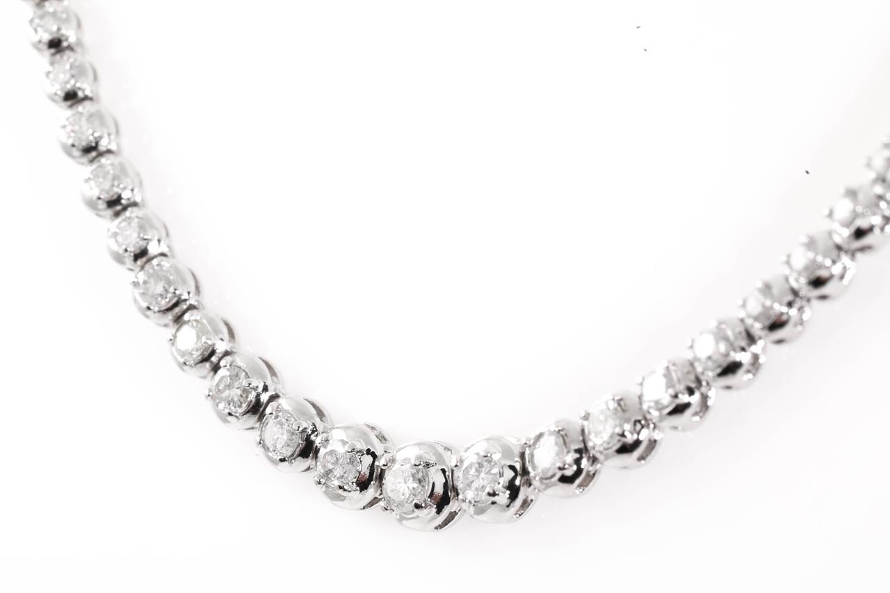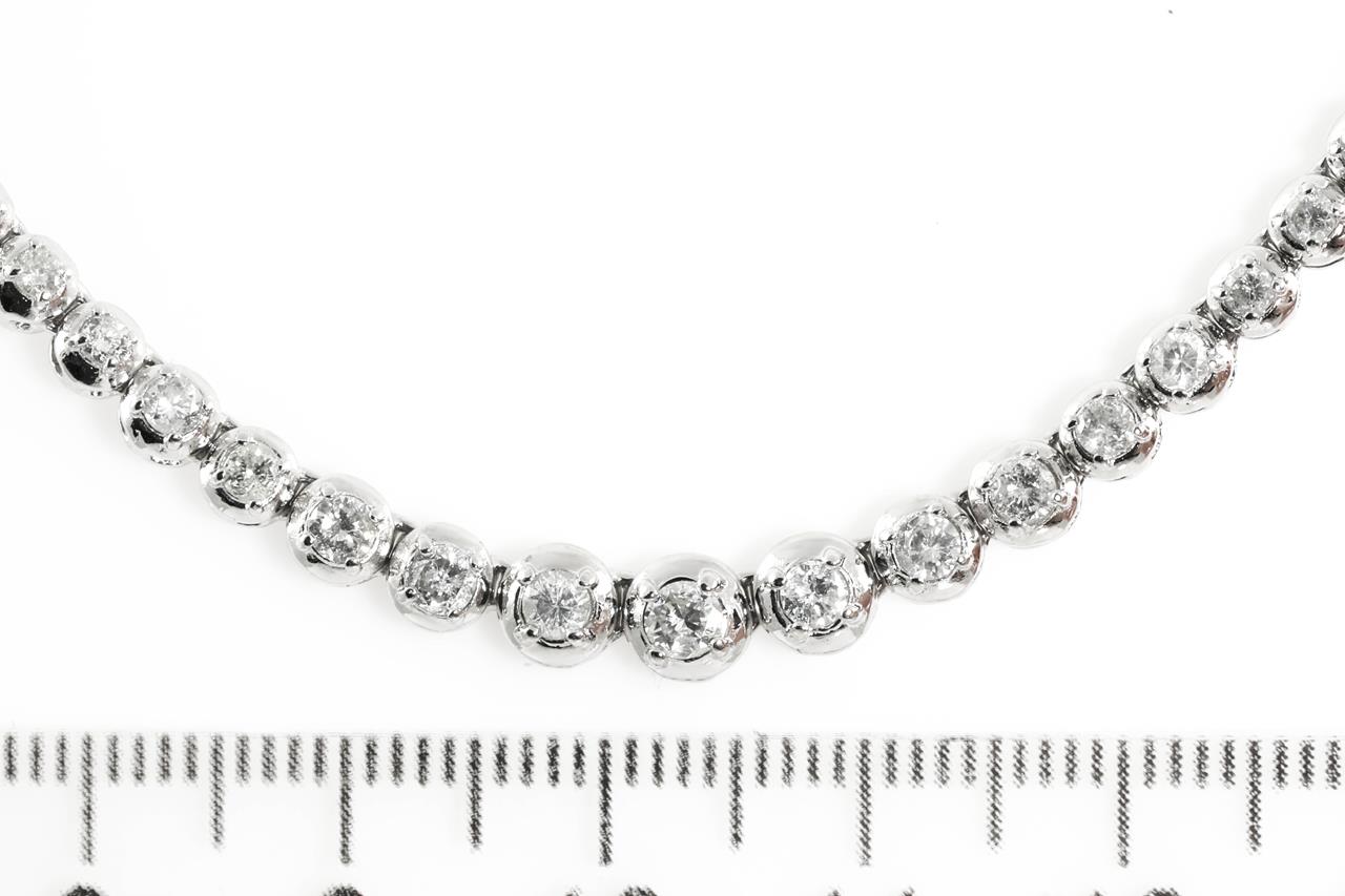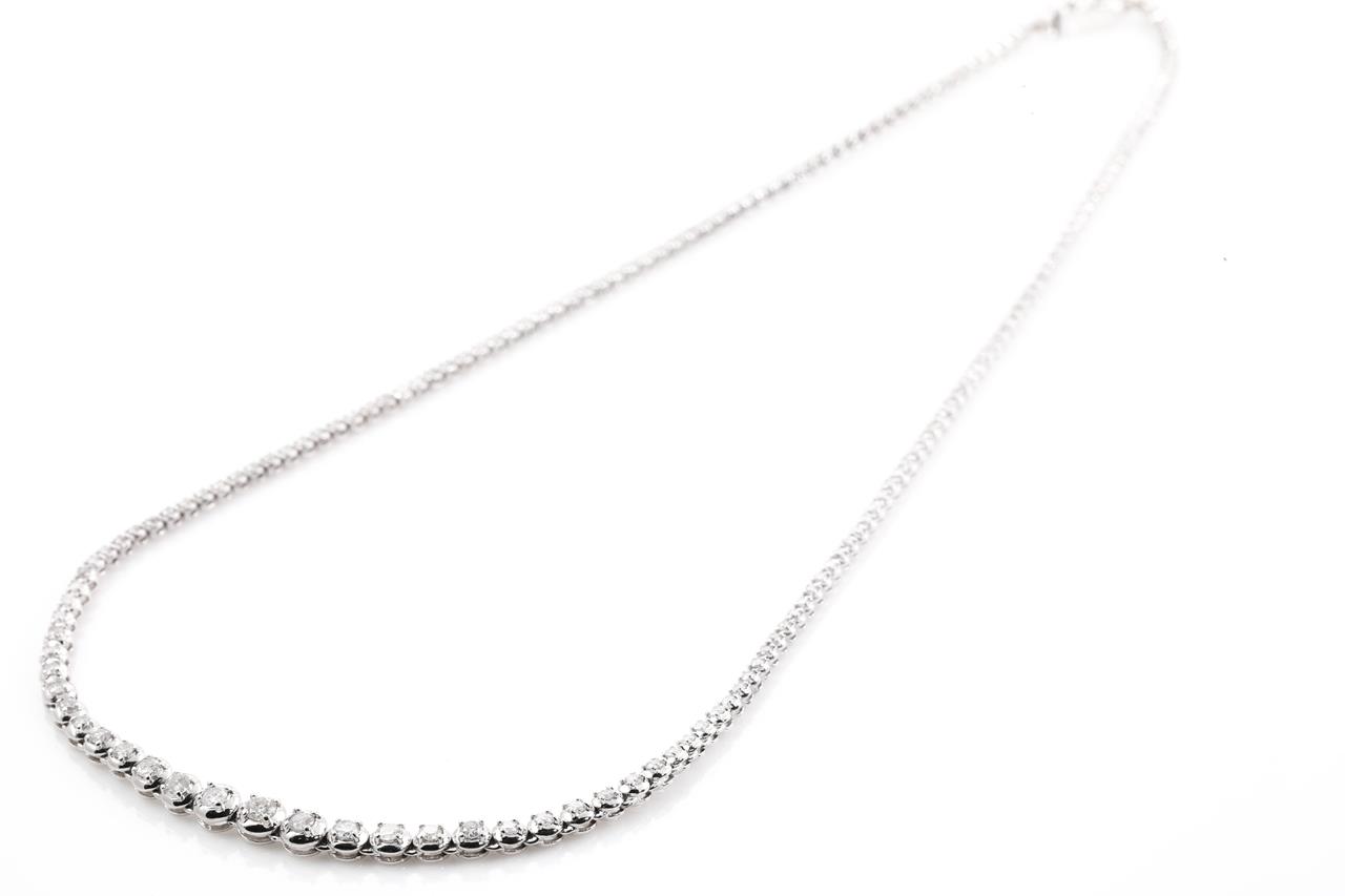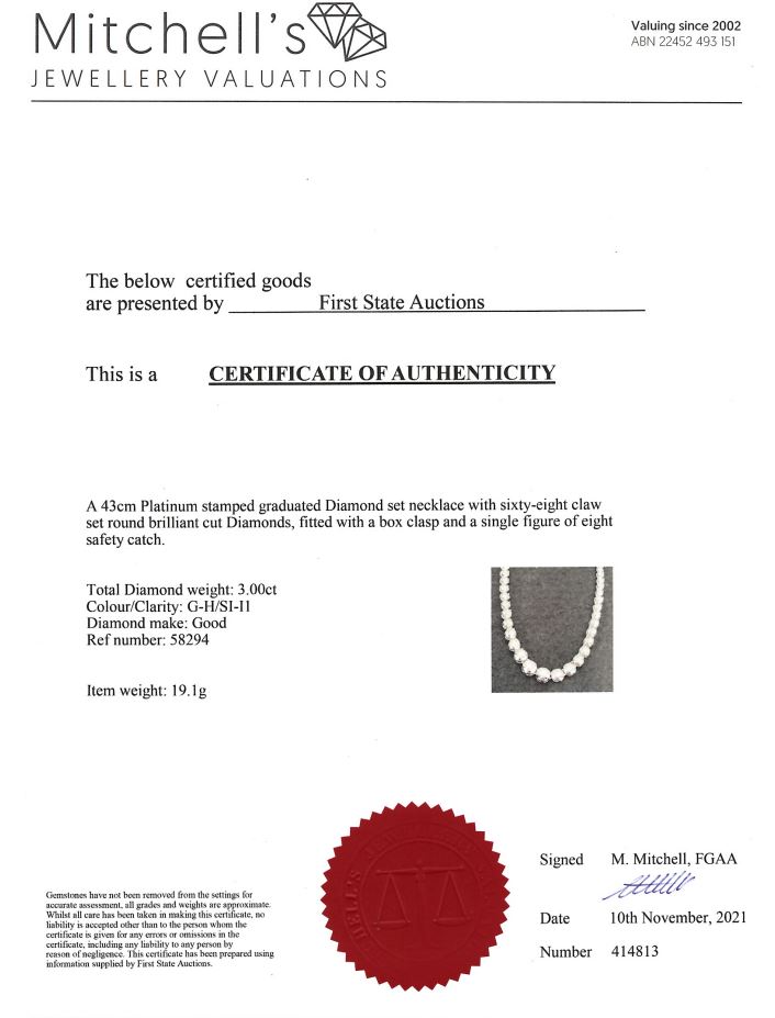 Diamond tennis necklace with 68 round Diamonds totalling 3.00cts (Estimated grading: G-H SI-P1). Platinum. Length: 43cm. Weight: 19.1g. With certificate #TBA. (Pre-owned)