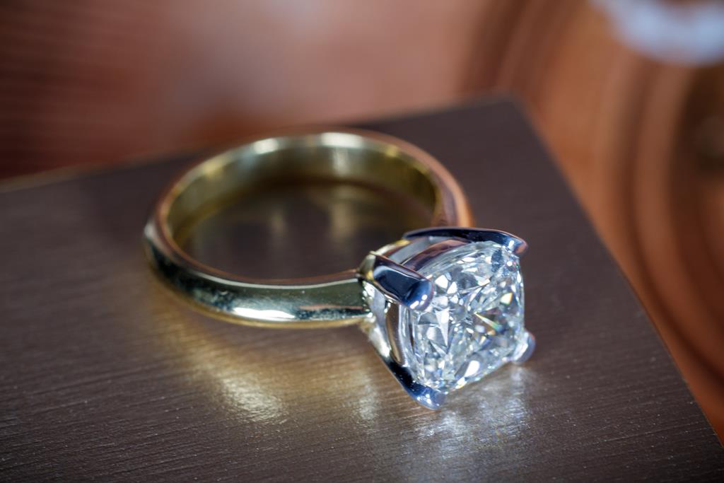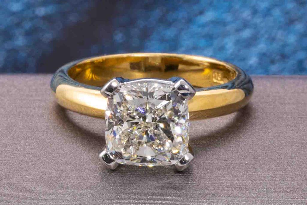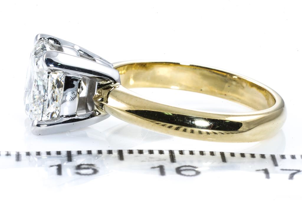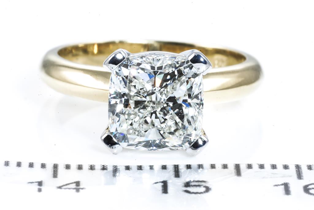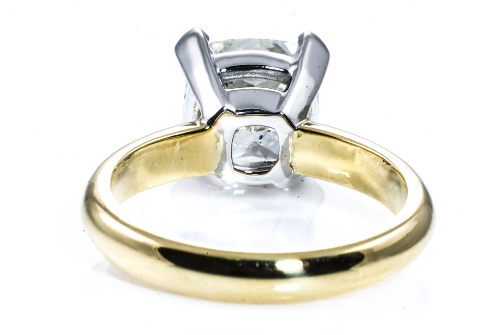 Diamond solitaire ring with a centre cushion cut Diamond of 3.00ct (with GIA report graded as J SI2 #6415999583). 18ct white and yellow gold. Ring size K1/2. Weight: 6g. (New)