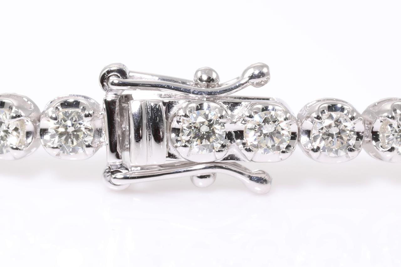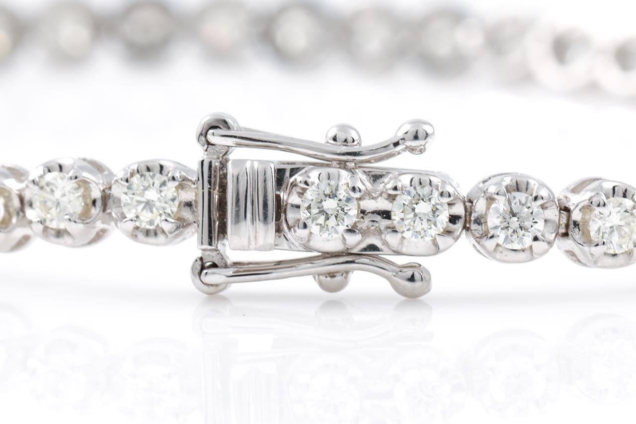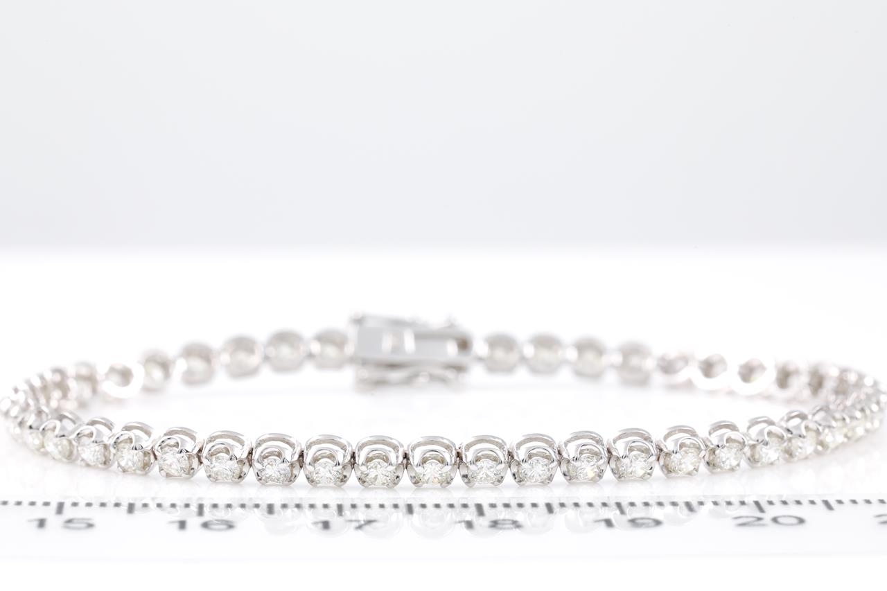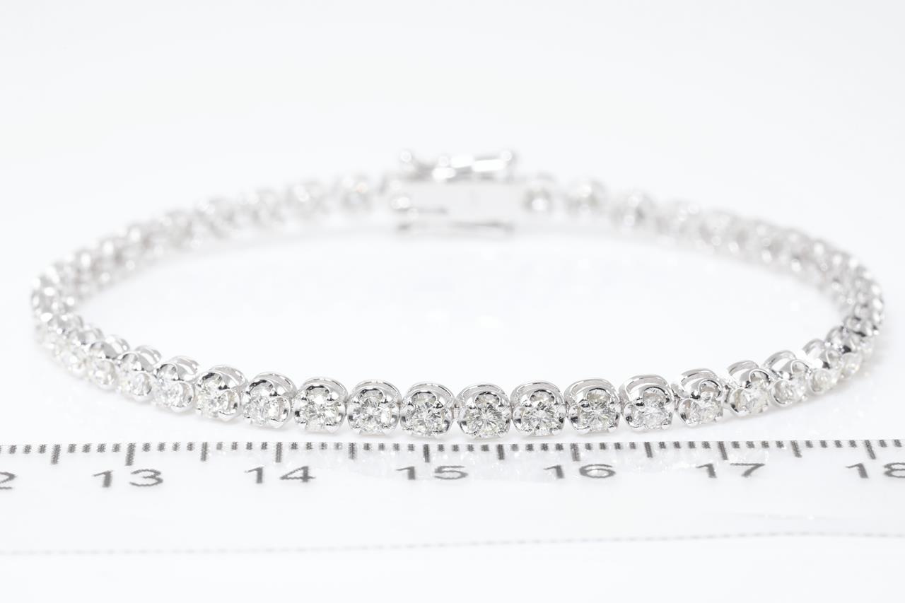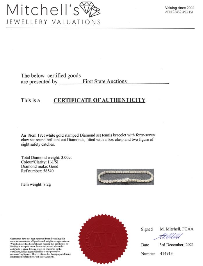 Diamond tennis bracelet with 47 round Diamonds totalling 3.00cts (Estimated grading: H-I SI). 18ct white gold. Length: 18cm. Weight: 8.2g. With certificate #414913. (New)